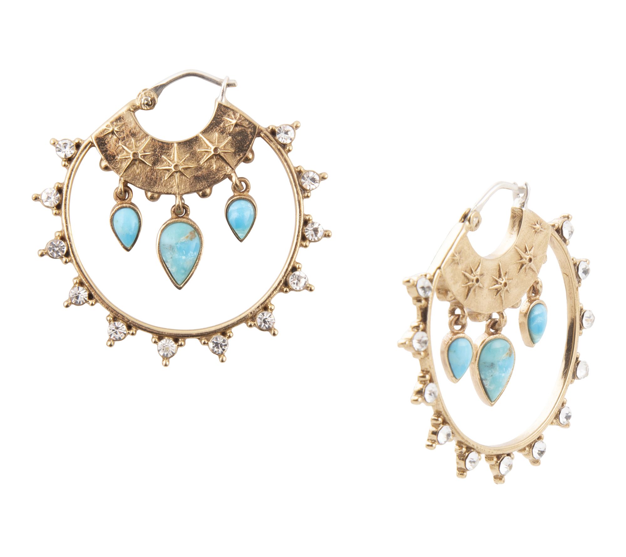 Adorned with turquoise and sparkling cubic zirconia, these celestial artisan-crafted hoop earrings make a meaningful gift for the star of your universe. From Barse.