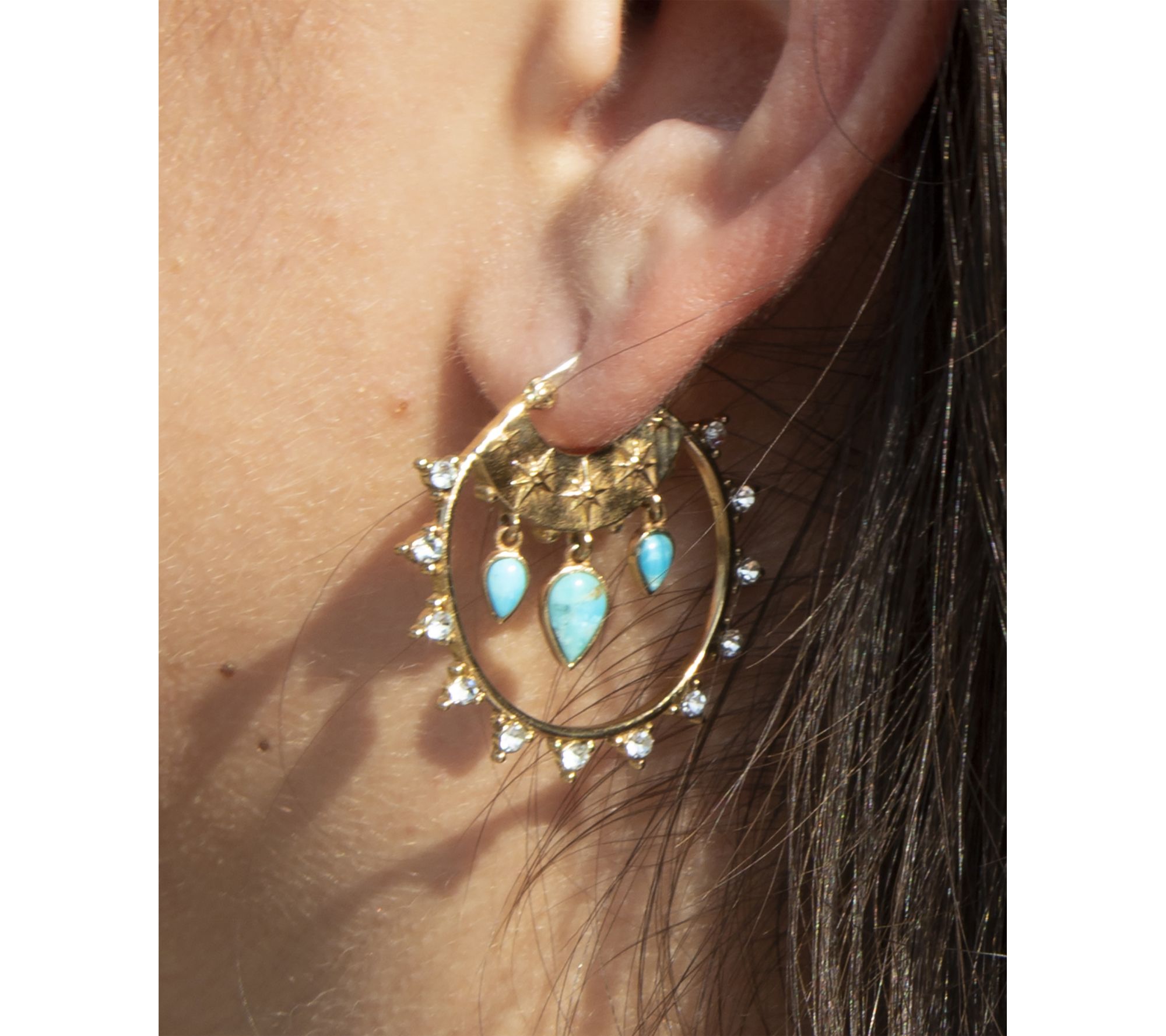 • Hoop design encircled by round, bezel-set cubic zirconia; star motifs; three inverted teardrop-shaped, bezel-set turquoise gemstones