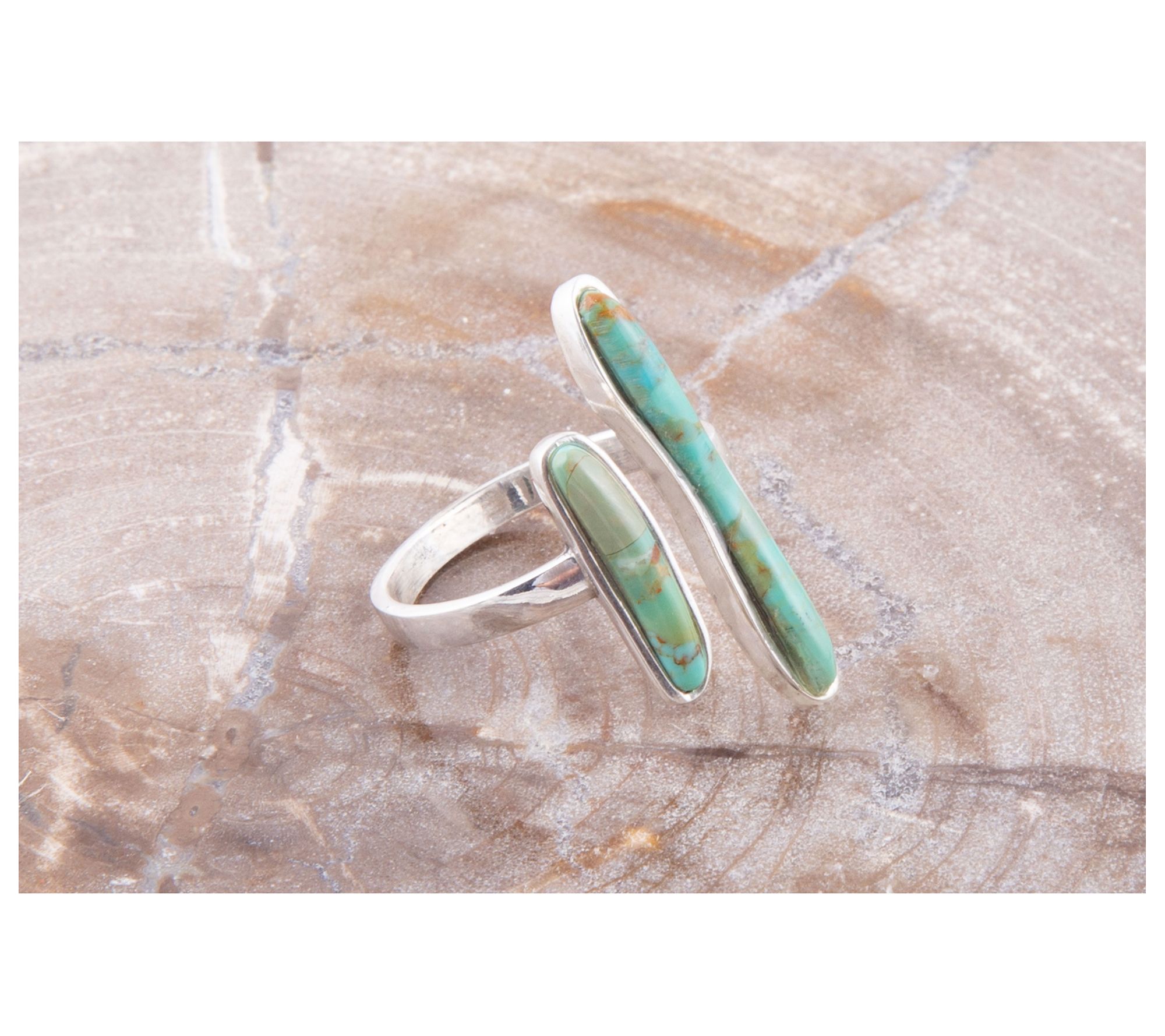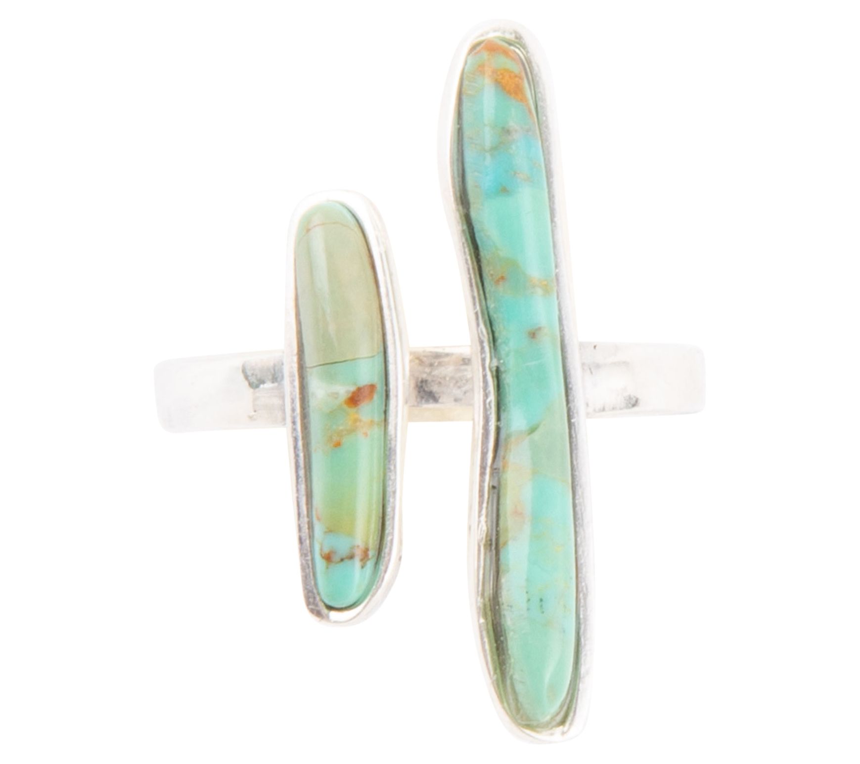 Make your motions memorable with the vibrance of this modern cuff ring lavishly accented with a pair of asymmetrically shaped composite turquoise stones. From Barse Jewelry.
