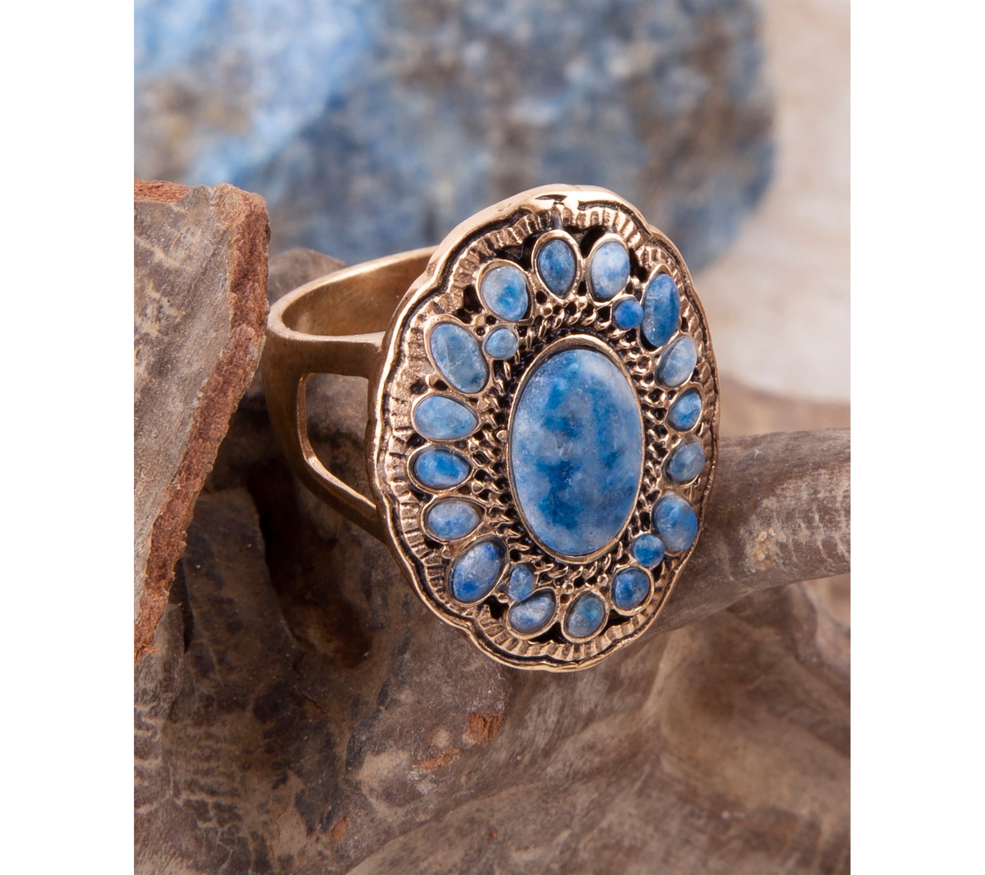 Add a touch of color to any ensemble with this cocktail ring, featuring a cluster of denim blue lapis stones set in golden bronze. Let the vibrant hues and high polish finish catch the light as you showcase this design at brunch or during a night out with friends. From Barse Jewelry.