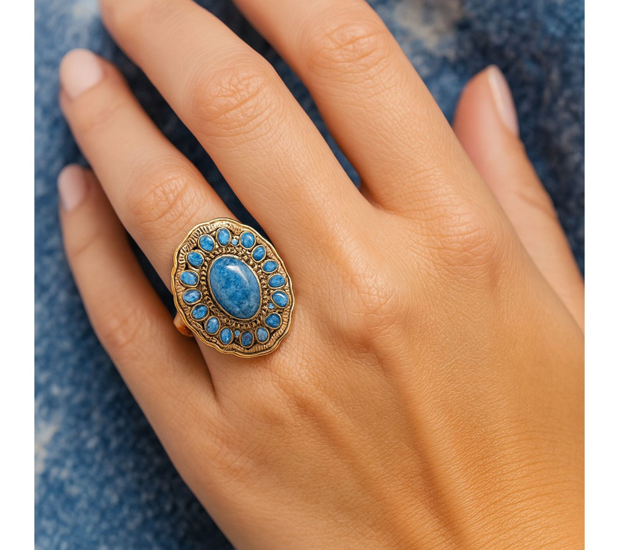 Multiple small oval and round bezel-set blue lapis stones surrounding a larger oval lapis center; high polish