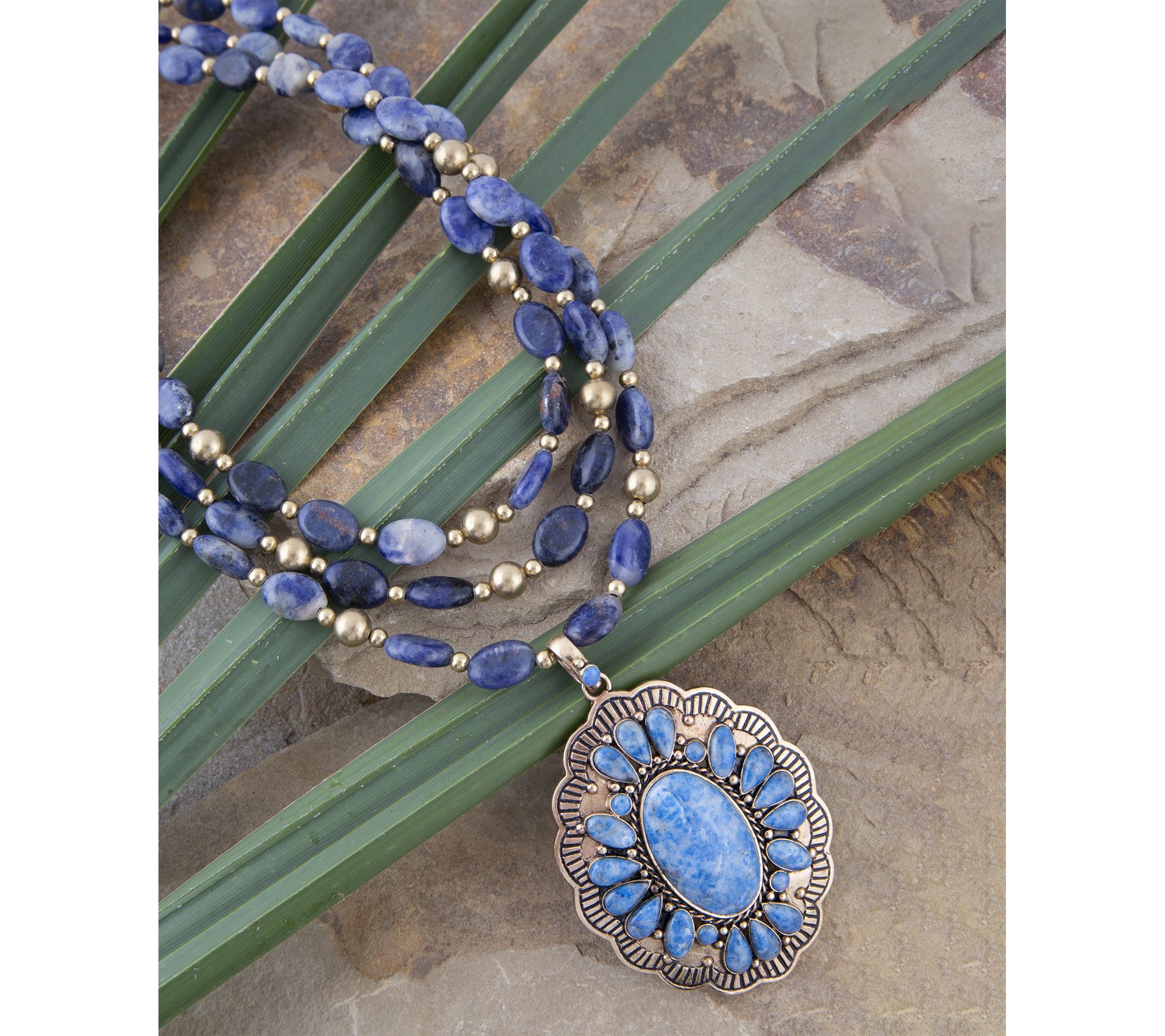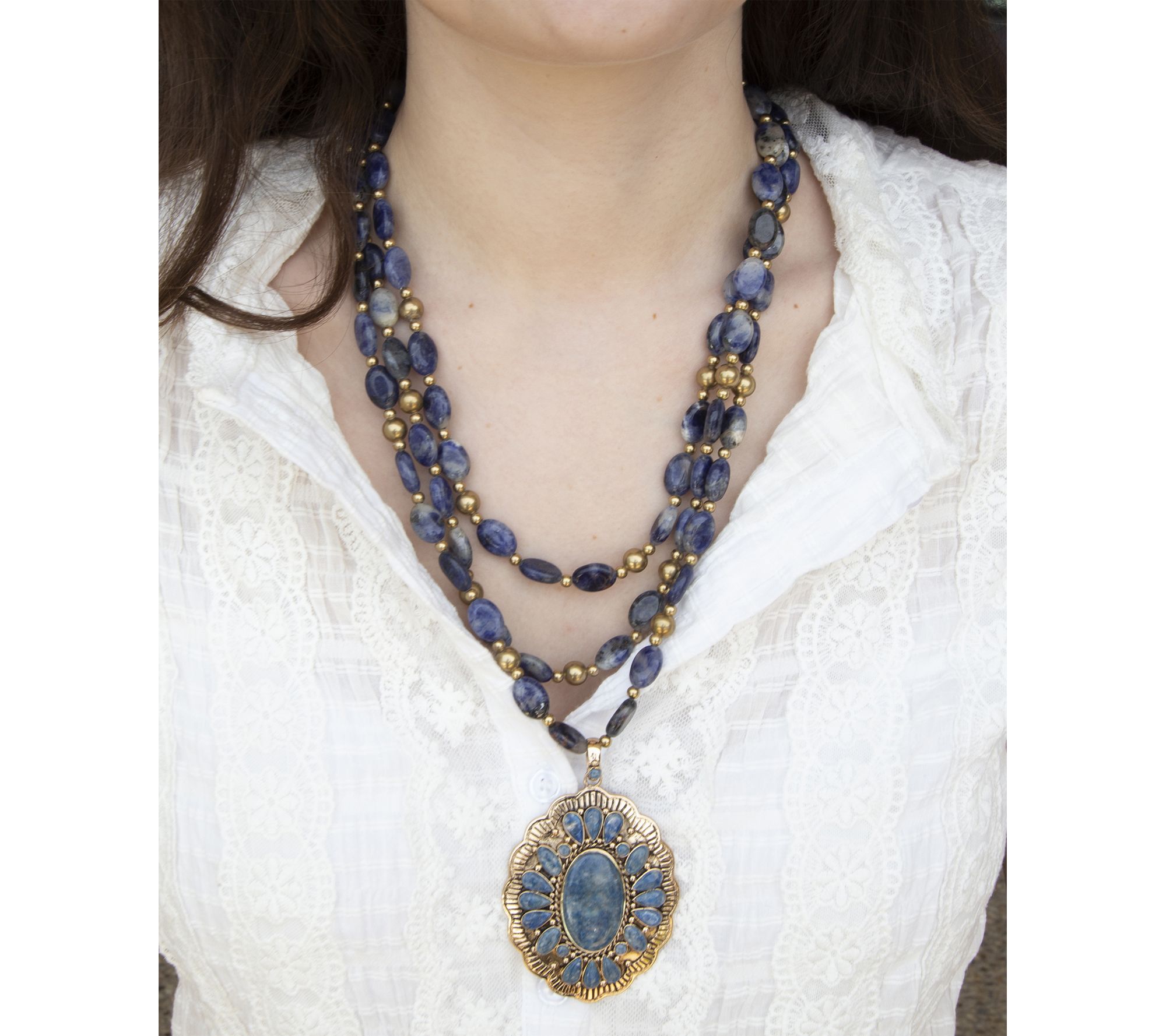 Oval and round lapis gemstones; freeform traditional pendant; halo style; bezel set; gold bronze accents; high polished detail