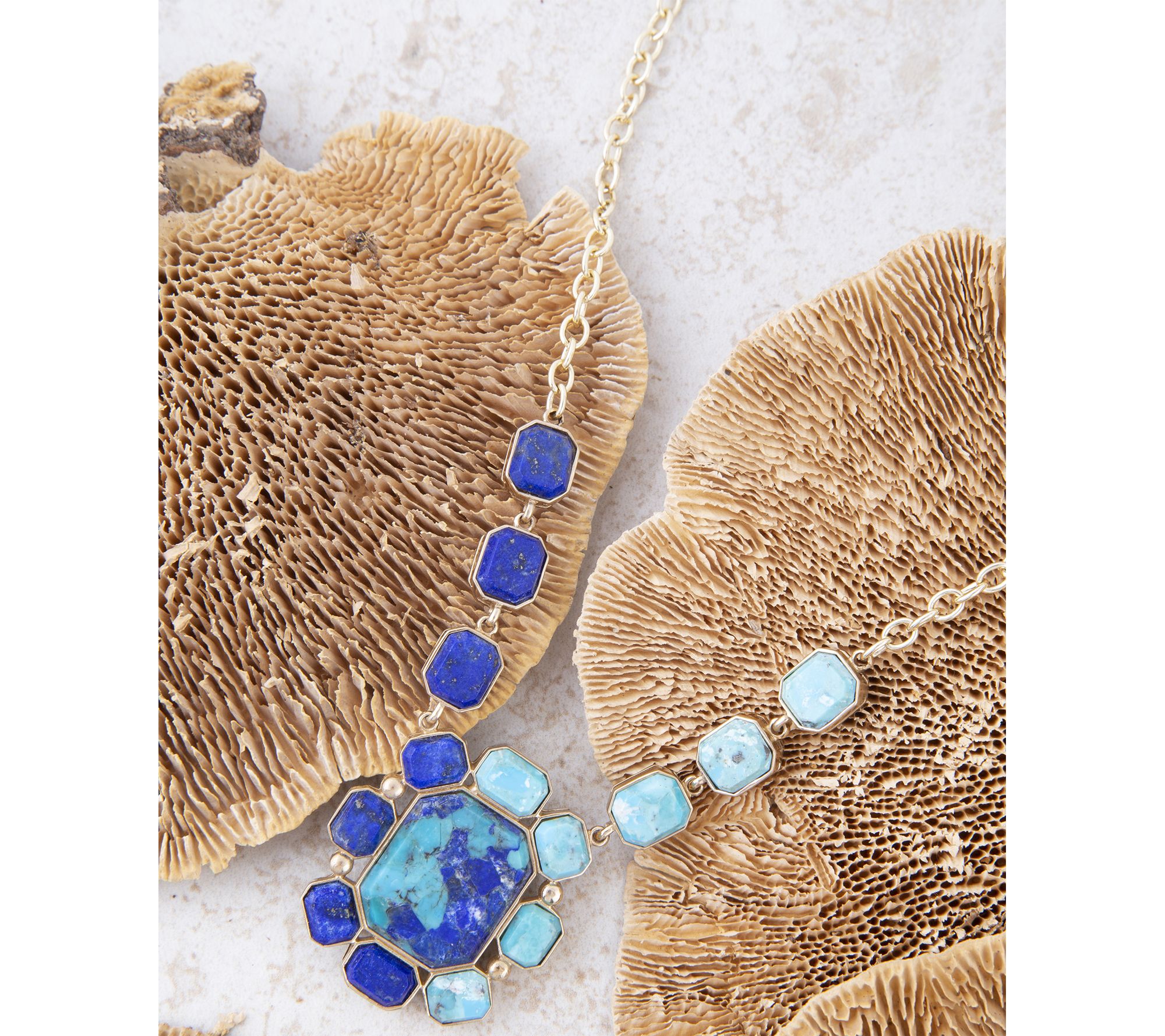 • Square-cut, bezel-set blue turquoise and blue lapis gemstones; link chain