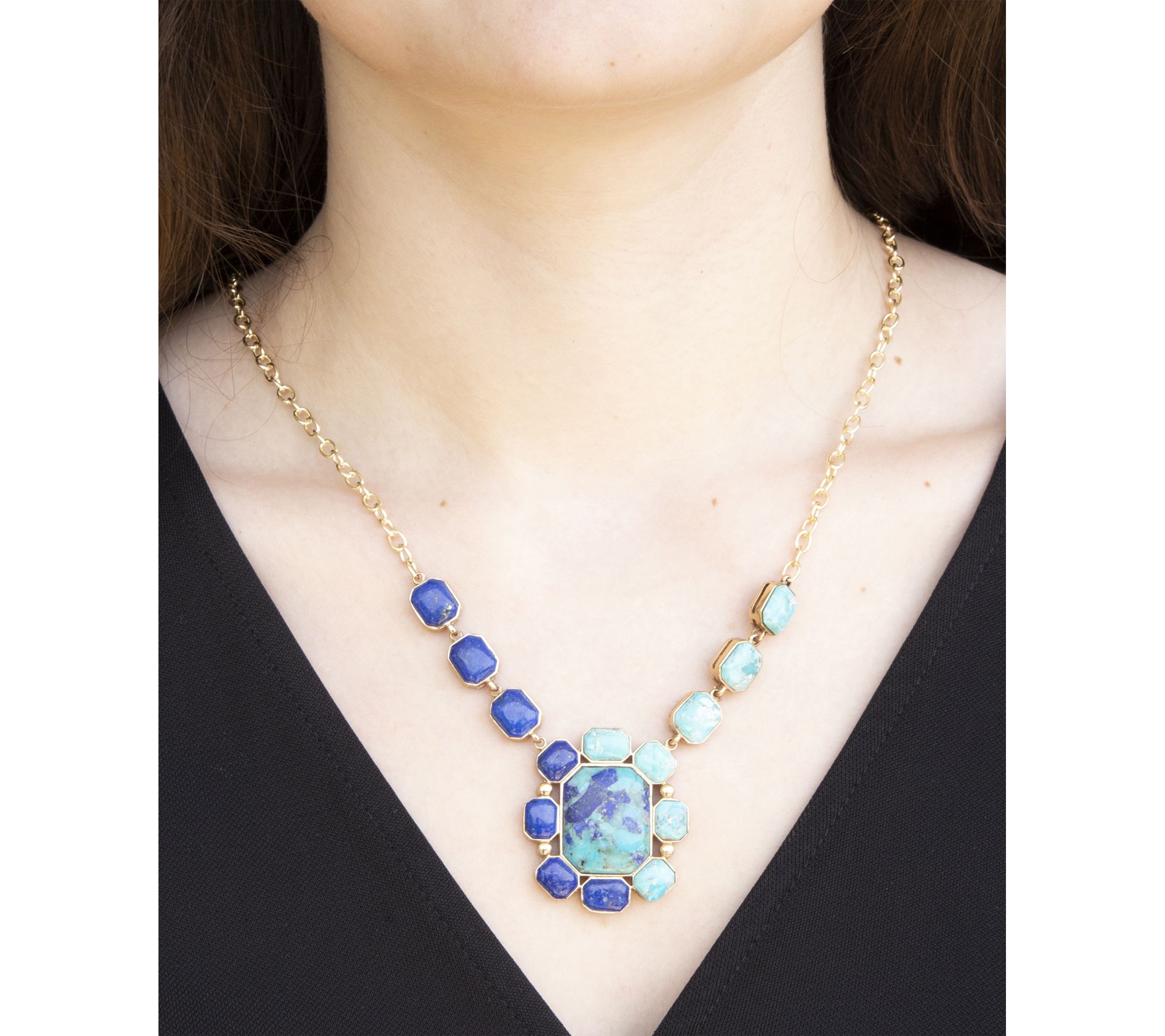 Luxurious shades of blue are front and center on this station necklace -- turquoise and lapis gemstones are expertly cut and bezel-set for artisan flair. Whether you're dressing up for dinner or adding a colorful accent to a casual afternoon, the golden bronze chain brings warmth and elegance to every look. From Barse.