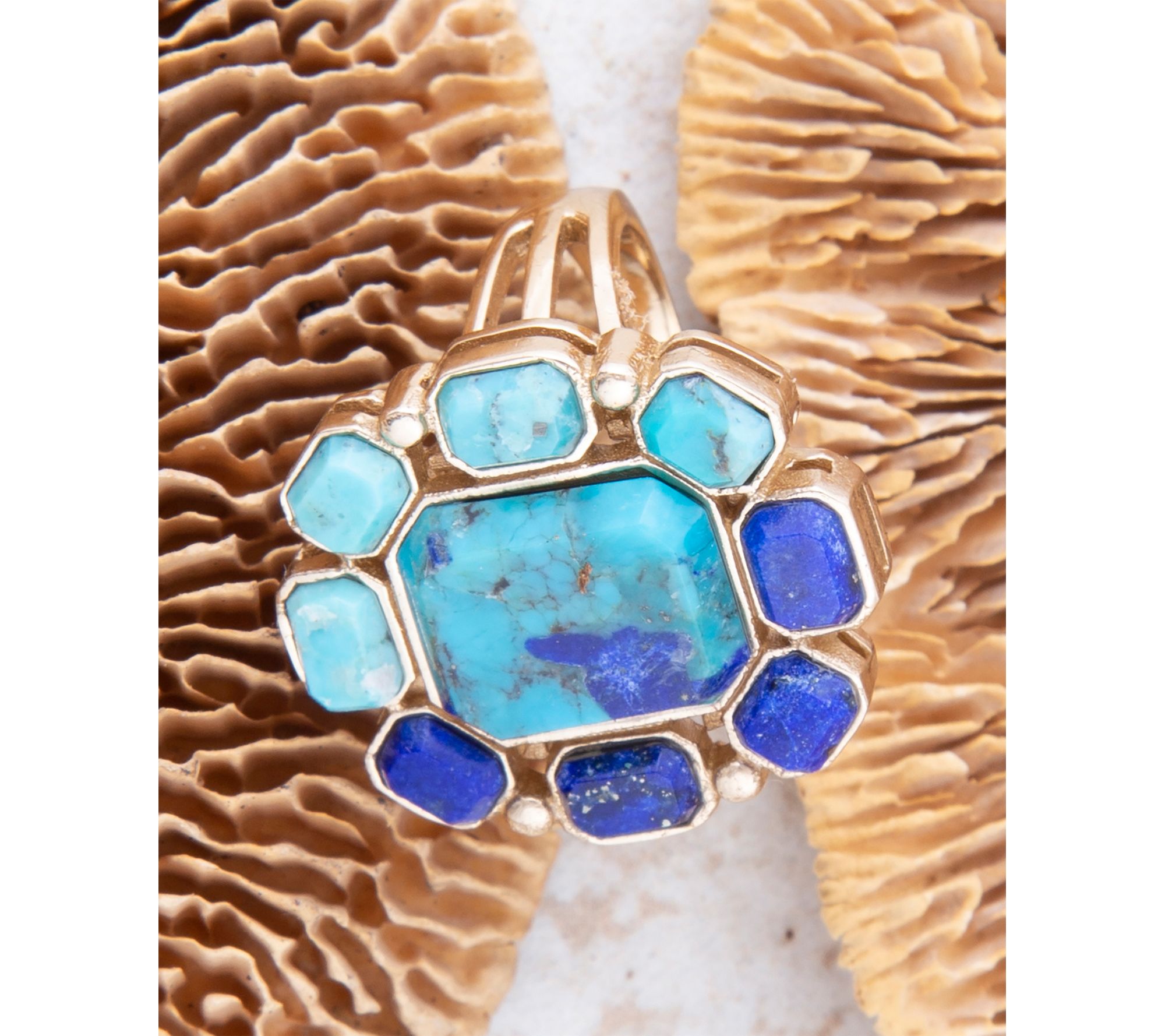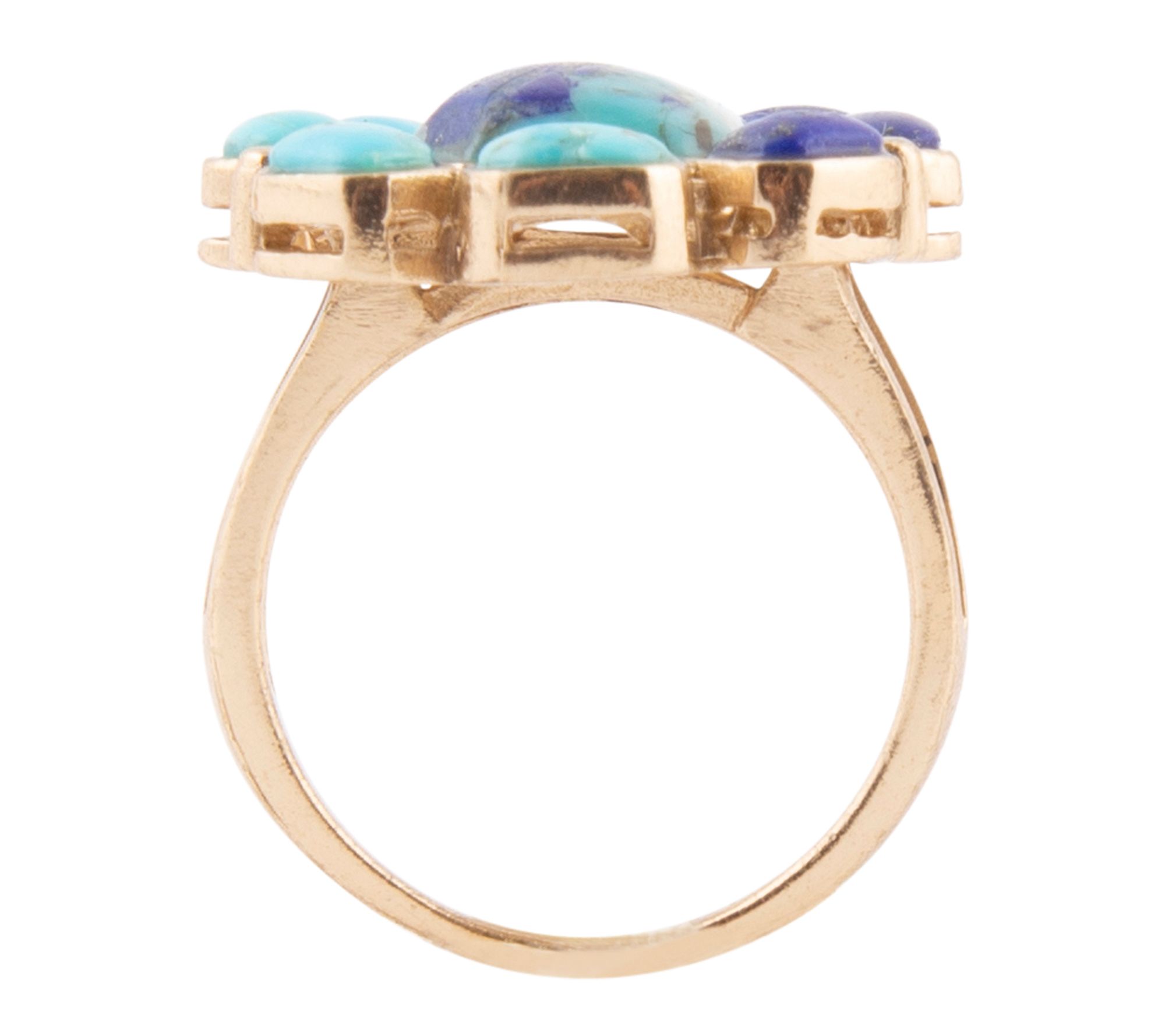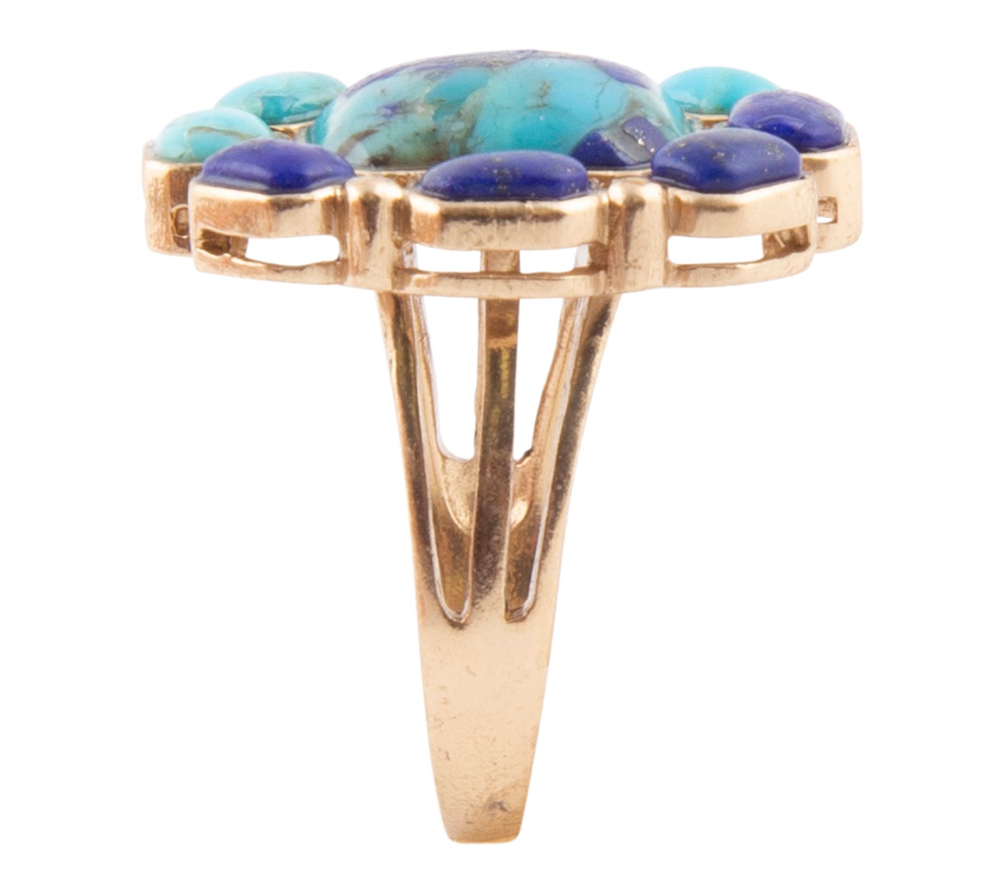 Features blue lapis and turquoise stones; bezel set