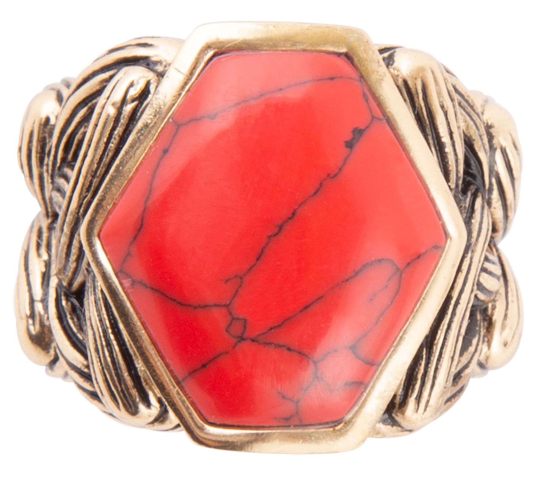 When your outfit is a carefully curated work of art, match it with a masterpiece in the form of this artisan crafted ring boasting an intricate bronze design and a bold dyed red howlite hexagon. From Barse Jewelry.