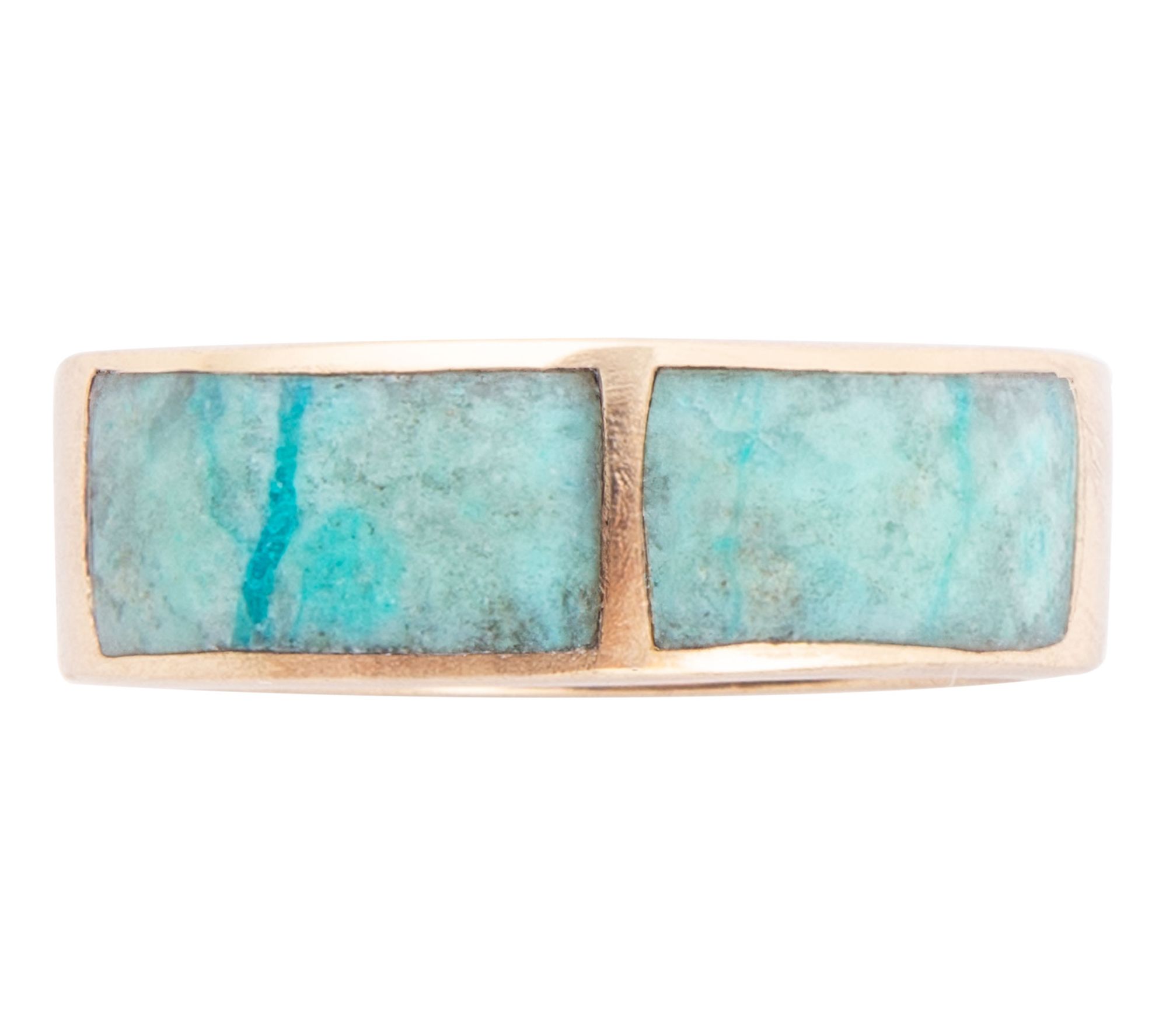 Bezel set; two rectangular chrysocolla stones; high polish detail