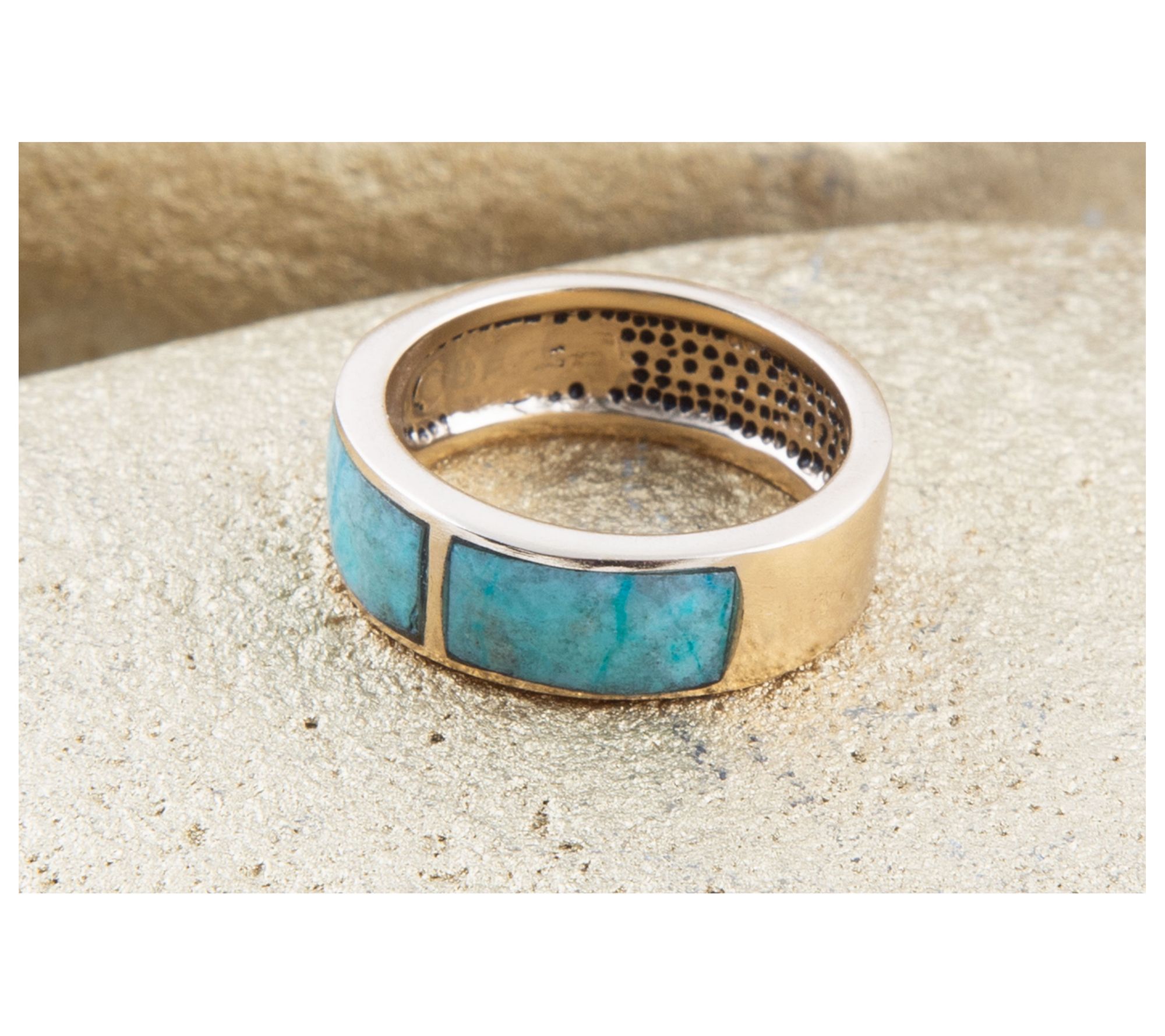 Add a touch of artisanal elegance to your jewelry collection with the Barse artisan crafted inlay blue chrysocolla golden ring. This stunning piece features two unique rectangular chrysocolla stones, with a high polish detail that adds an extra layer of sophistication to this already beautiful ring. From Barse Jewelry.