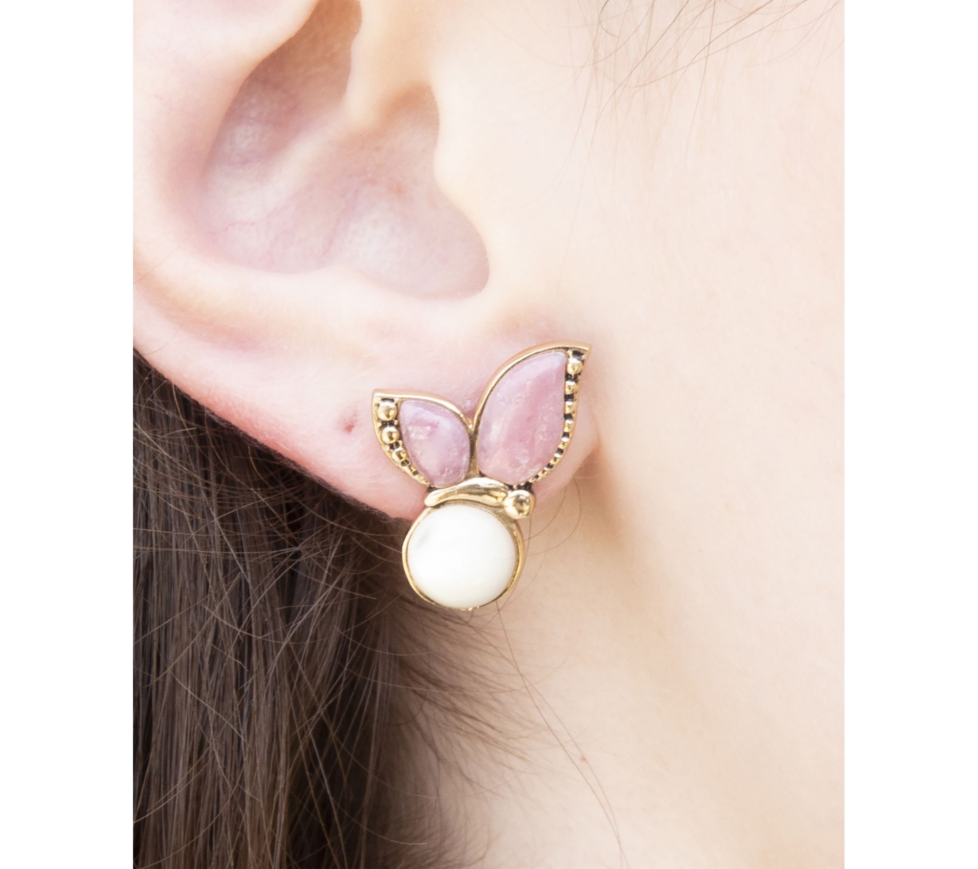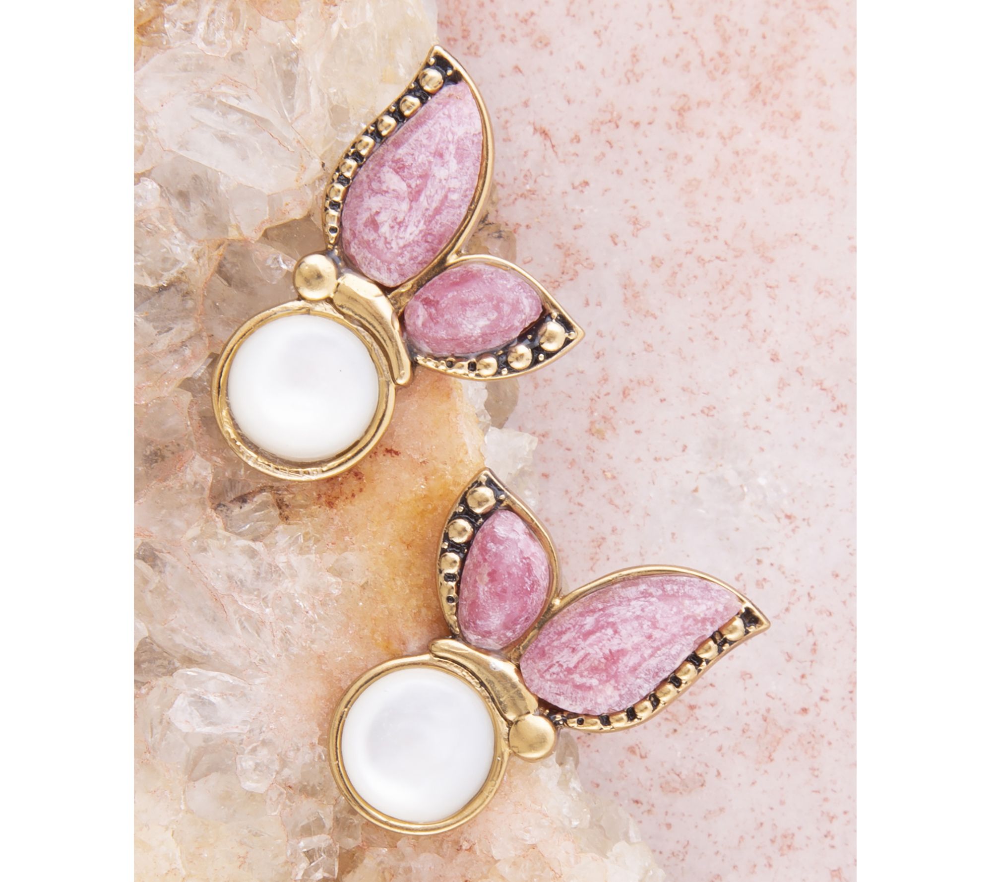 Add a whimsical accent to any outfit with these butterfly earrings, featuring the shimmer of white mother-of-pearl and the warmth of pink rhodonite set in goldtone bronze. Whether you're dressing up for brunch with friends or adding color to your every day, these artisan-crafted beauties offer a lovely pop of personality. From Barse.