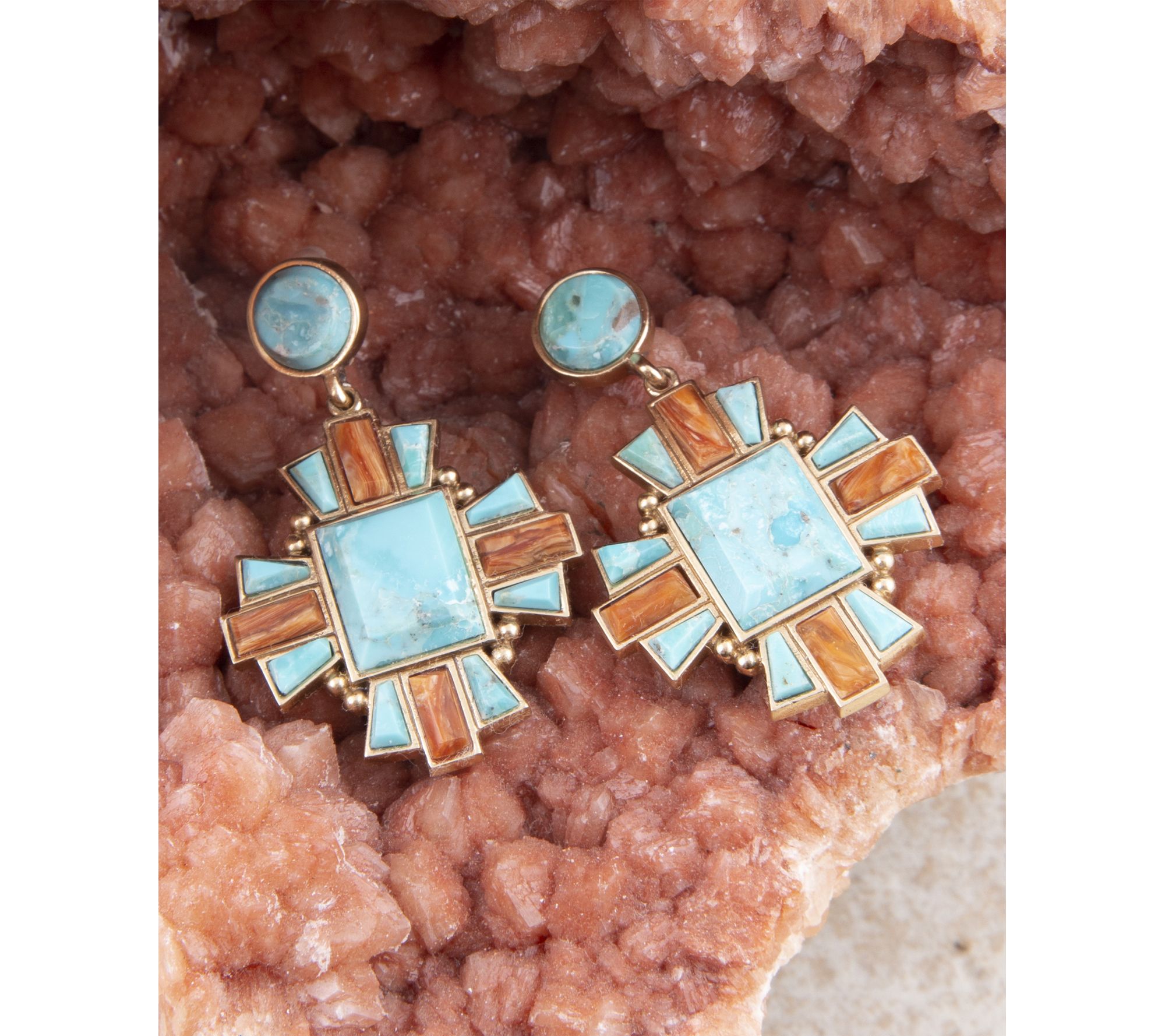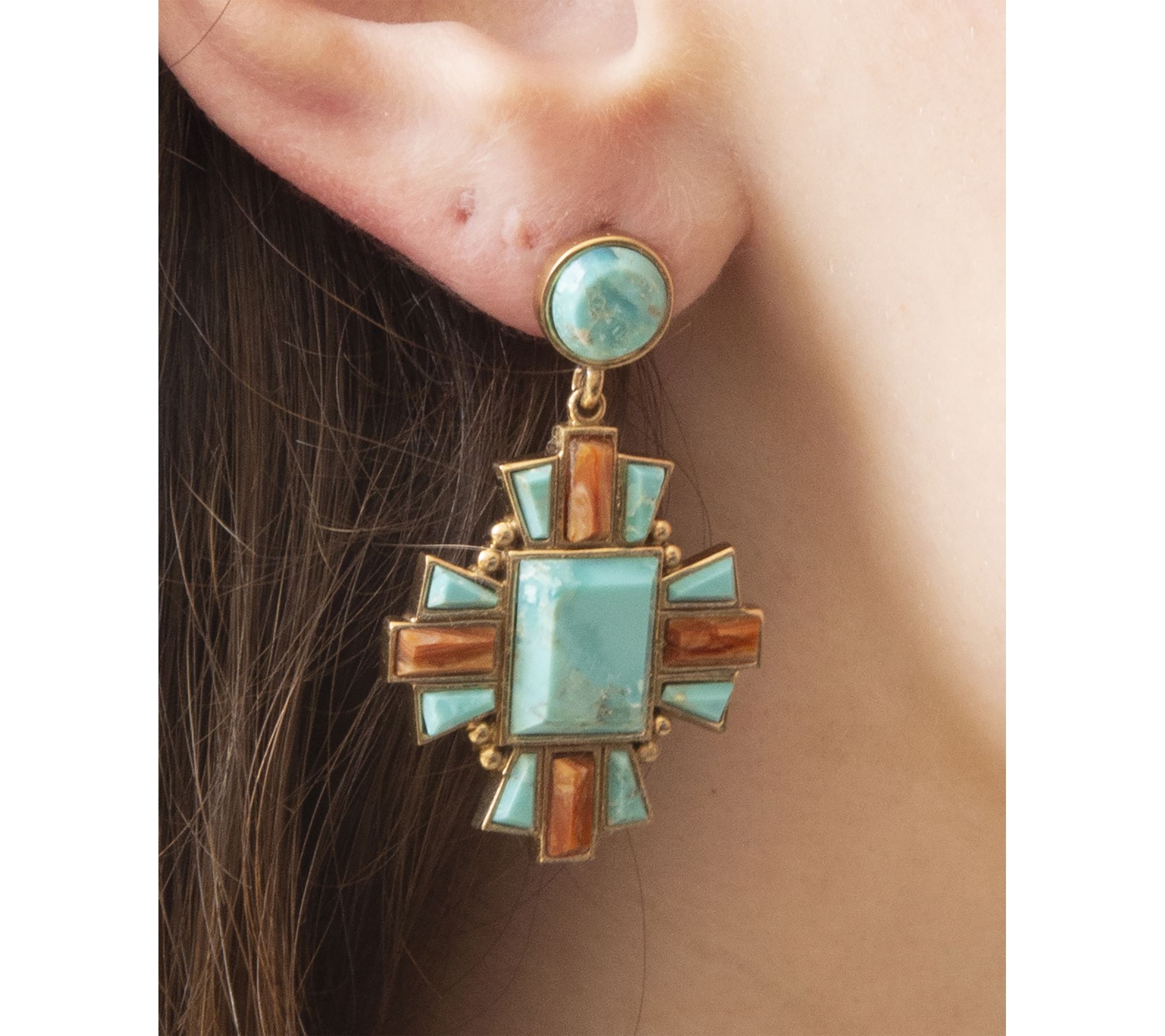 Brighten up your look with these artisan-crafted dangle earrings -- blue turquoise, orange sponge coral, and copper-colored opal gemstones are set in goldtone bronze, forming a striking cross pattern. Whether you're headed to an art festival or enjoying brunch outside, these vibrant earrings add a playful pop of color and Southwestern flair to any outfit. From Barse.