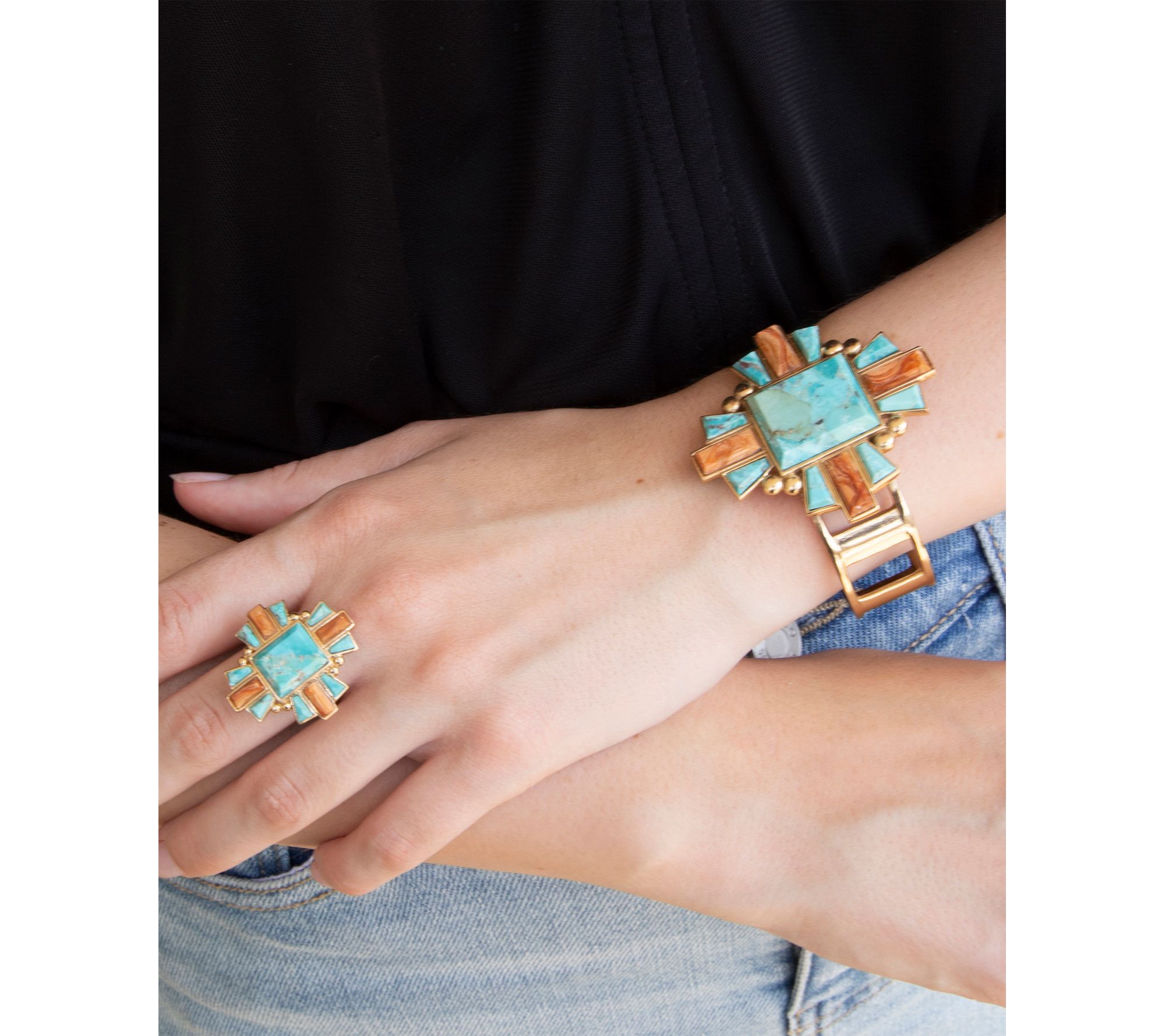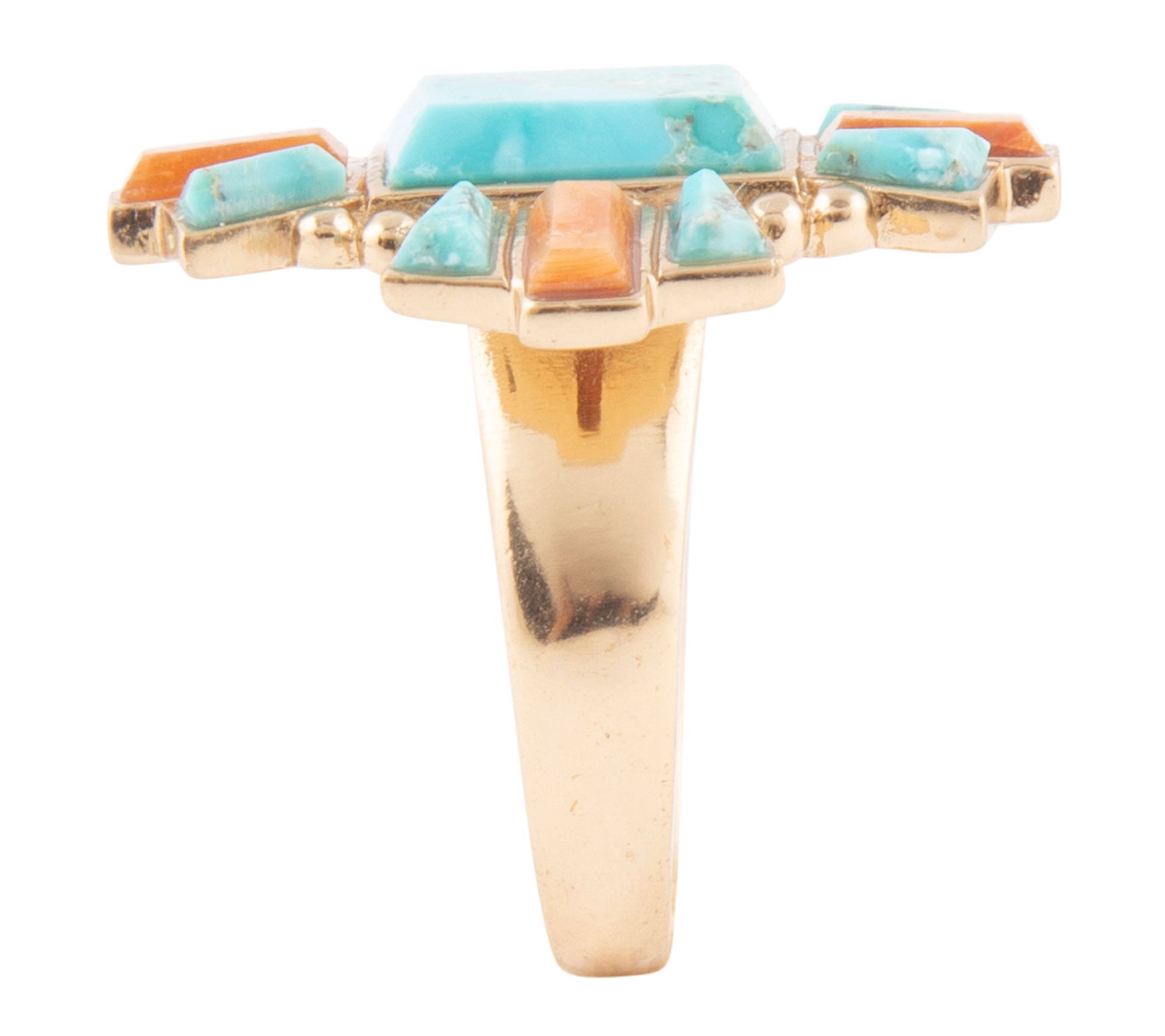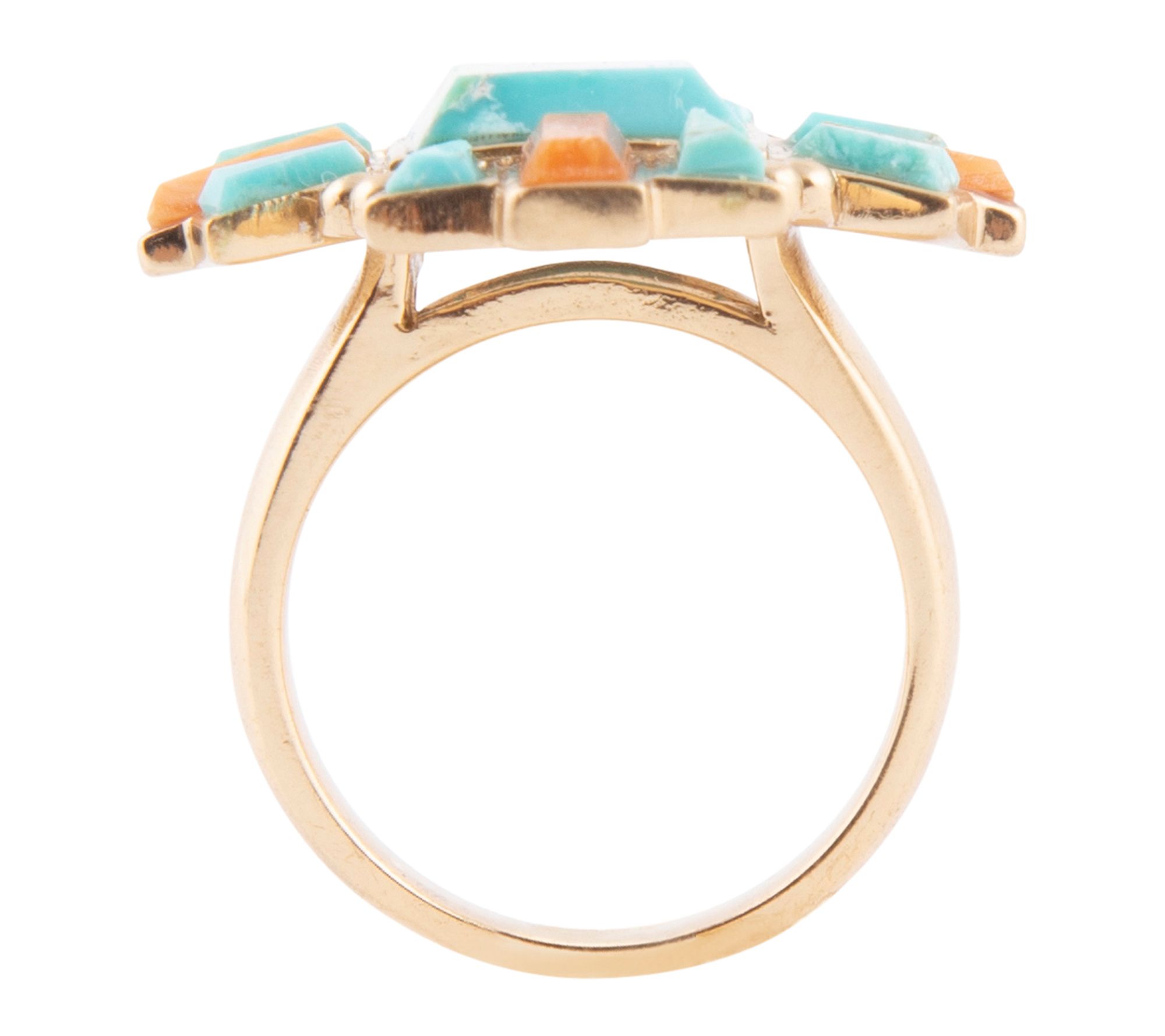 Slip this vibrant ring onto your finger and instantly add a touch of Southwestern artistry to your style. The striking cross pattern of turquoise, shimmering opal, and coral stones paired with gleaming bronze invites compliments whether you're dressing up denim or adding flair to an evening ensemble. From Barse.