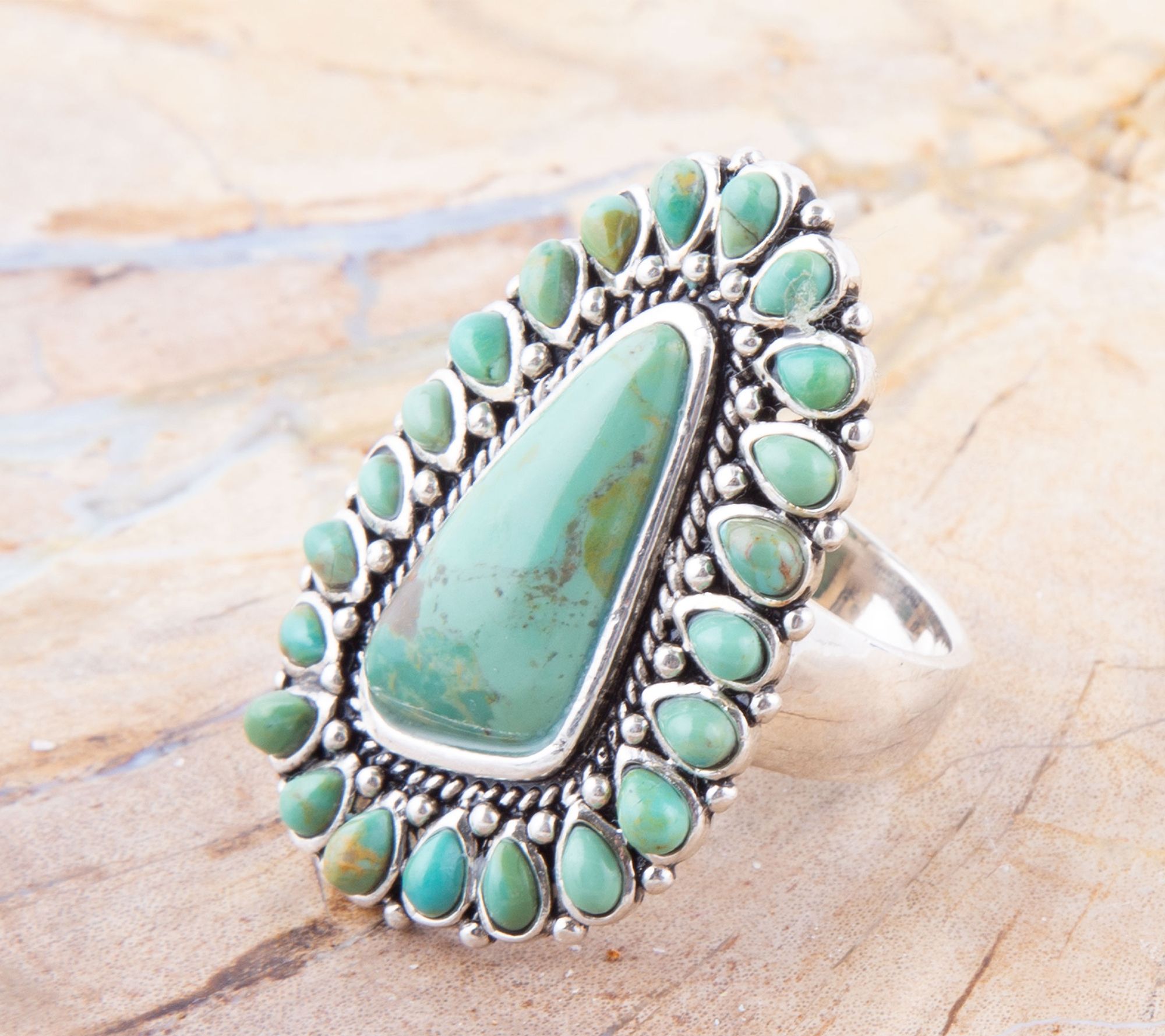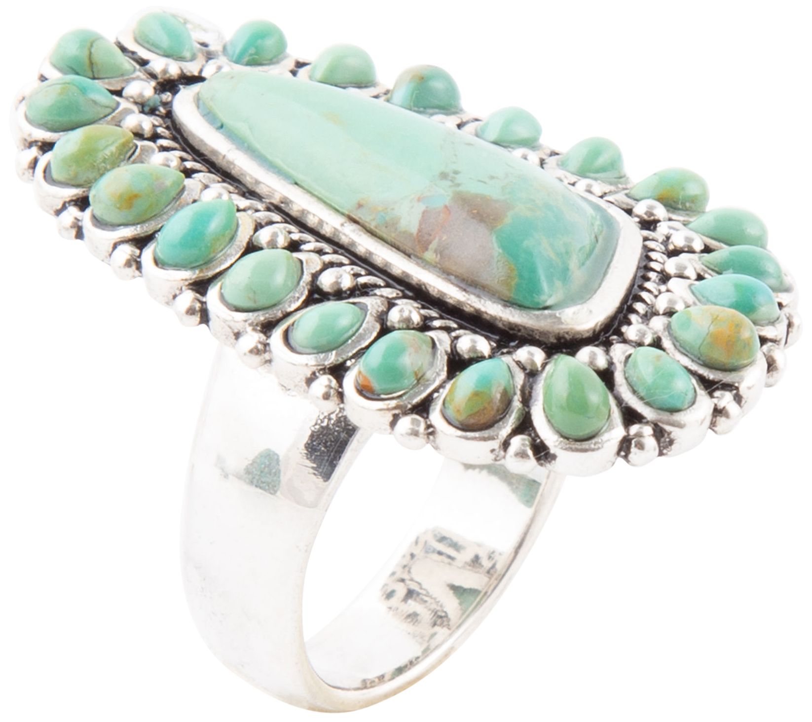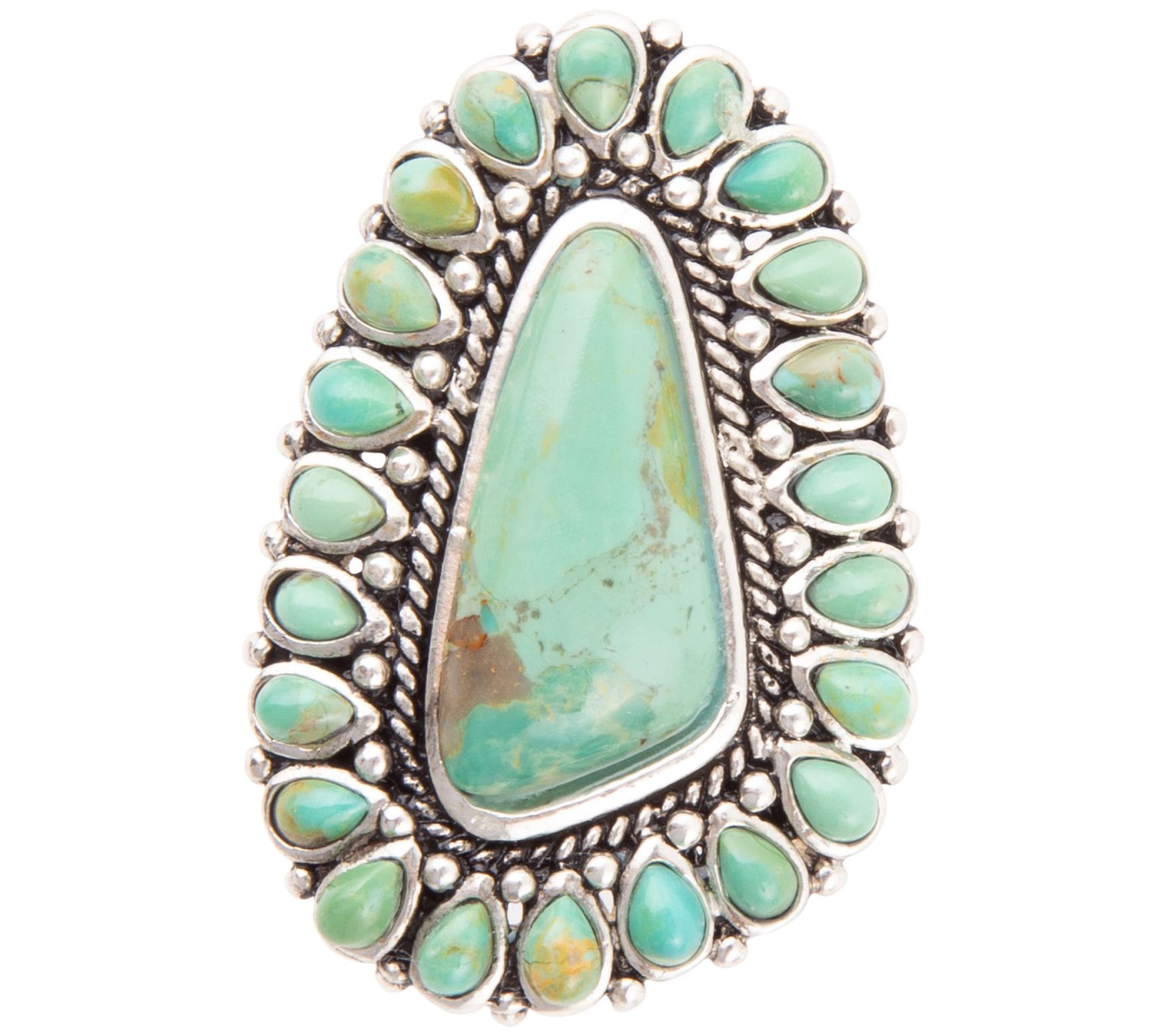Abstract-shaped bezel-set composite turquoise stone surrounded by smaller teardrop-shaped bezel-set turquoise stones; hammered detail