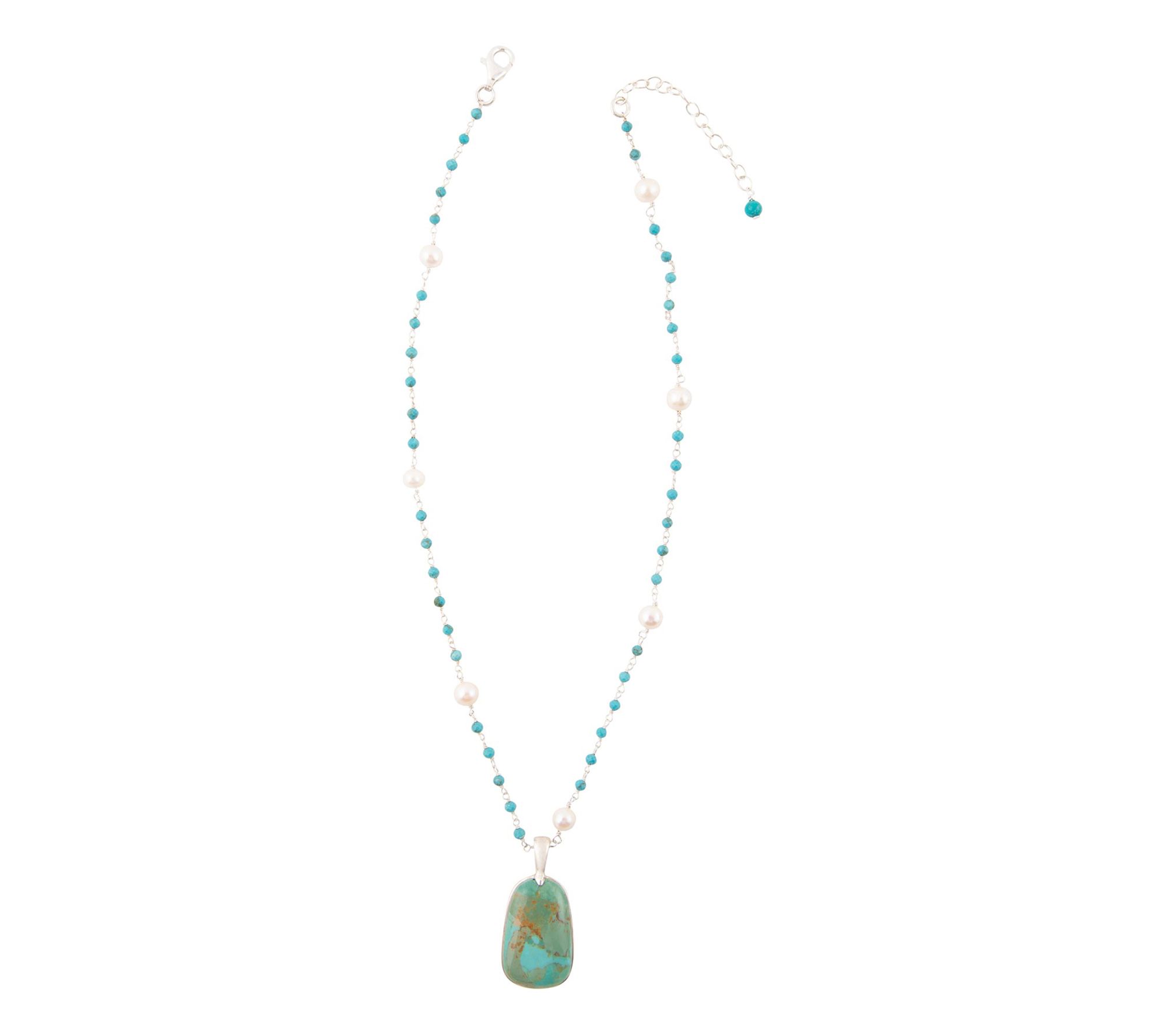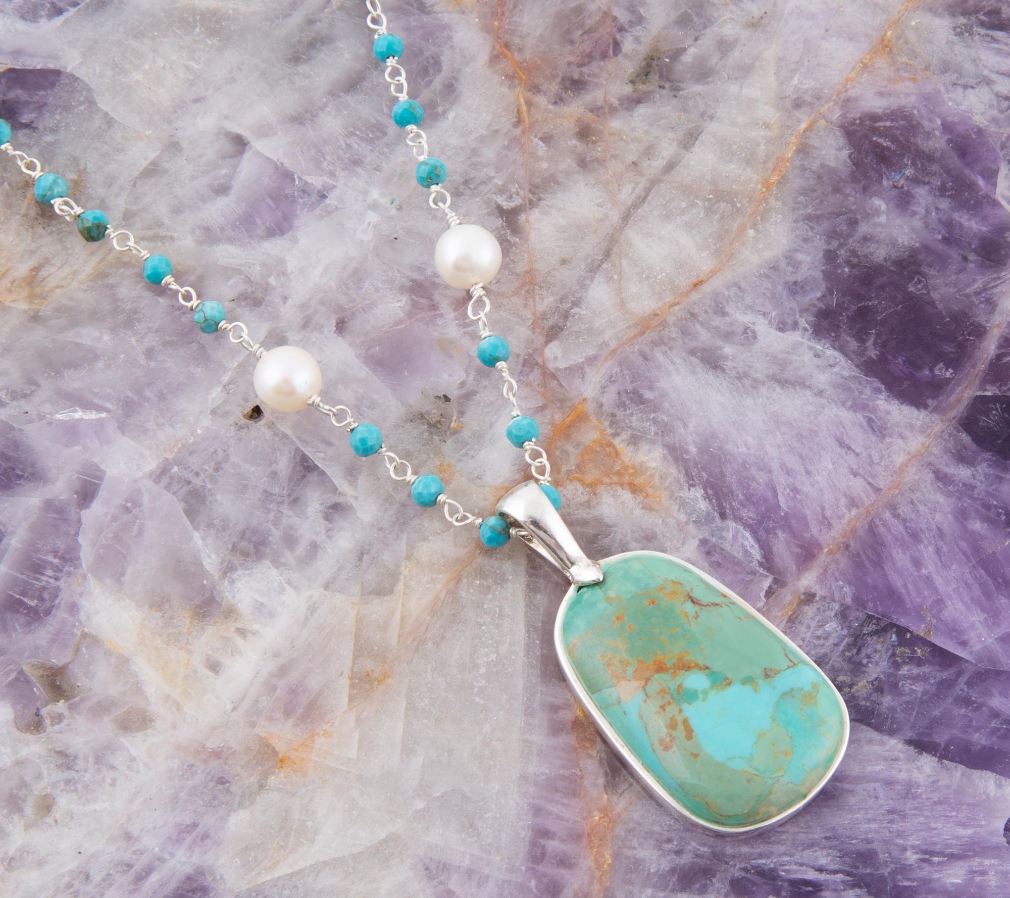 Discover the stunning artistry of the Barse artisan crafted sterling composite turquoise necklace. This exquisite piece features an abstract-shaped genuine blue composite turquoise stone, beautifully bezel set on a high polished sterling silver pendant. The oval link chain is further embellished with blue magnesite and cultured freshwater pearl beads for added elegance.