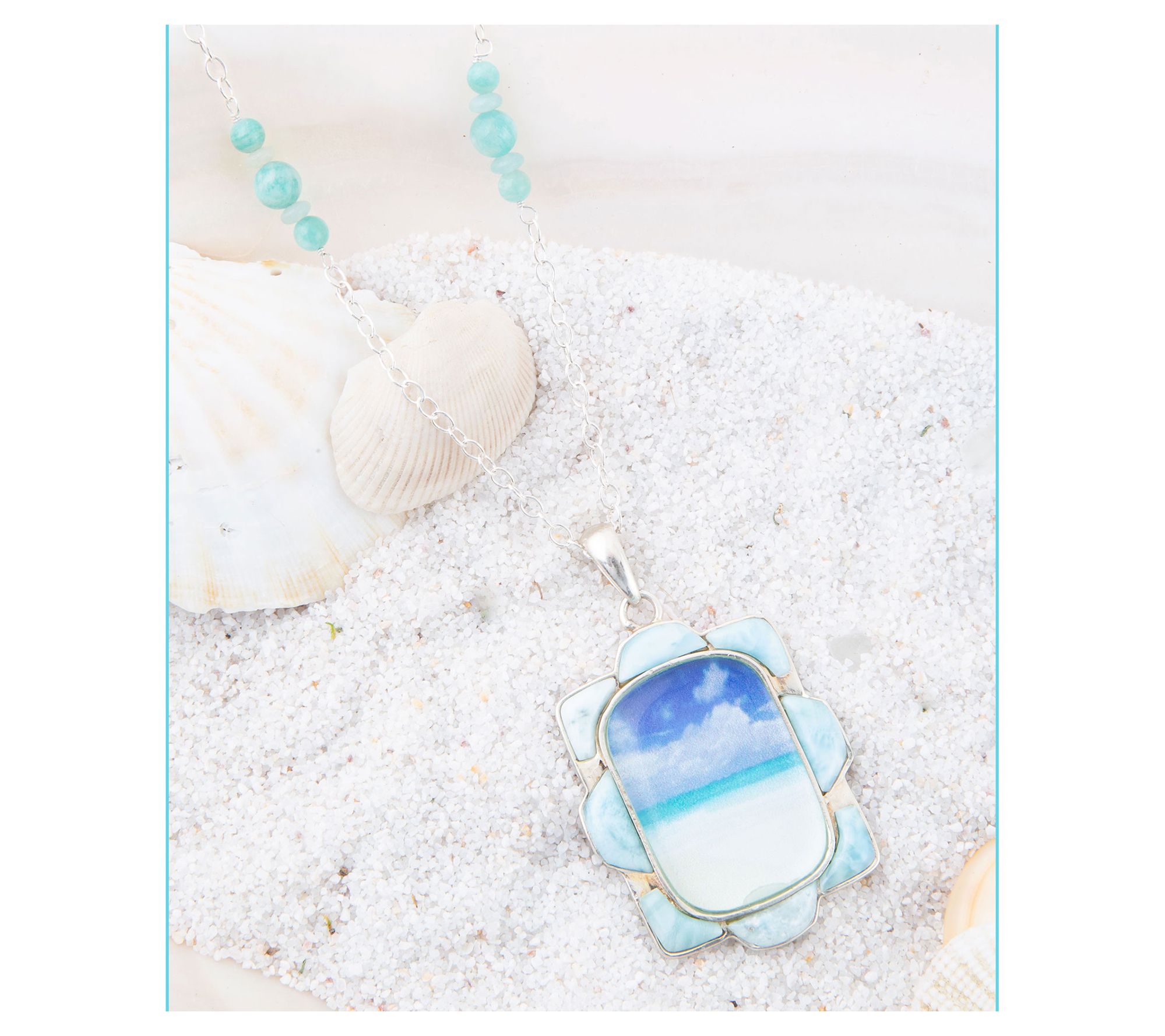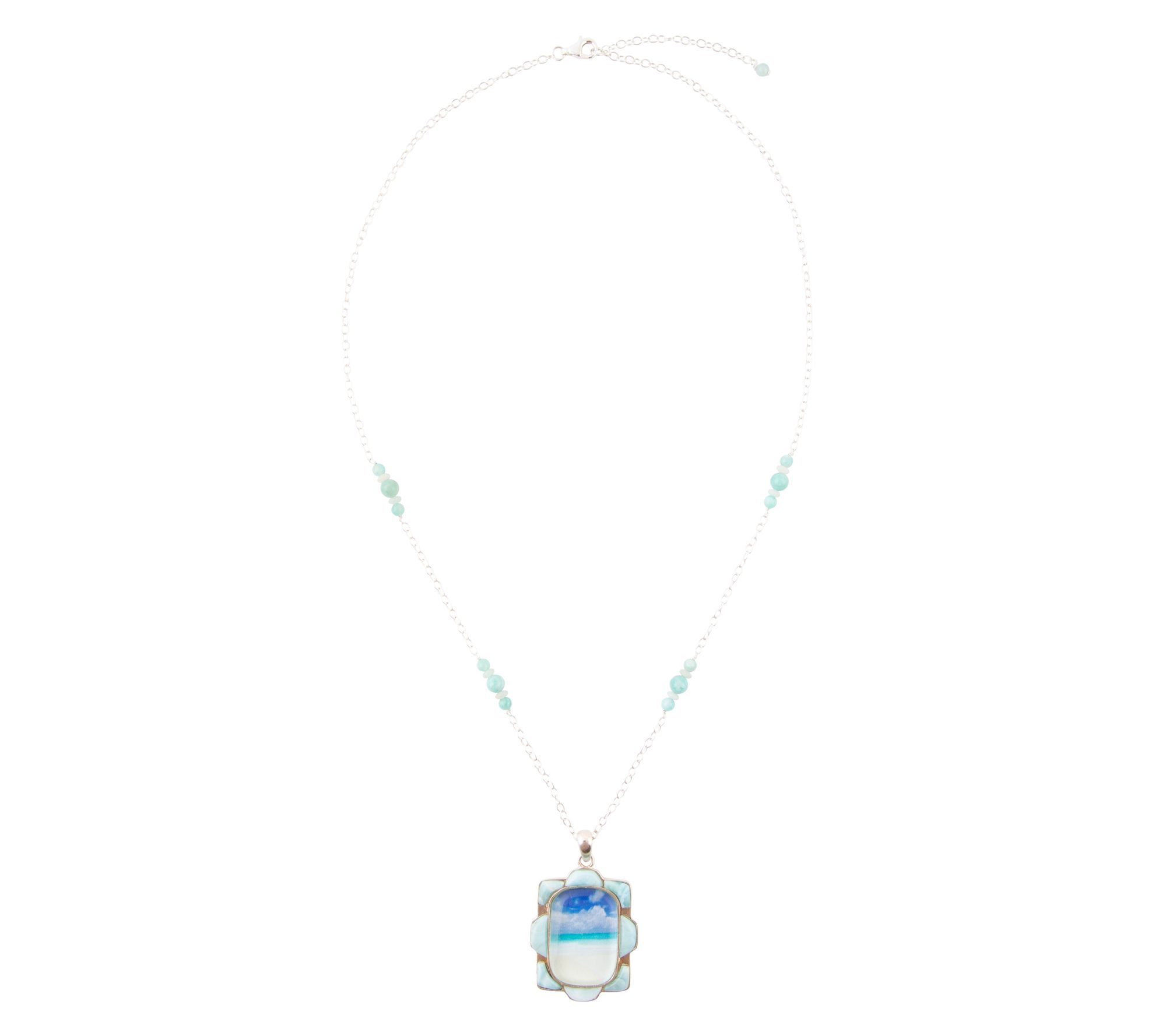 Freeform-shaped larimar gemstones surround a bezel-set beach scene; cable links with larimar beads; polished detail