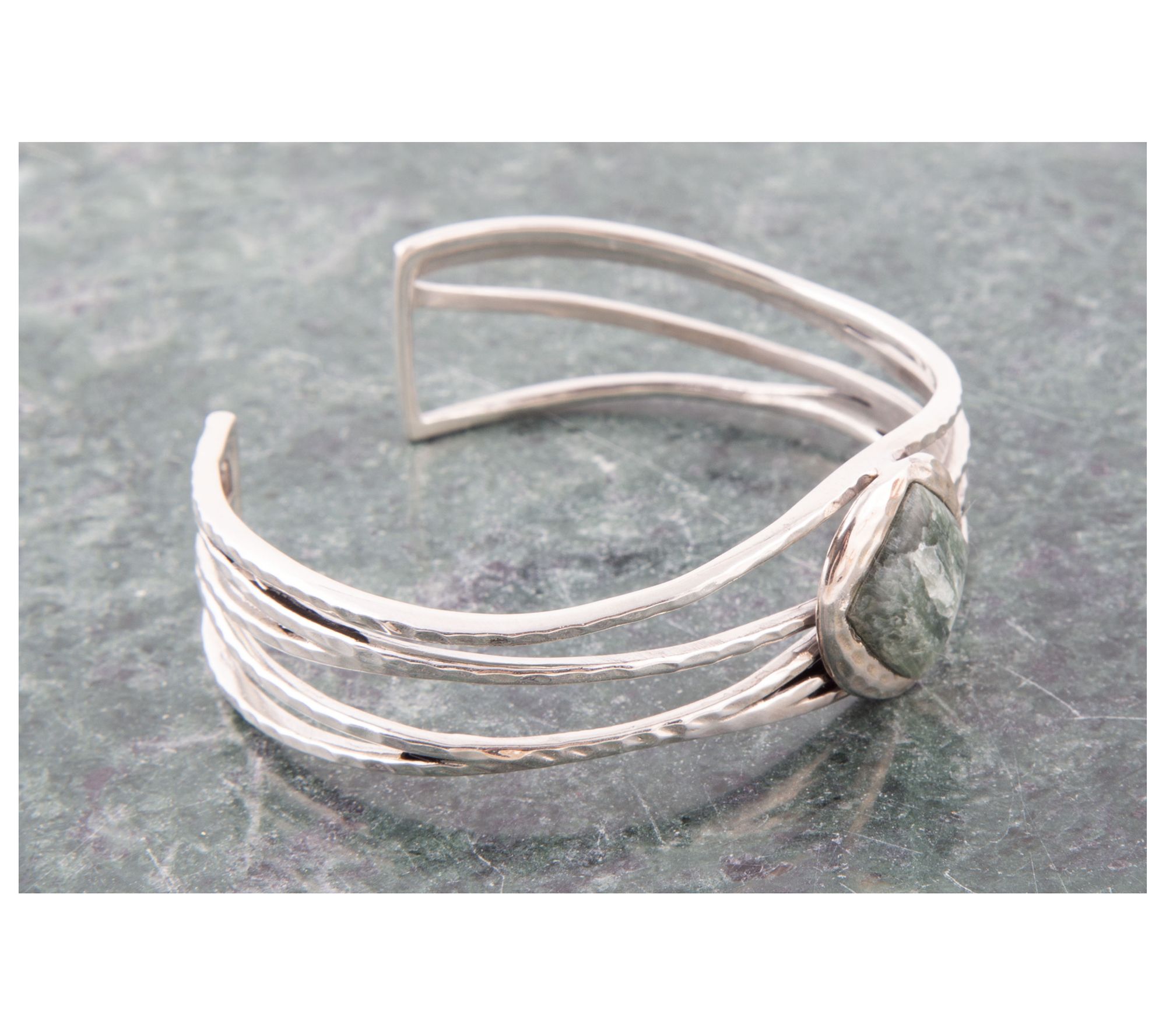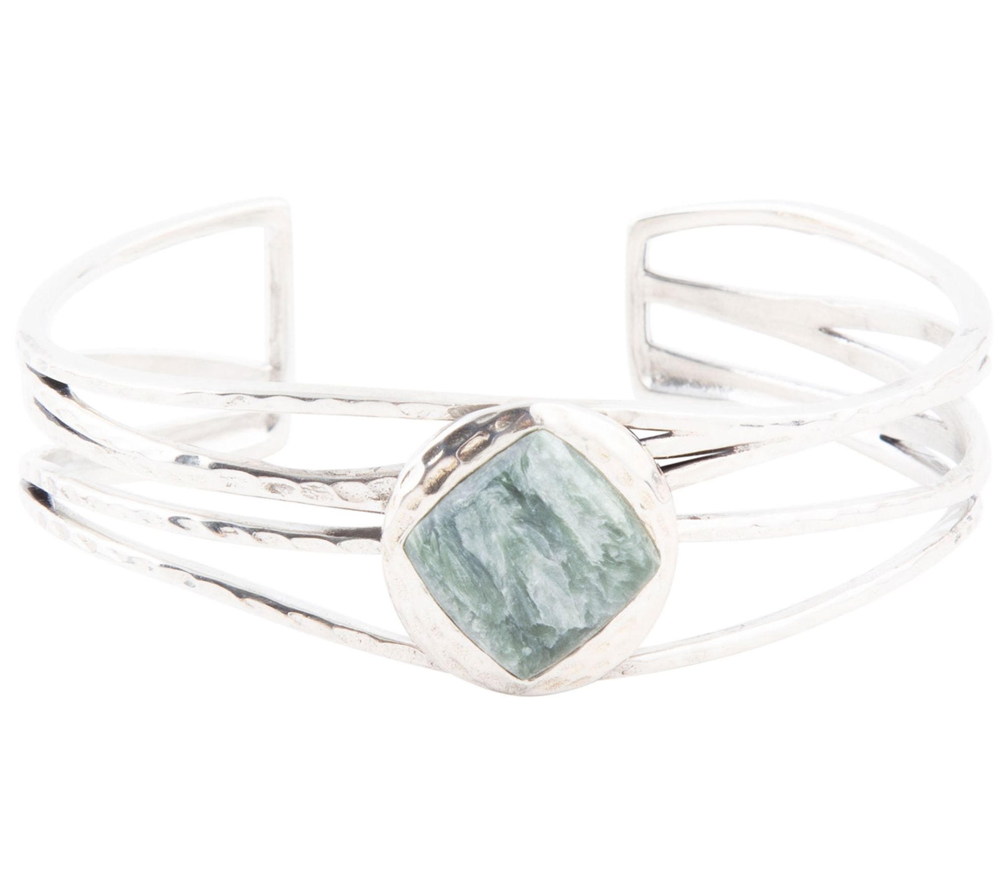 Cuff bracelet with kite-shaped, bezel-set seraphinite