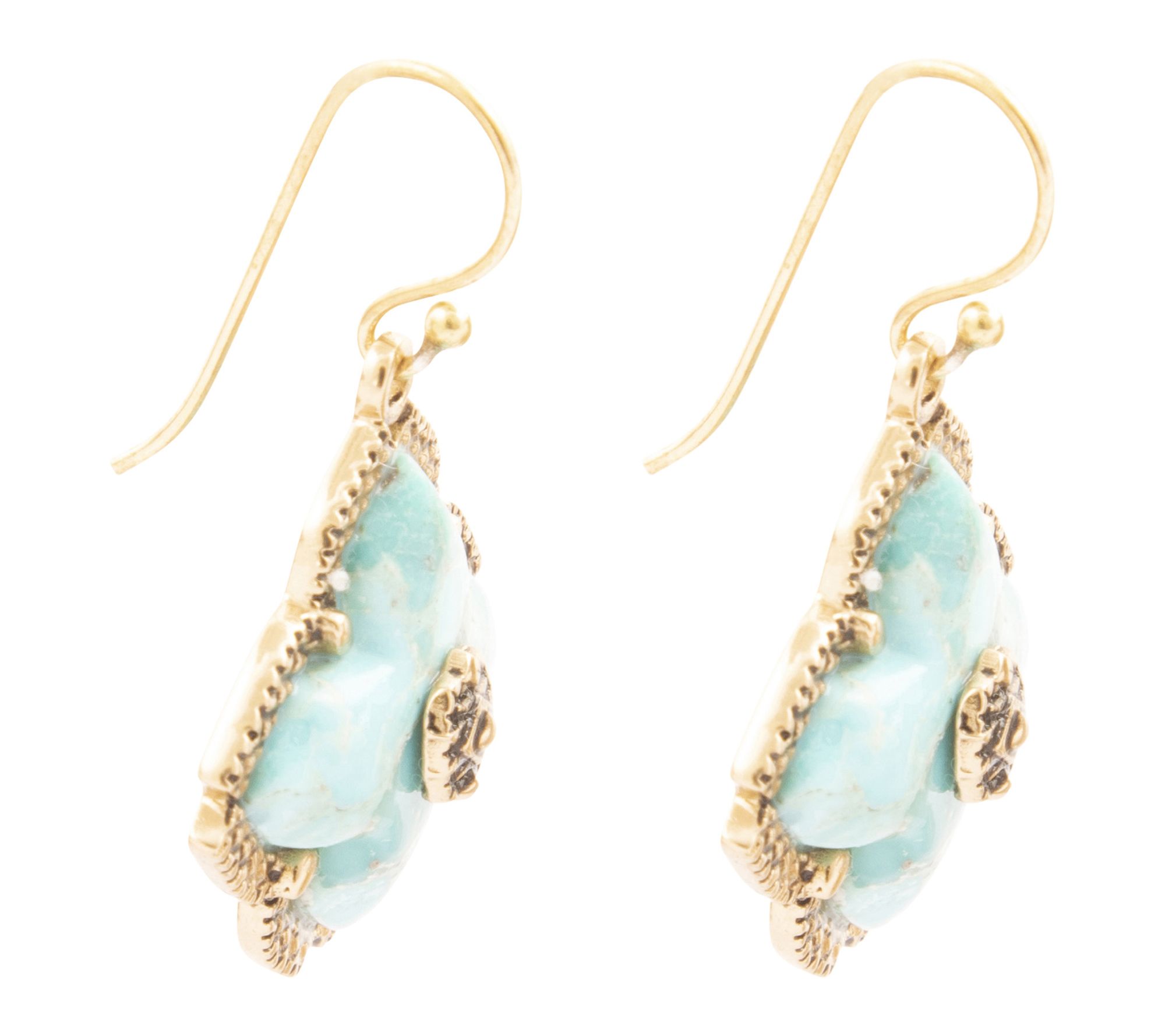Brighten your day with these dangle earrings, designed with genuine composite turquoise stones set in bronze bezels forming elegant Maltese crosses. Their lightweight build makes them ideal for comfortable wear, whether you're dressing up a favorite outfit or adding an artistic touch to everyday style. From Barse.