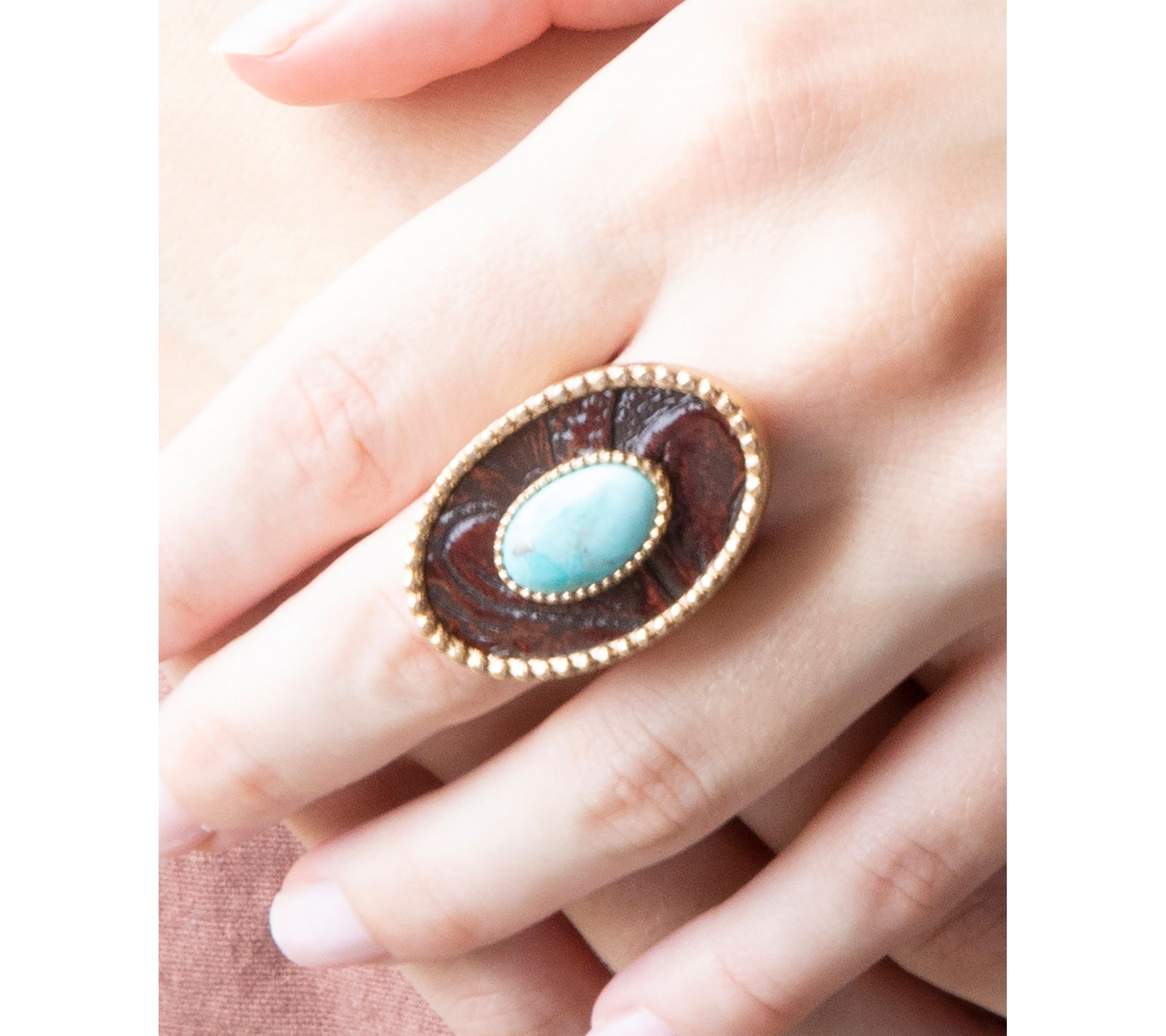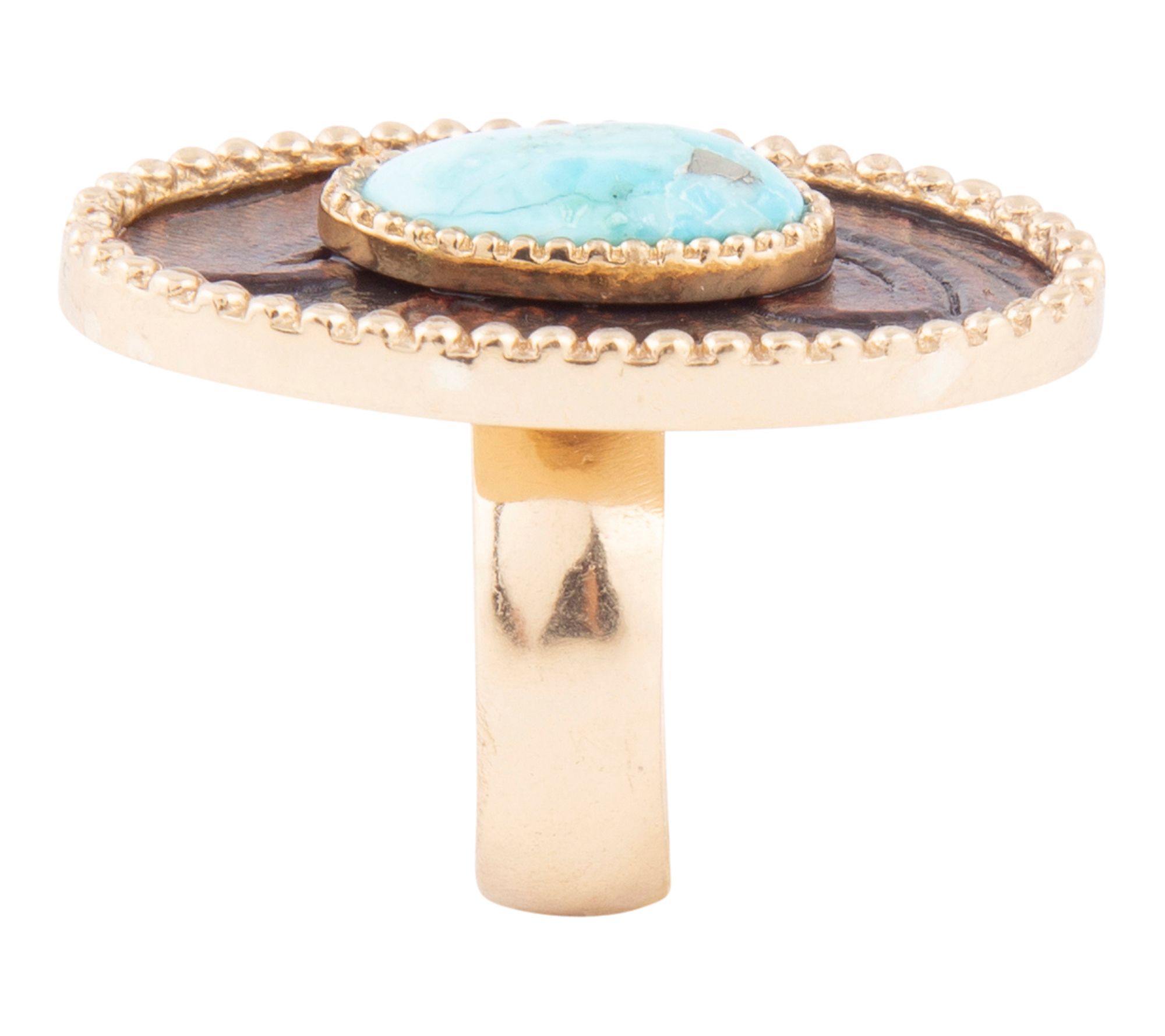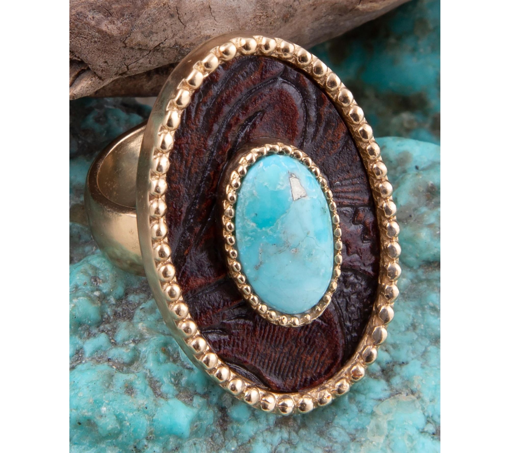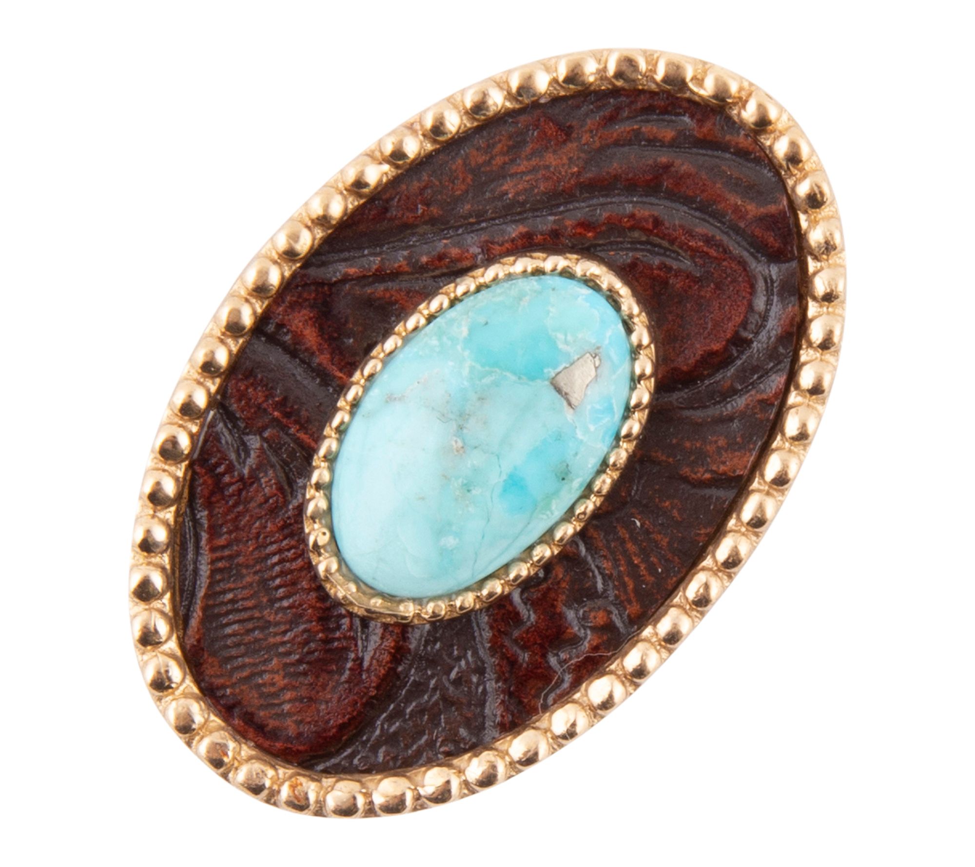 Bring a touch of artisanal flair to your look with this turquoise rosette leather golden ring. Whether you're dressing up for brunch or accenting your favorite casual pieces, its floral-inspired turquoise centerpiece and warm golden finish add striking detail that's sure to stand out. From Barse.