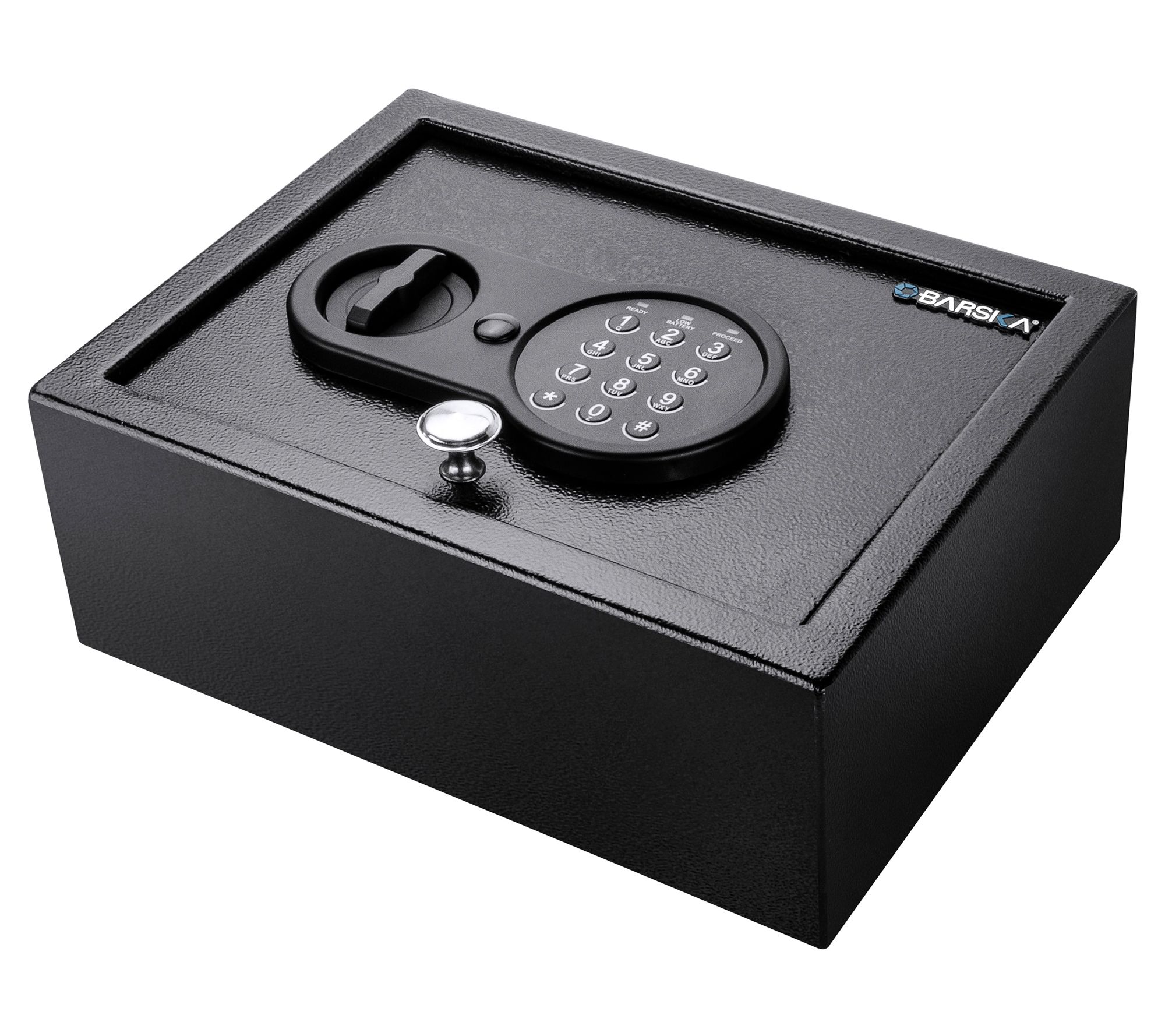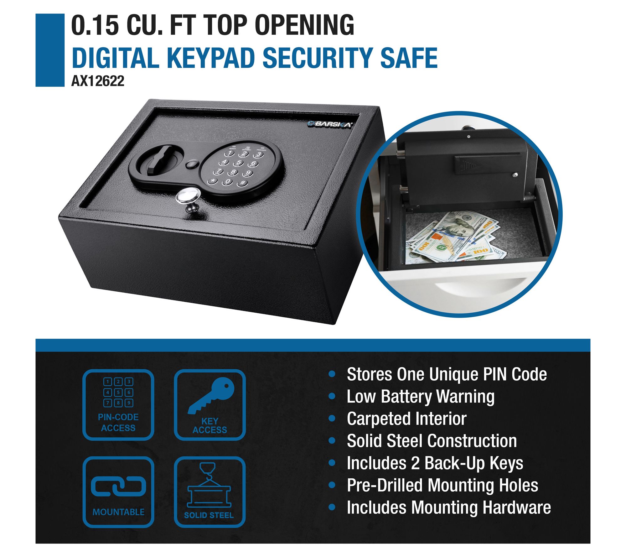 Securing your valuables is simple with the Barska 0.15 cu. ft Top Opening Keypad Security Safe. Ideal for medicine, money, jewelry, and electronics, the user-friendly digital keypad allows for smooth access while the solid steel locking bolts ensure ultimate protection. From Barska.