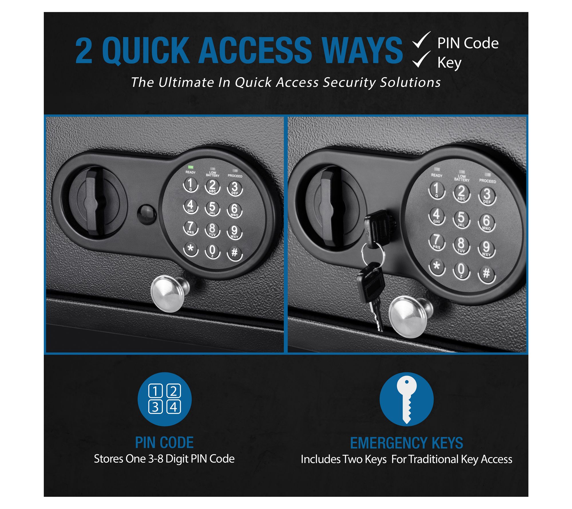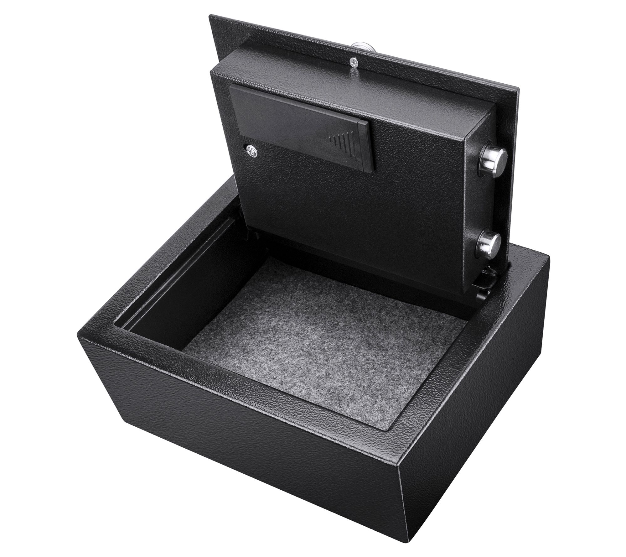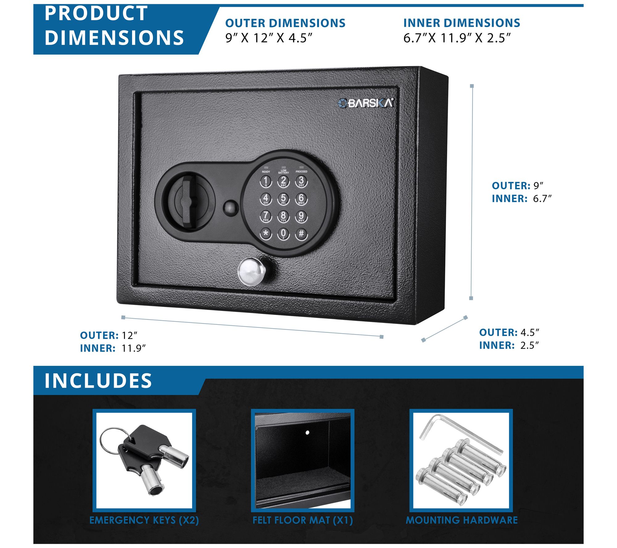 • Includes safe, two back-up keys, 4 AA batteries, mounting hardware