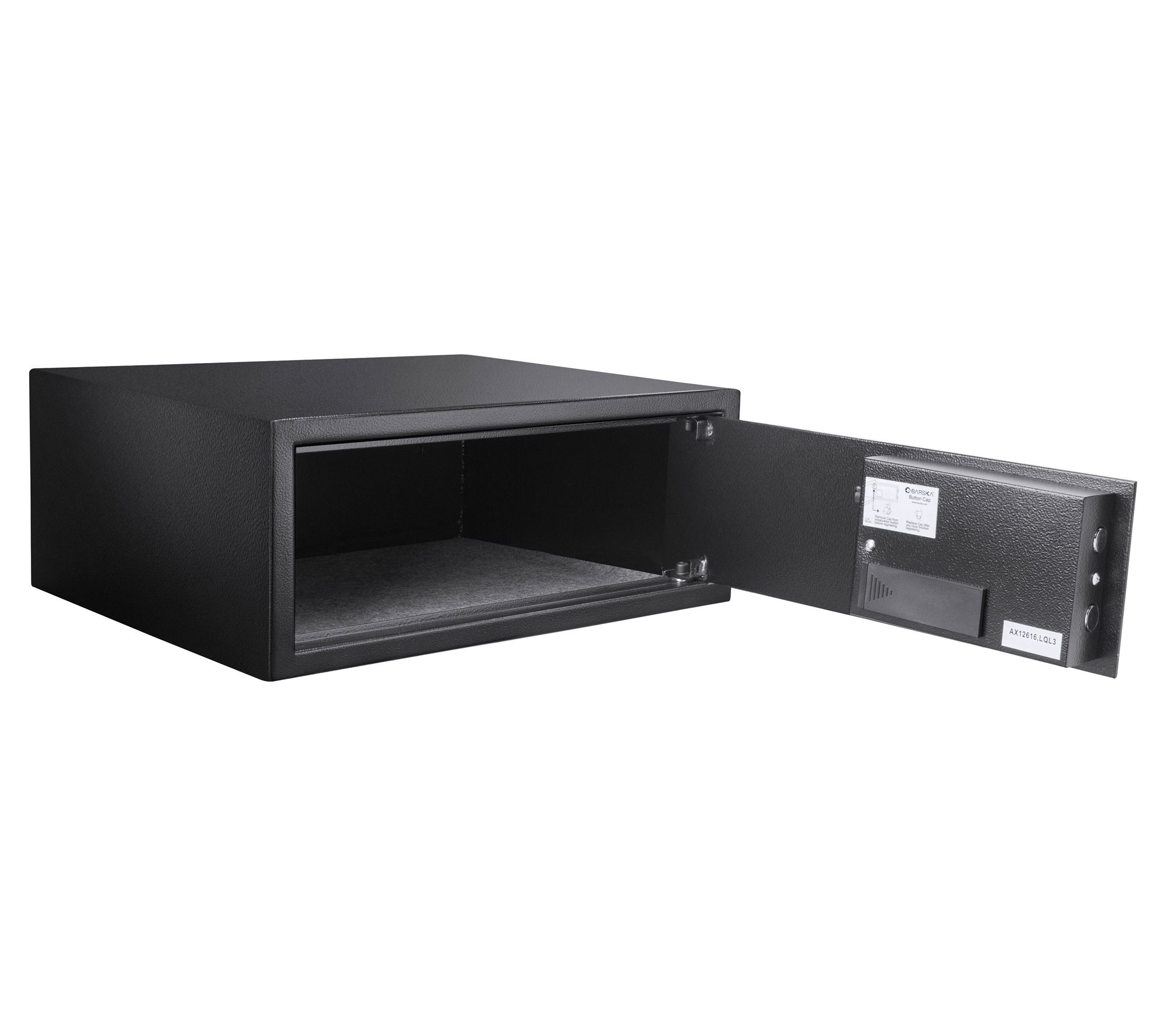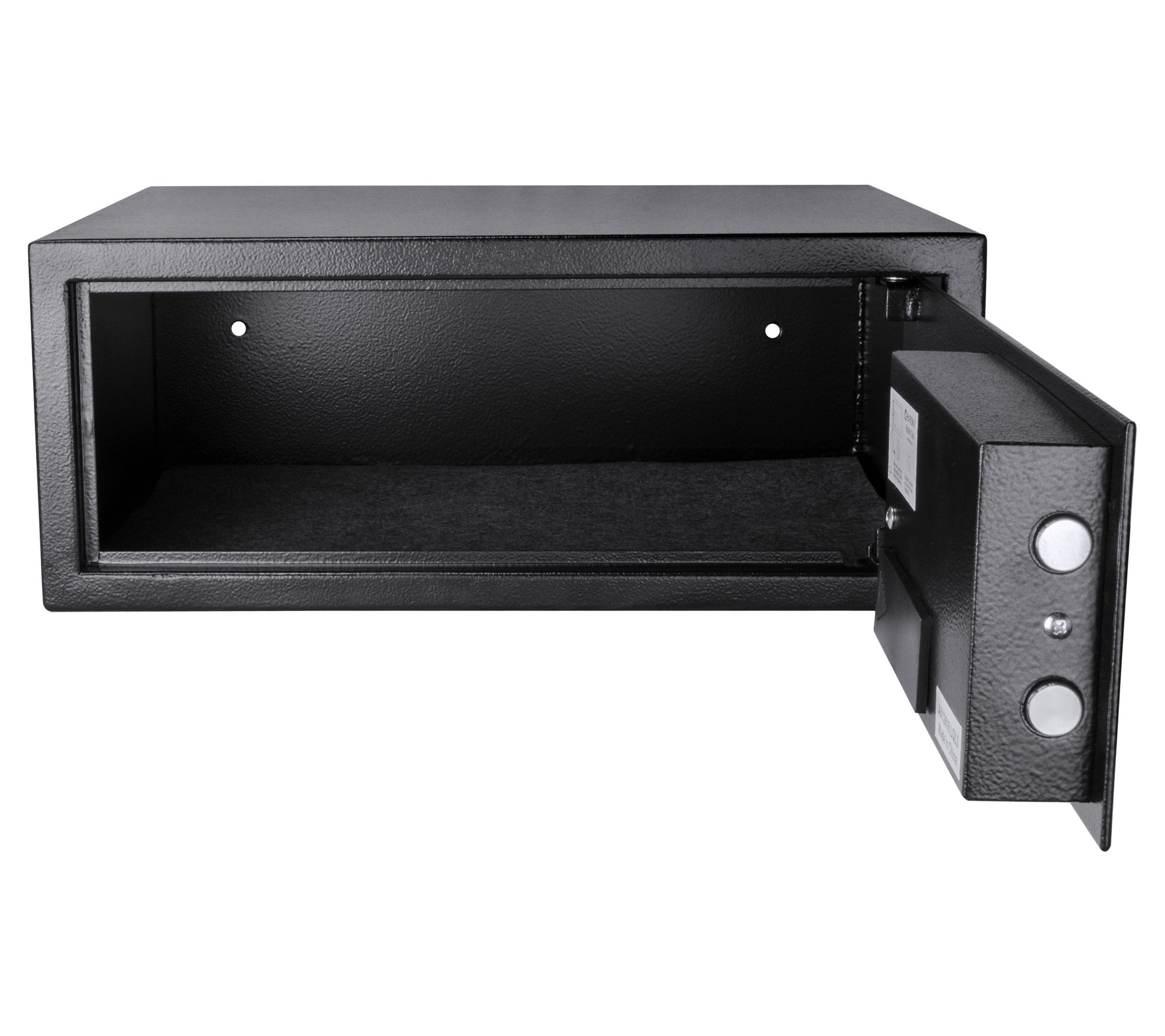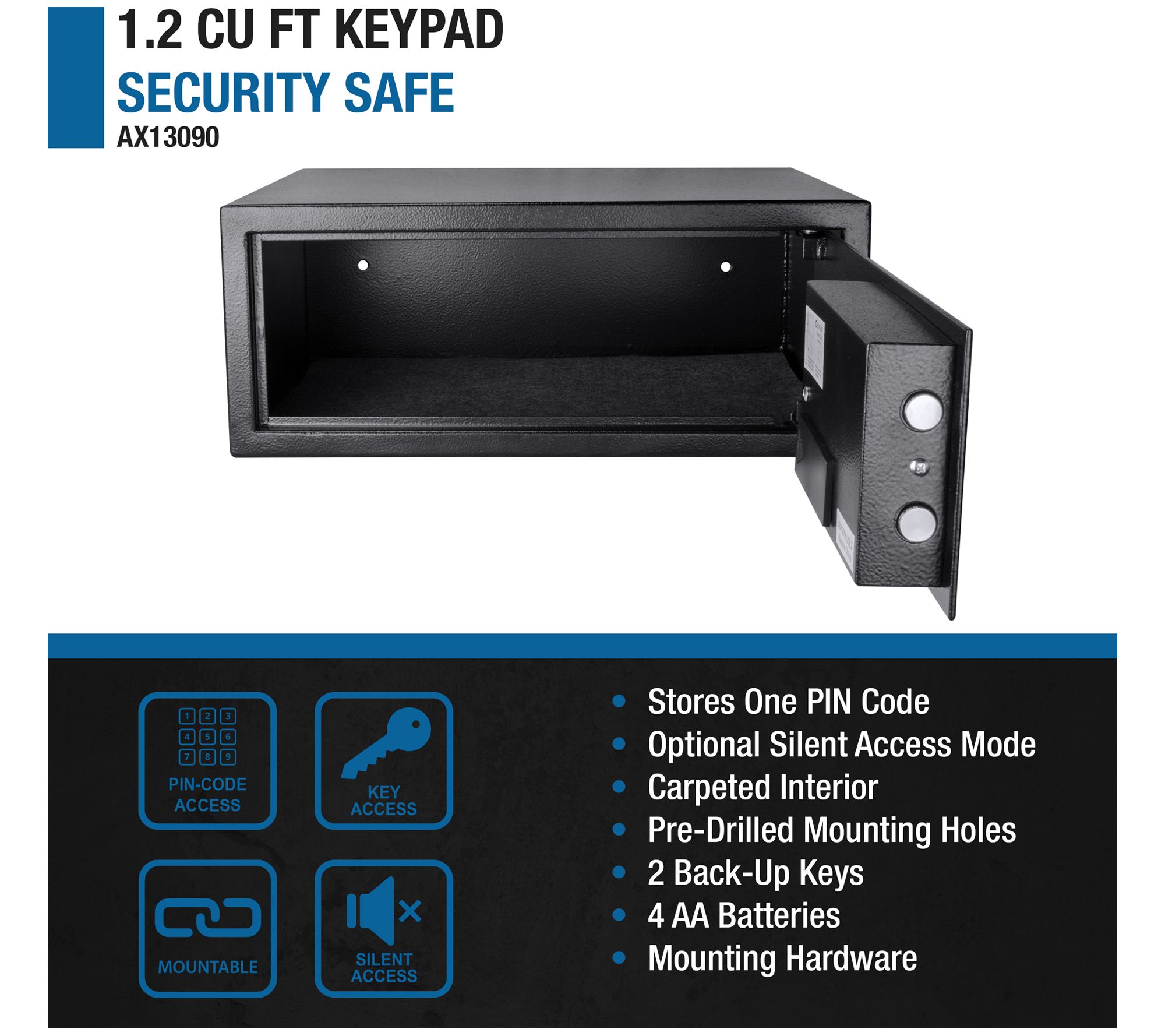 • Includes safe, two back-up keys, mounting hardware, and batteries
