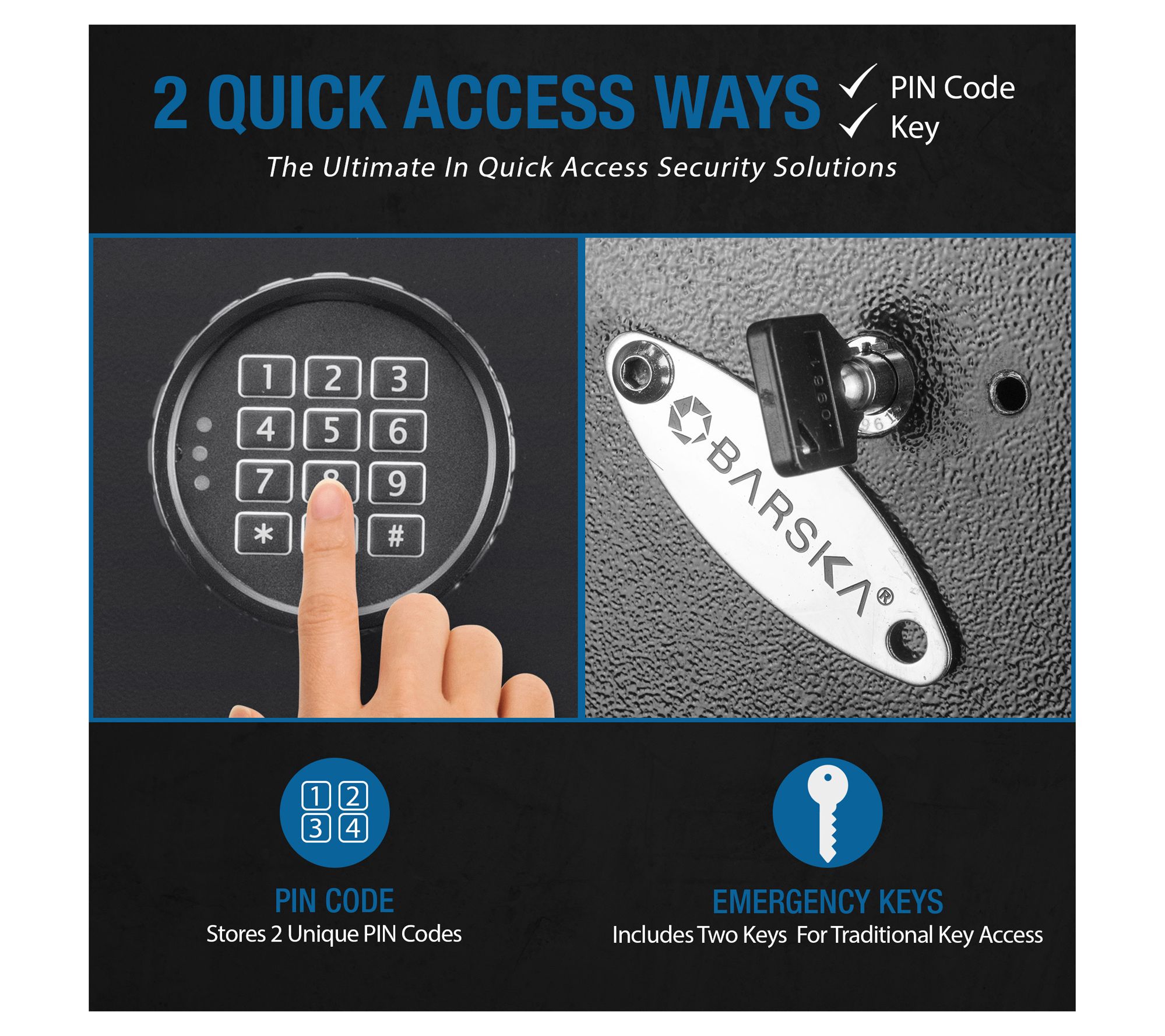 • Includes safe, two back-up keys, mounting hardware, and batteries