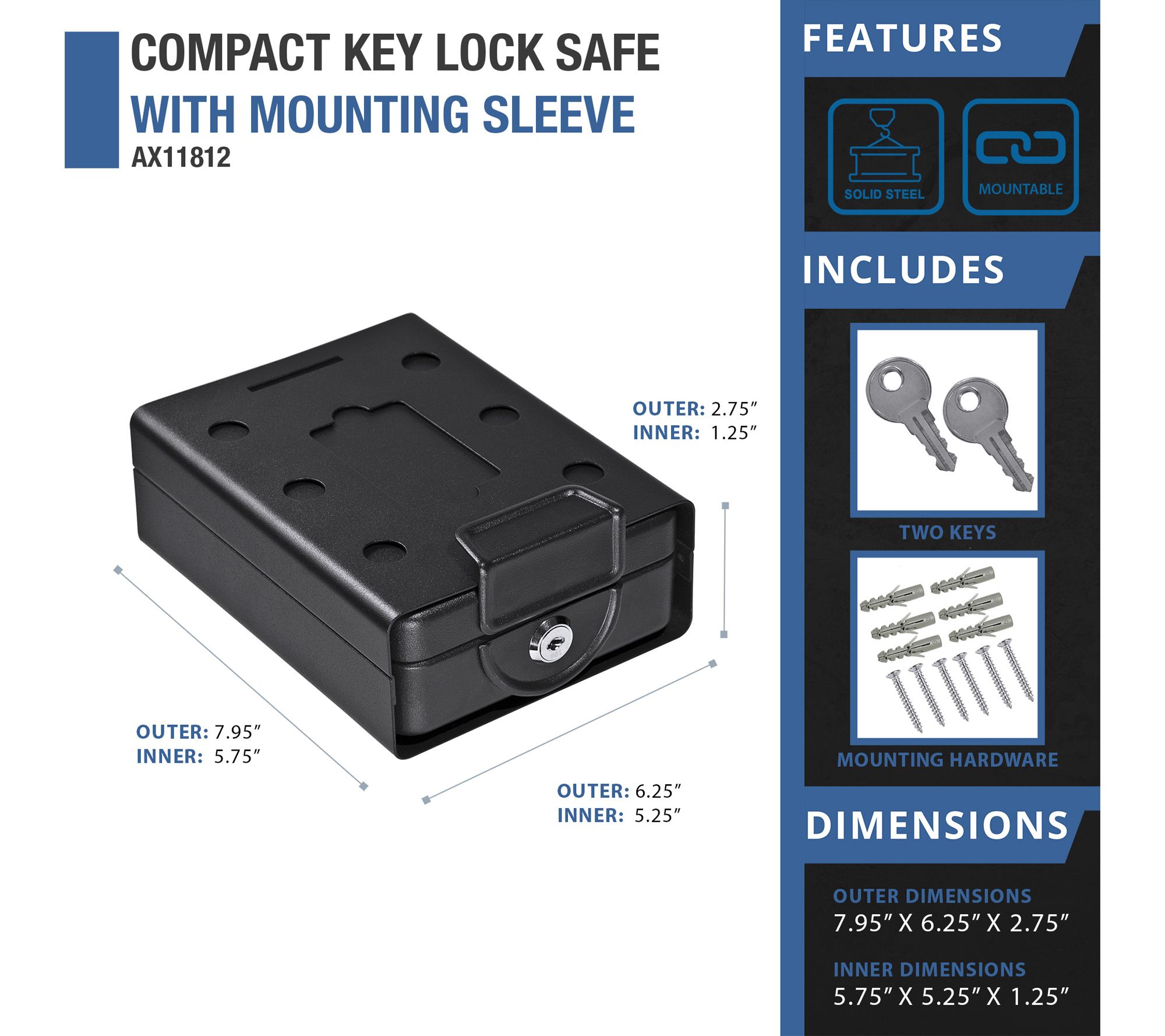 • Includes compact key lock safe, two keys, steel mounting sleeve, and mounting hardware