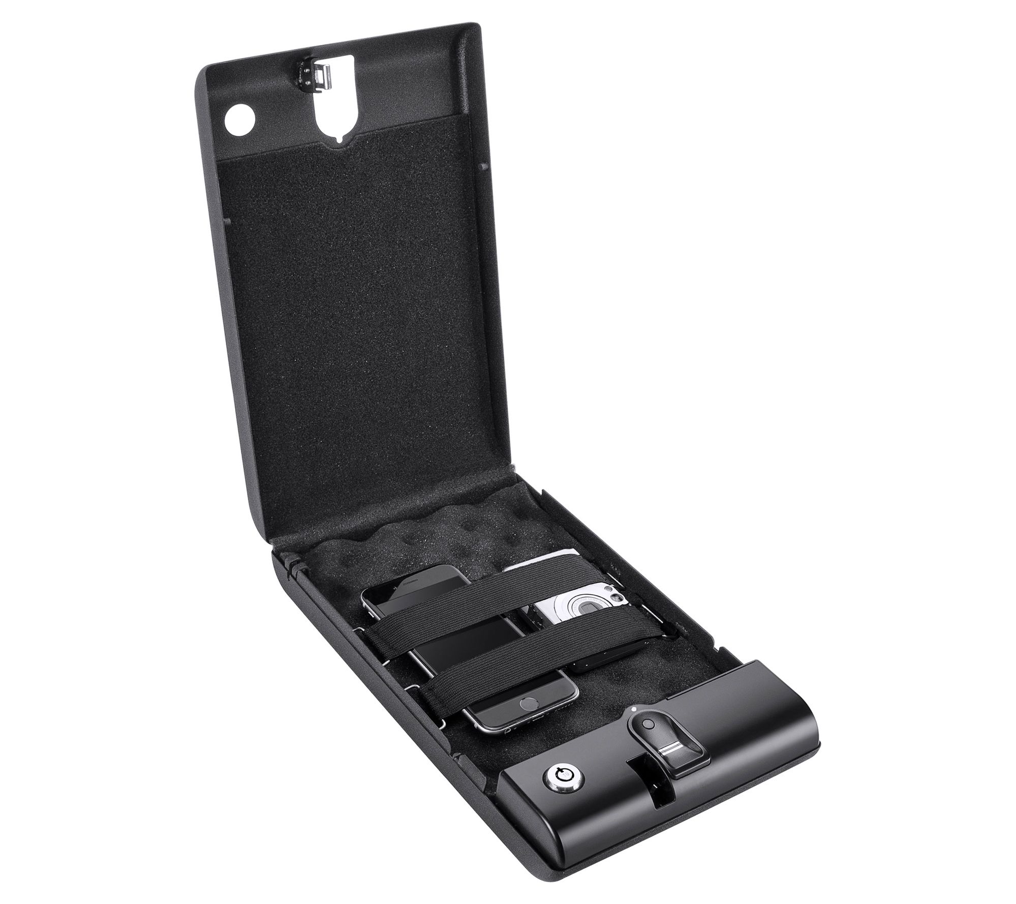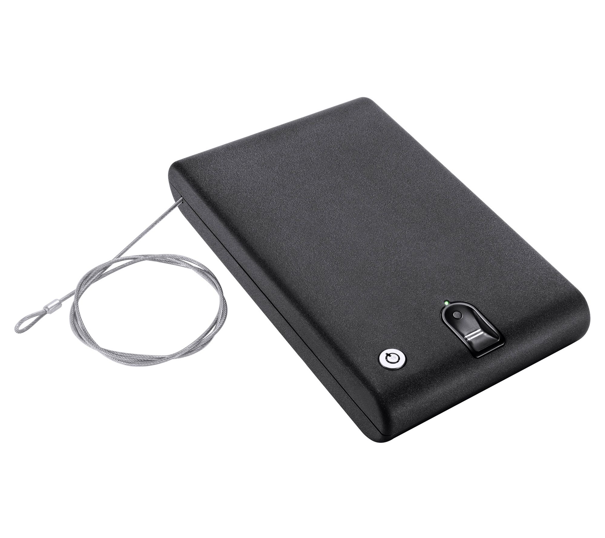 • Includes portable biometric compact lock box, two back-up keys, 4 AA batteries, steel security cable, foam liner, removable inner strap