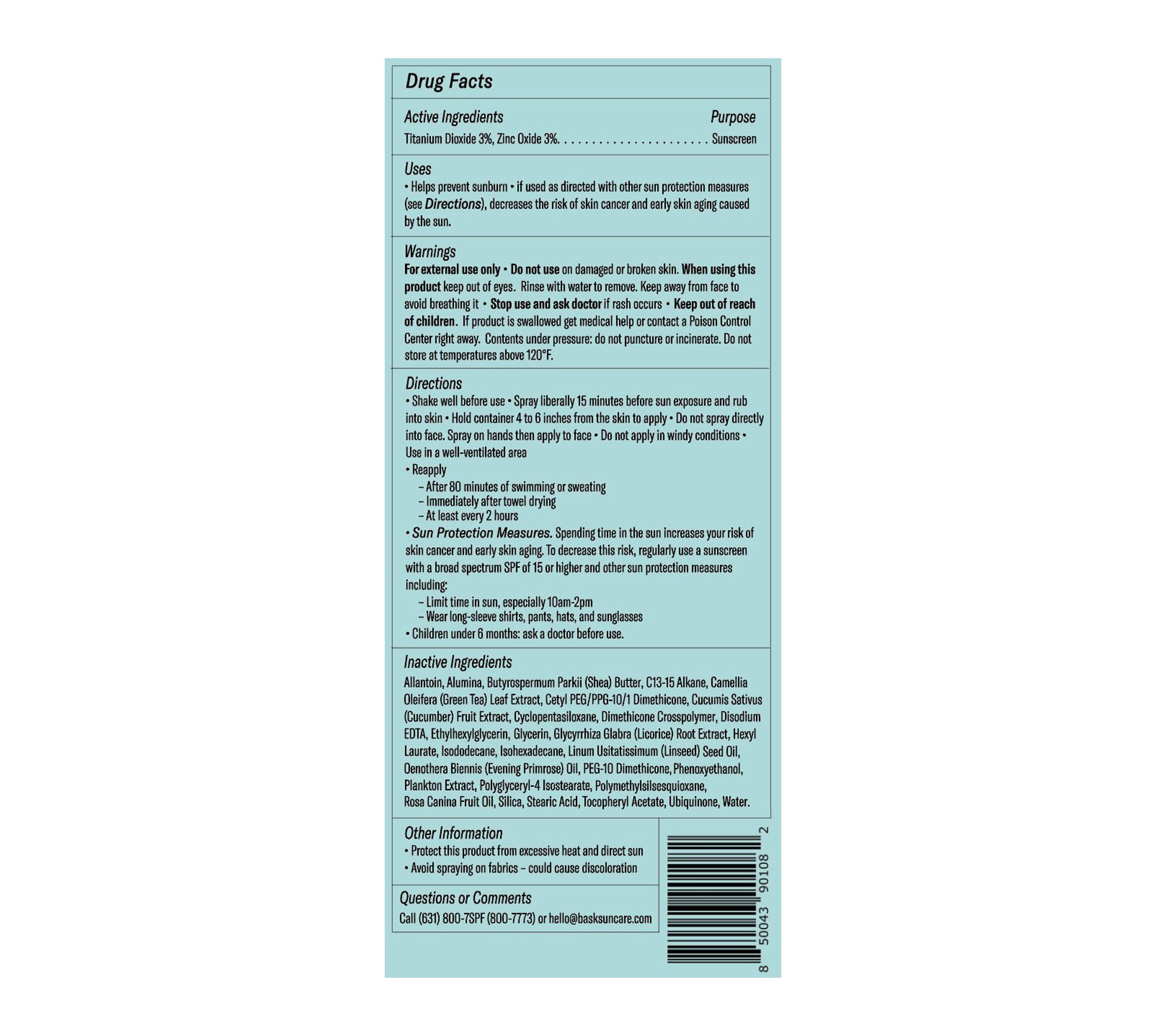 You won't believe this Bask sunscreen spray formulation until you try it. It's an innovative game changer in the mineral SPF category. Non-nano zinc oxide and titanium dioxide combine with hero inactive ingredient glycerin to help protect while hydrating and nourishing. The sunscreen contains moisturizers that nourish the skin with moisture, helping skin feel soft and supple. Broad Spectrum SPF 30 EVA/EVB protection.