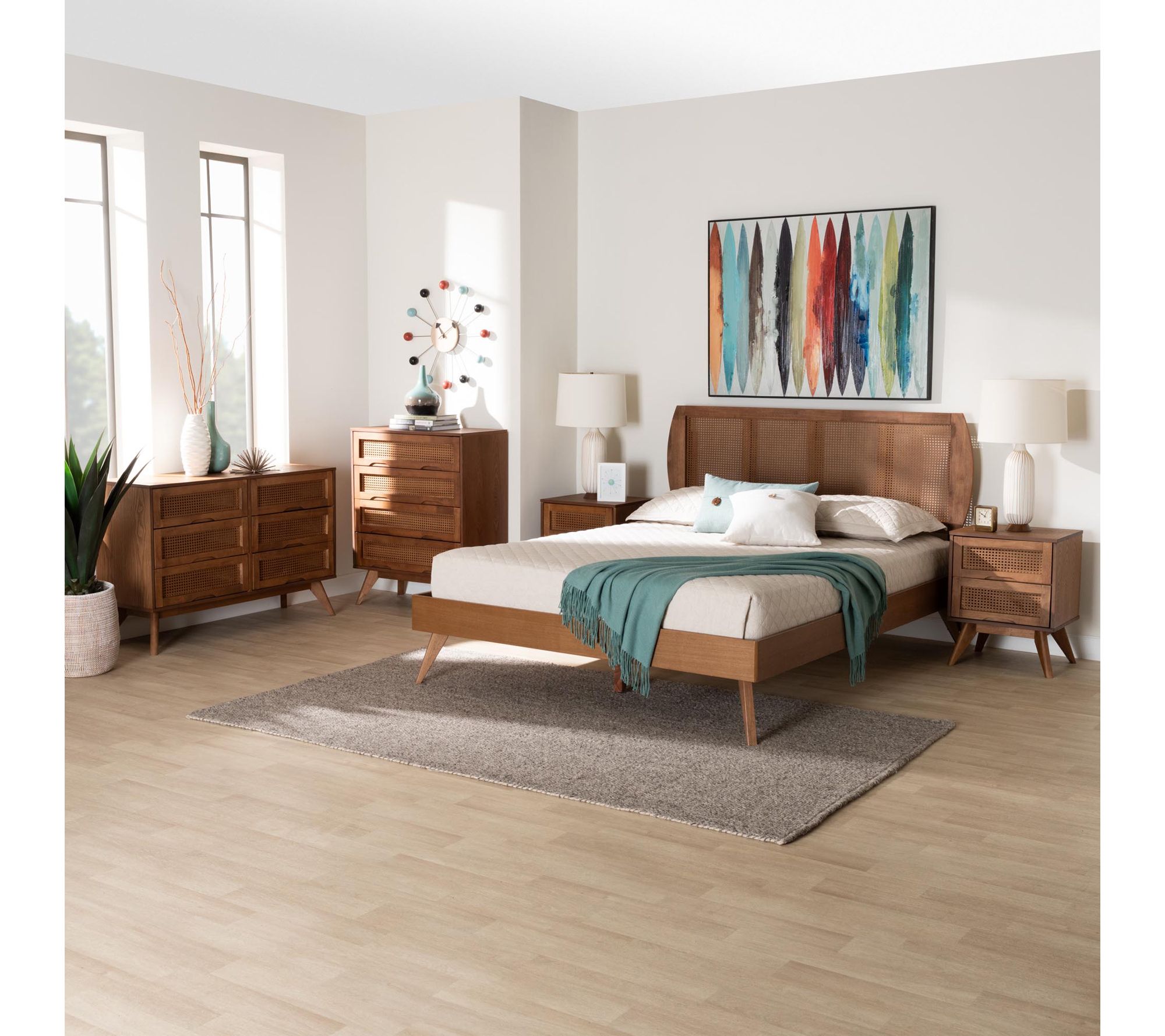 Transform your bedroom into a welcoming retreat with this beautiful Asami wood and rattan king five-piece bedroom set. Thoughtful storage in the chest and dresser keeps essentials neatly tucked away, while the coordinating nightstands offer easy access to your favorite items. Woven rattan accents and a warm wood finish create an inviting ambiance for peaceful nights. From Baxton Studio.