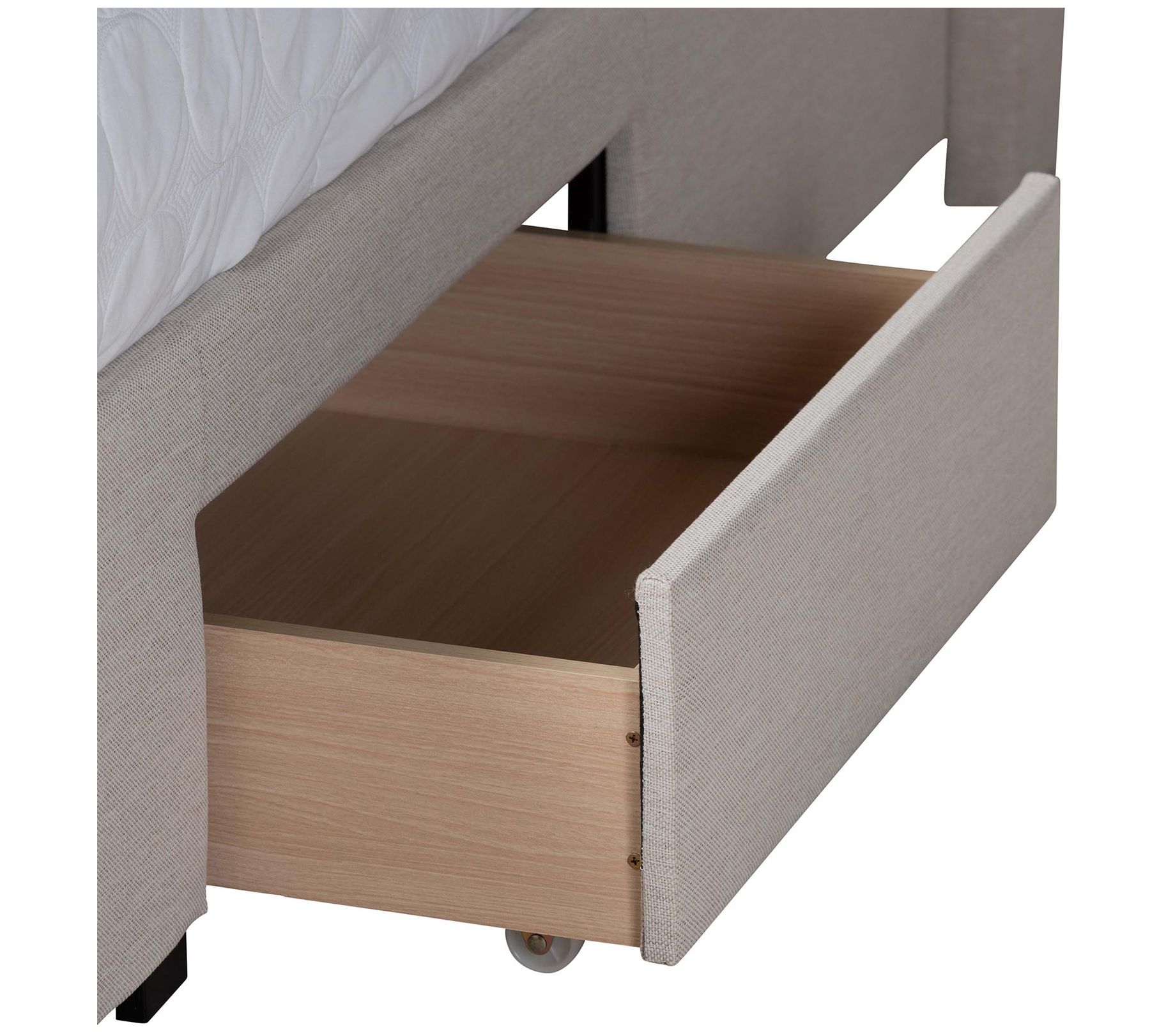 Create a harmonious haven with the Braylon storage bed. Wrapped in plush foam and upholstered in sumptuous fabric, this bed is both beautiful and practical. The wide drawer at the footboard and two additional side drawers cater to modern needs. From Baxton Studio.