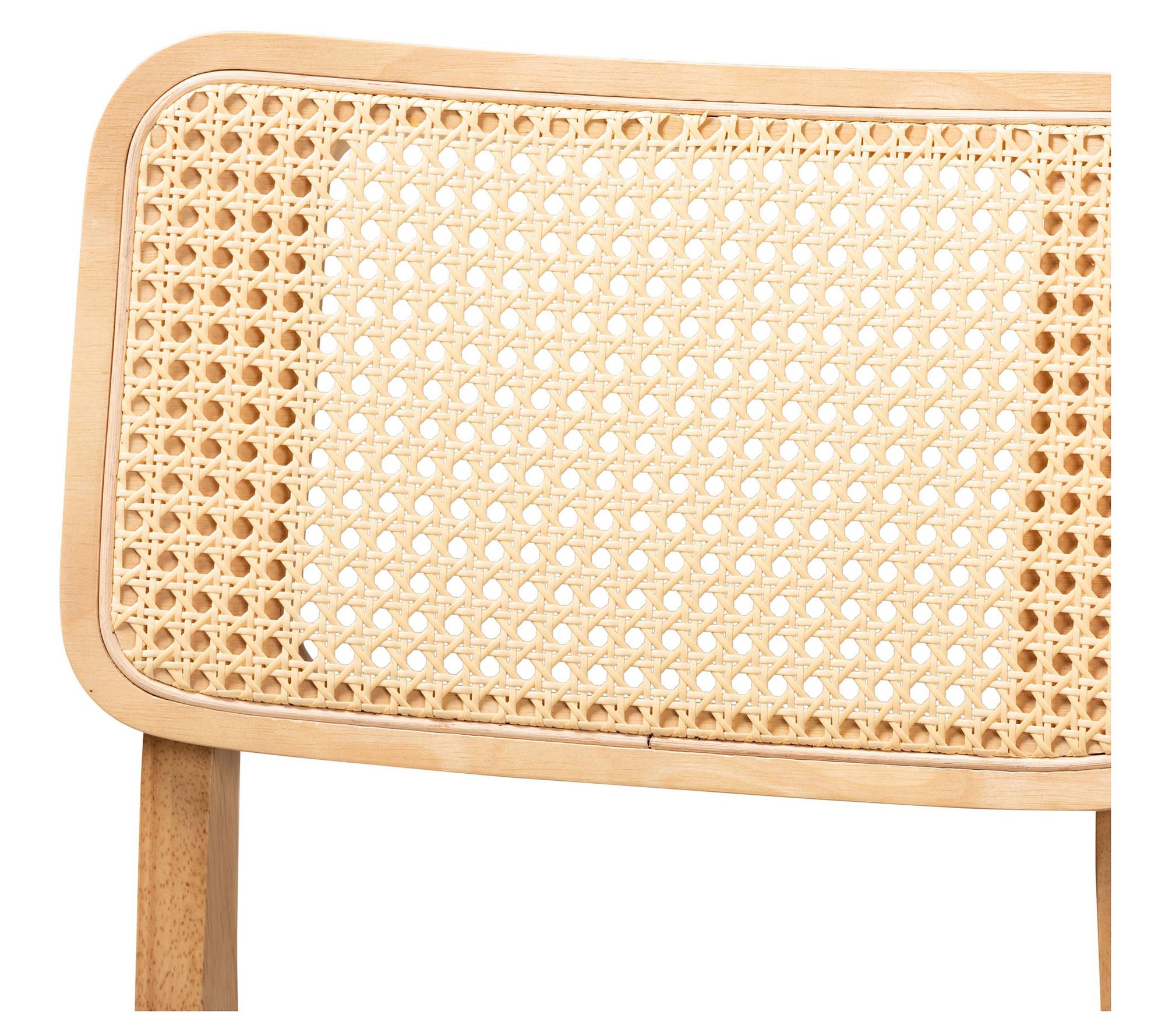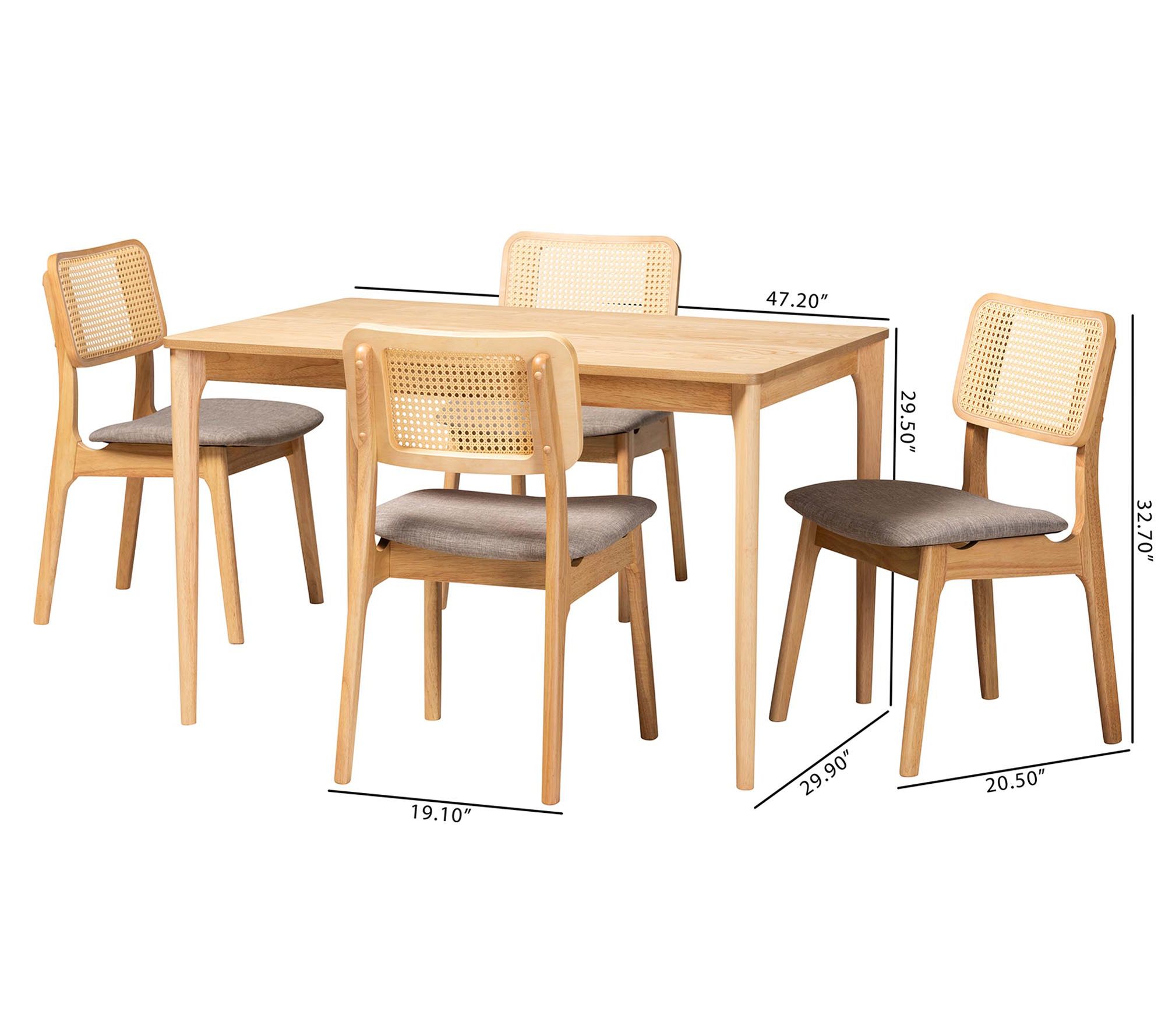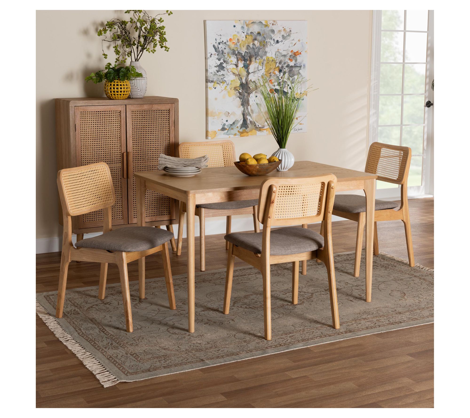 Elevate your dining experience with the timeless charm of the Dannon dining set. The mid-century-inspired set includes four cozy chairs padded with plush foam and upholstered in soft fabric, complemented by rattan-adorned backrests. The spacious rectangular tabletop with rounded corners provides ample space for family meals and gatherings. From Baxton Studio.