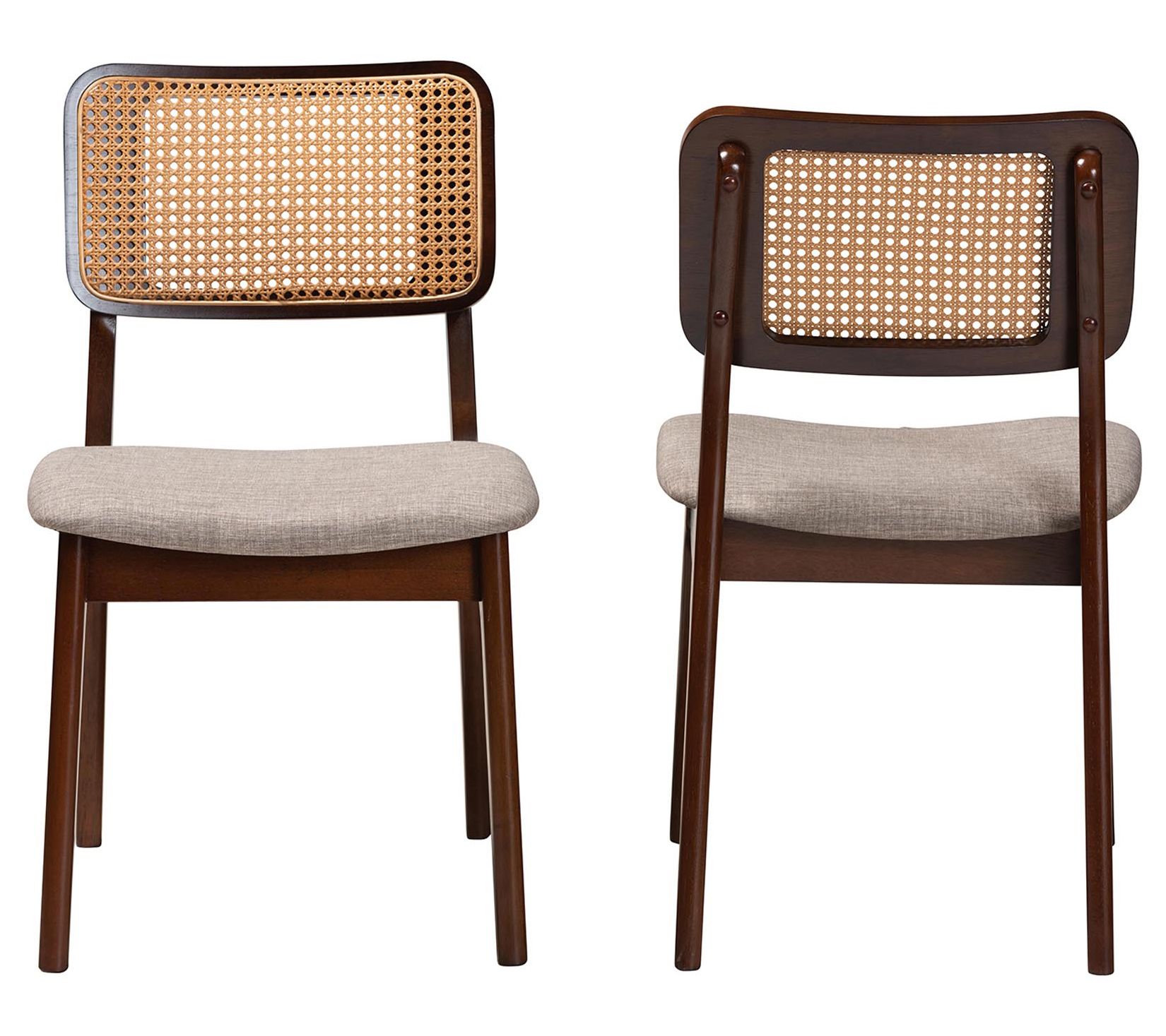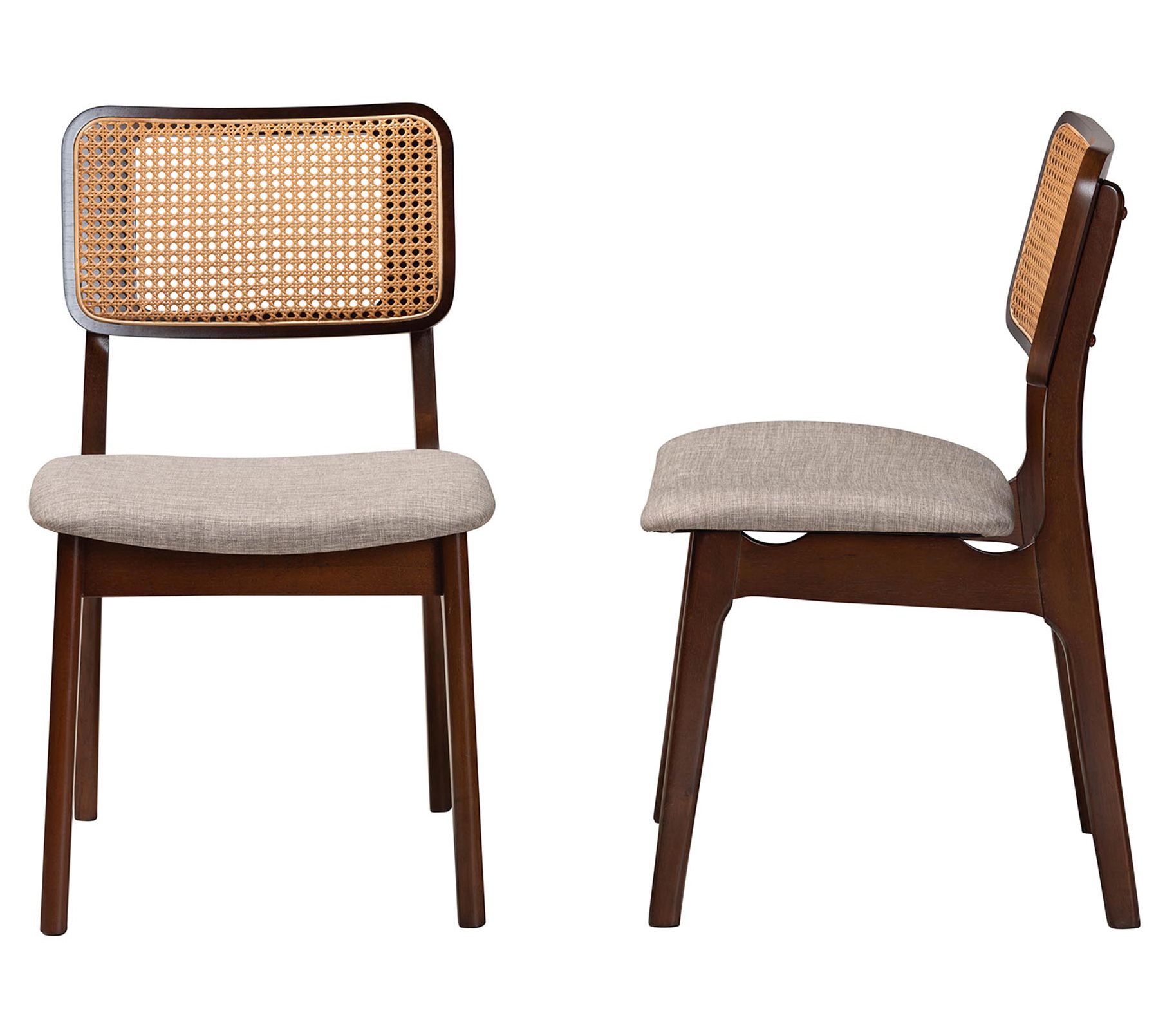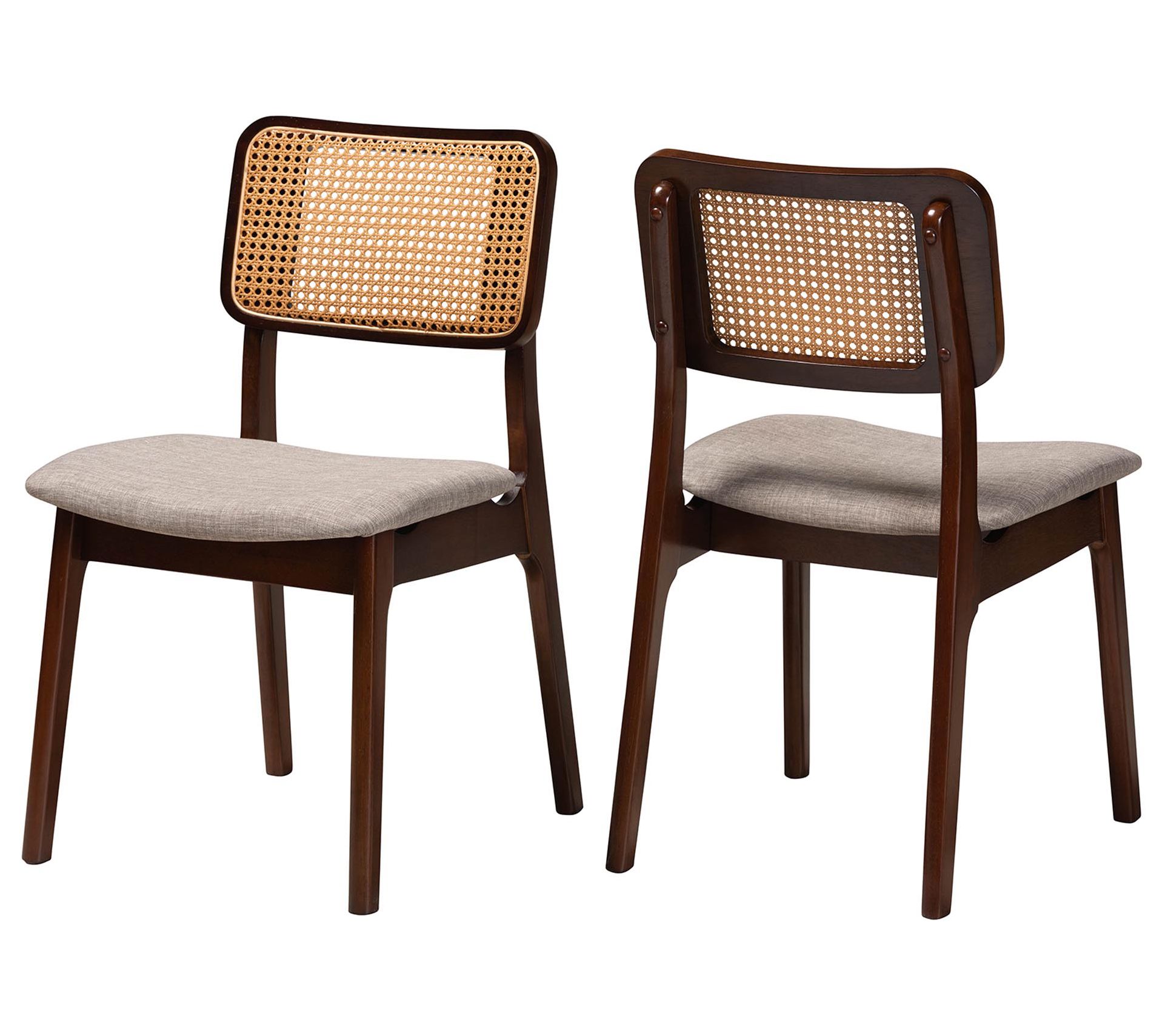 Elevate your dining experience with the Baxton Studio Dannon dining chair set, where traditional elegance meets mid-century charm. Crafted in Malaysia, these chairs feature a sturdy wood frame with woven rattan backrests, angled legs for stability, and plush foam padding upholstered in soft fabric, ensuring comfort during any dining occasion. From Baxton Studio.