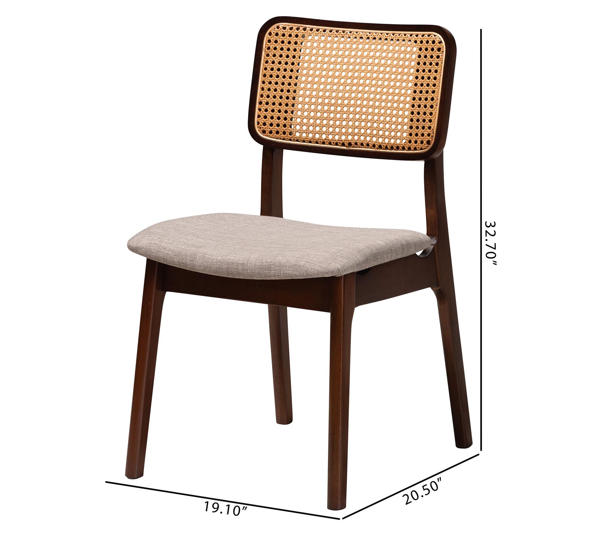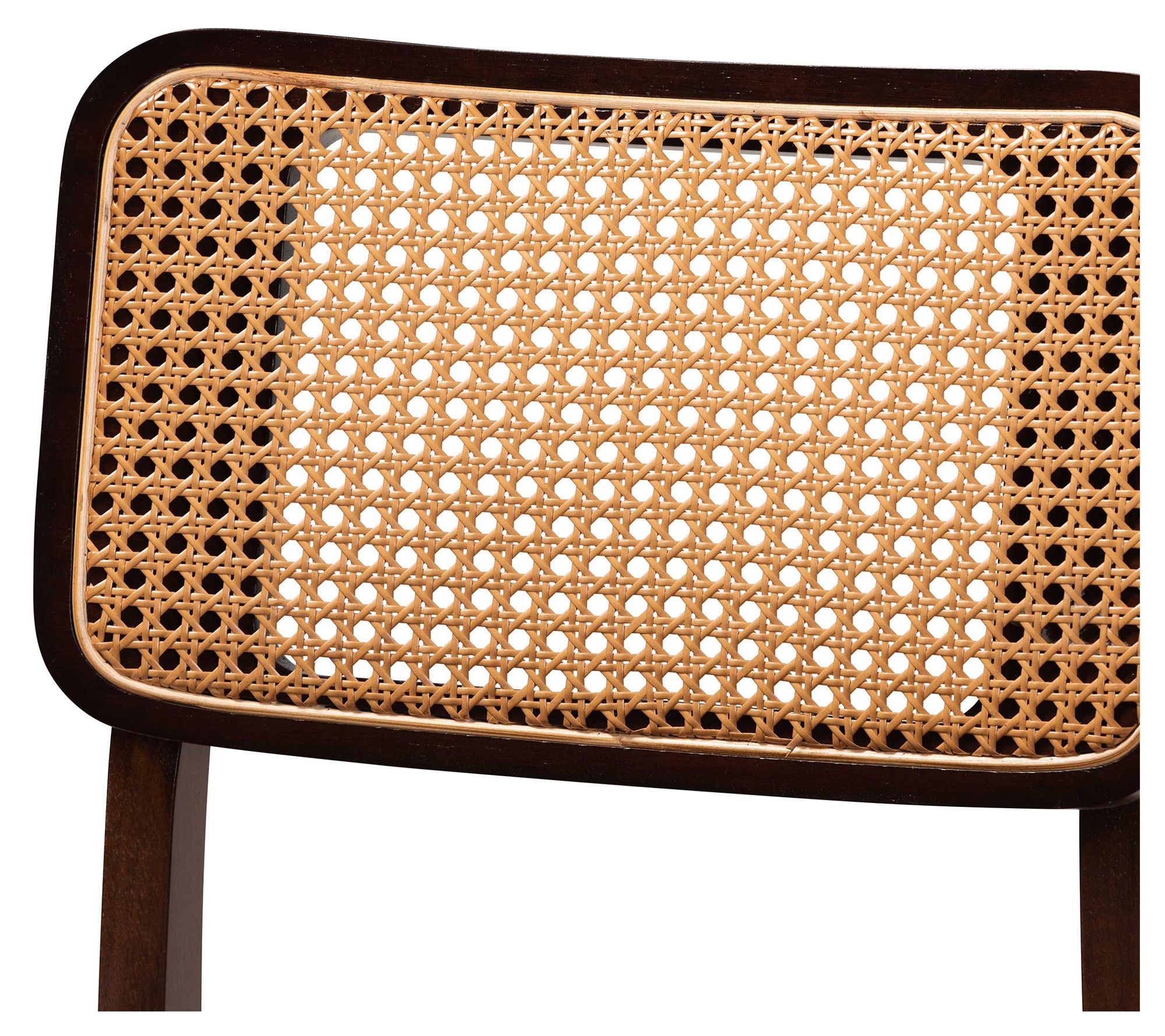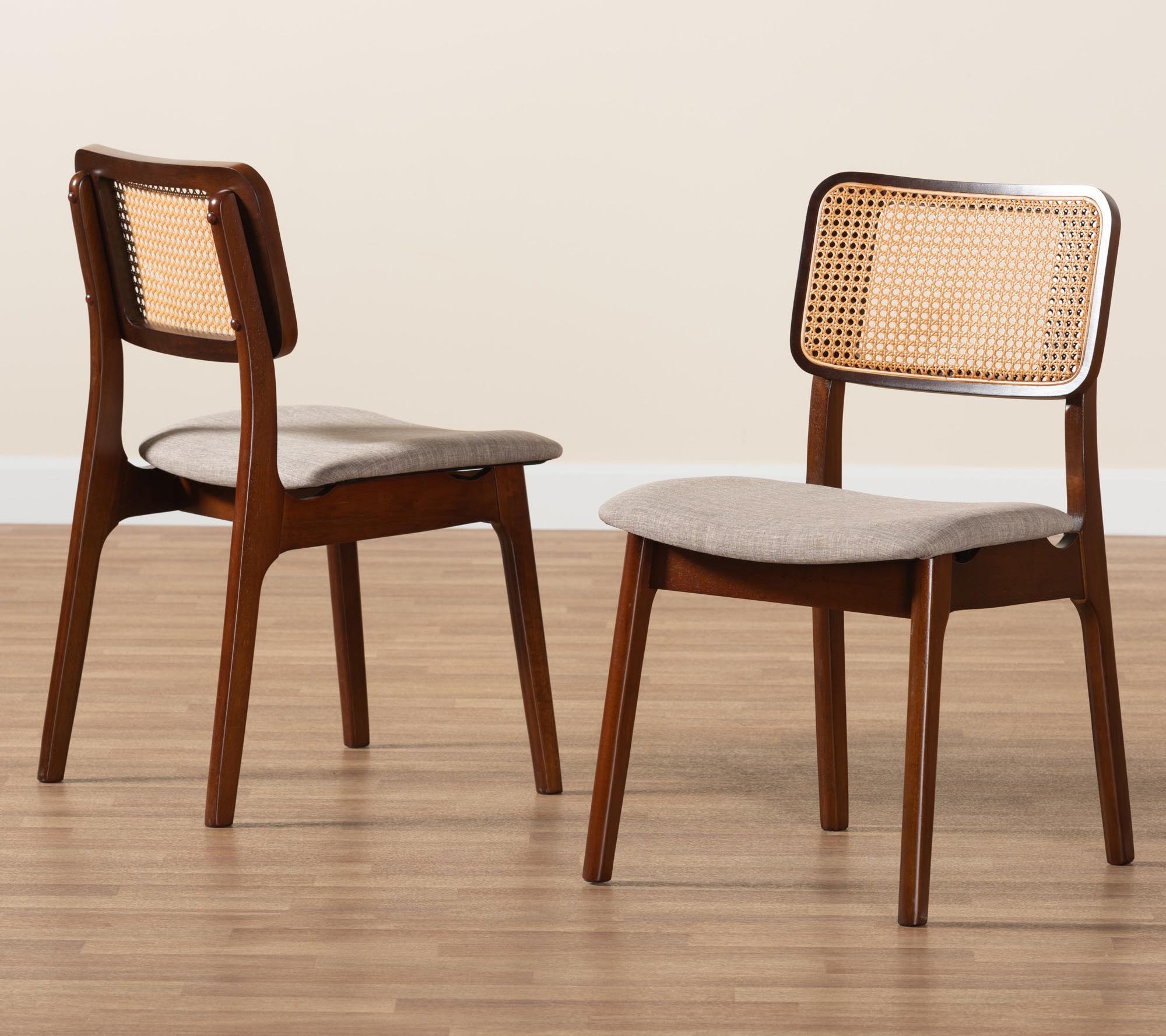 Elevate your dining experience with the Baxton Studio Dannon dining chair set, where traditional elegance meets mid-century charm. Crafted in Malaysia, these chairs feature a sturdy wood frame with woven rattan backrests, angled legs for stability, and plush foam padding upholstered in soft fabric, ensuring comfort during any dining occasion. From Baxton Studio.