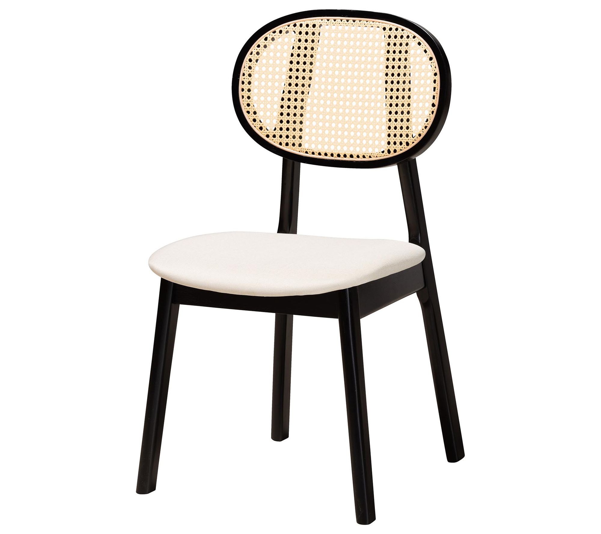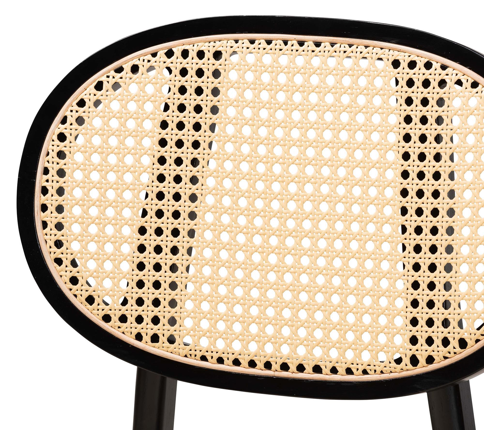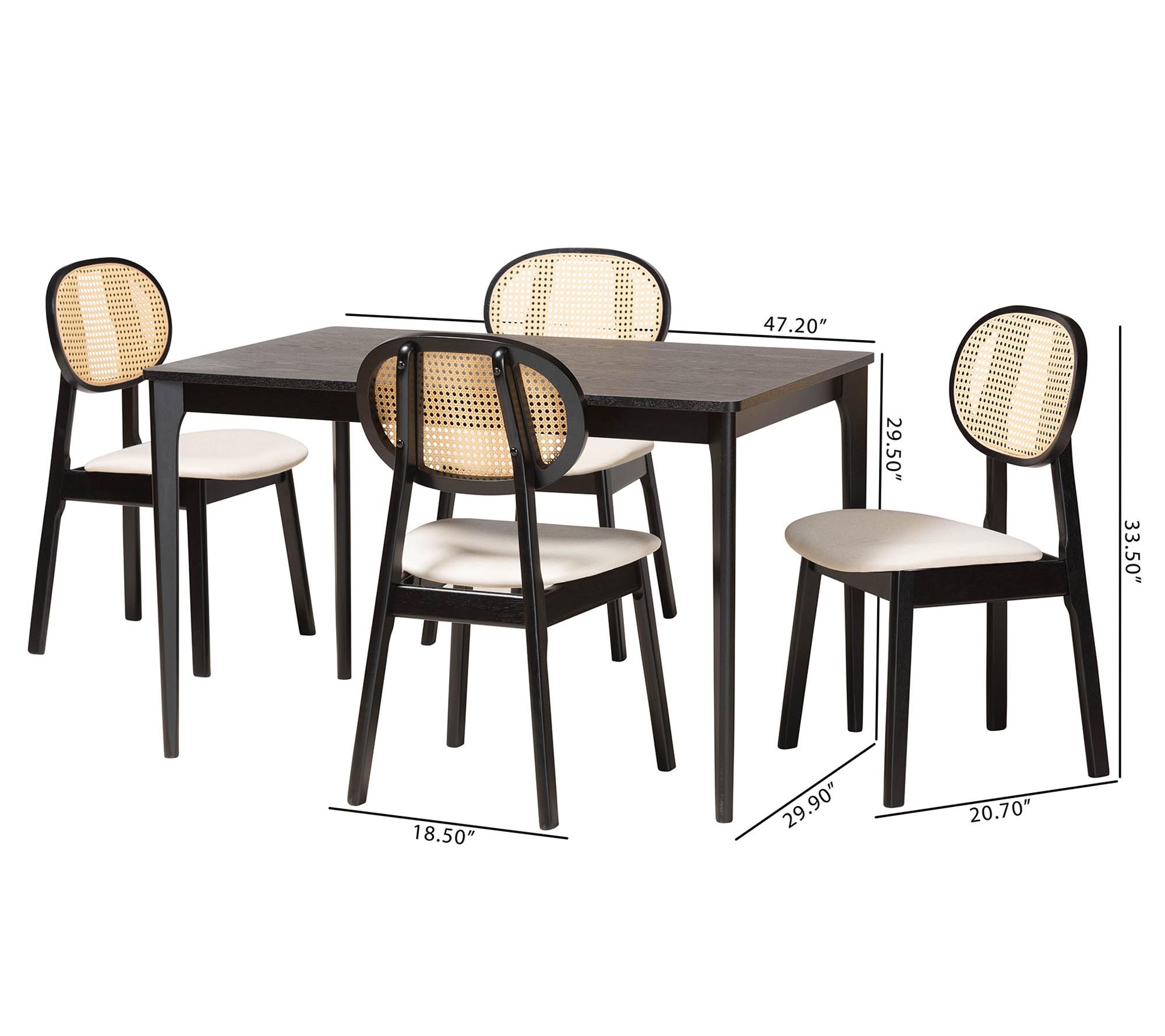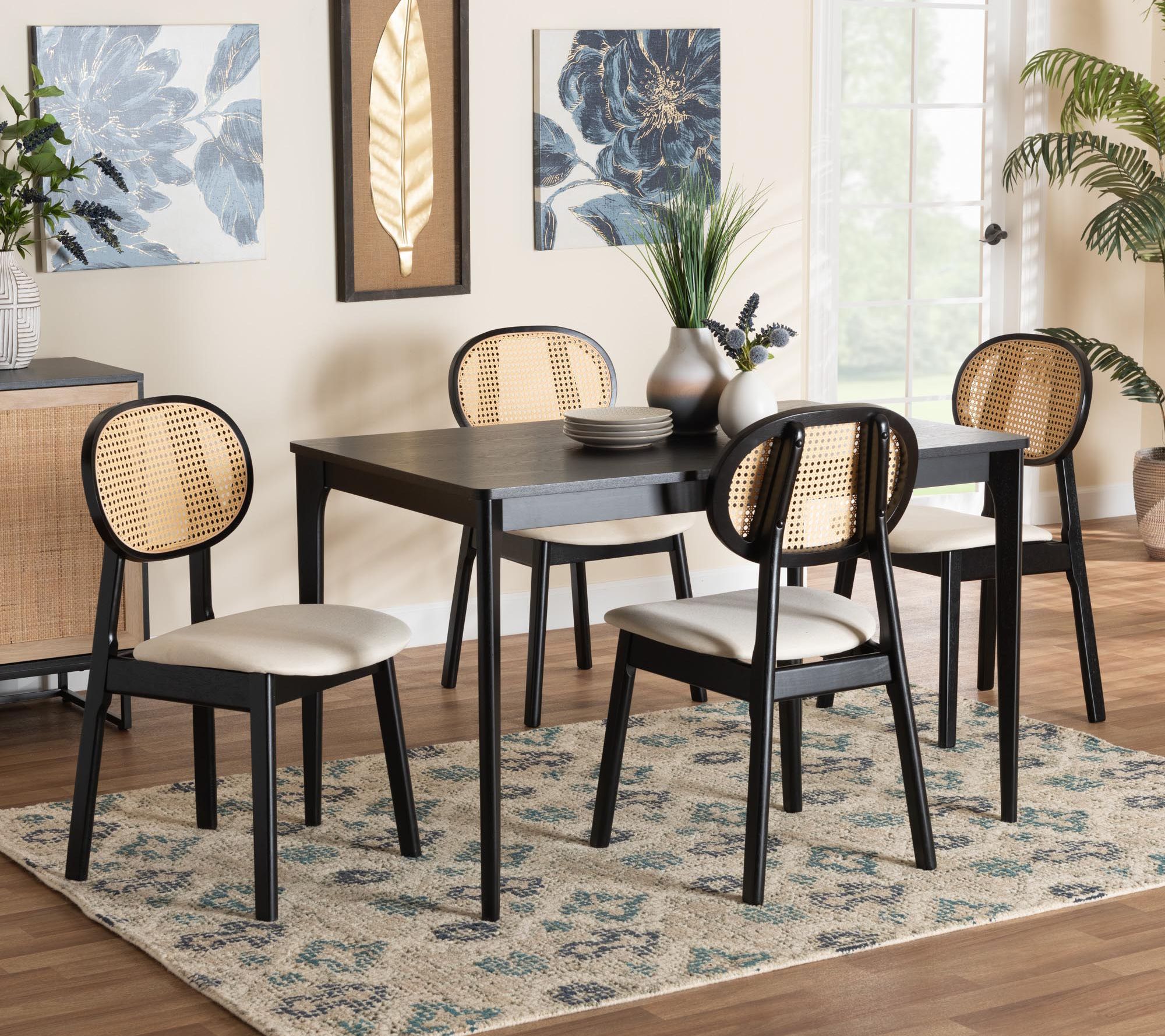 Accumulate an air of traditional elegance in your space with this five-piece dining set. Made from sturdy wood, each chair is padded with plush foam and upholstered in soft fabric, offering a lavish embrace. The round backrests are embellished with woven natural rattan, creating an alluringly cozy display. The rectangular tabletop with rounded corners provides ample space for every member of the fam. From Baxton Studio.