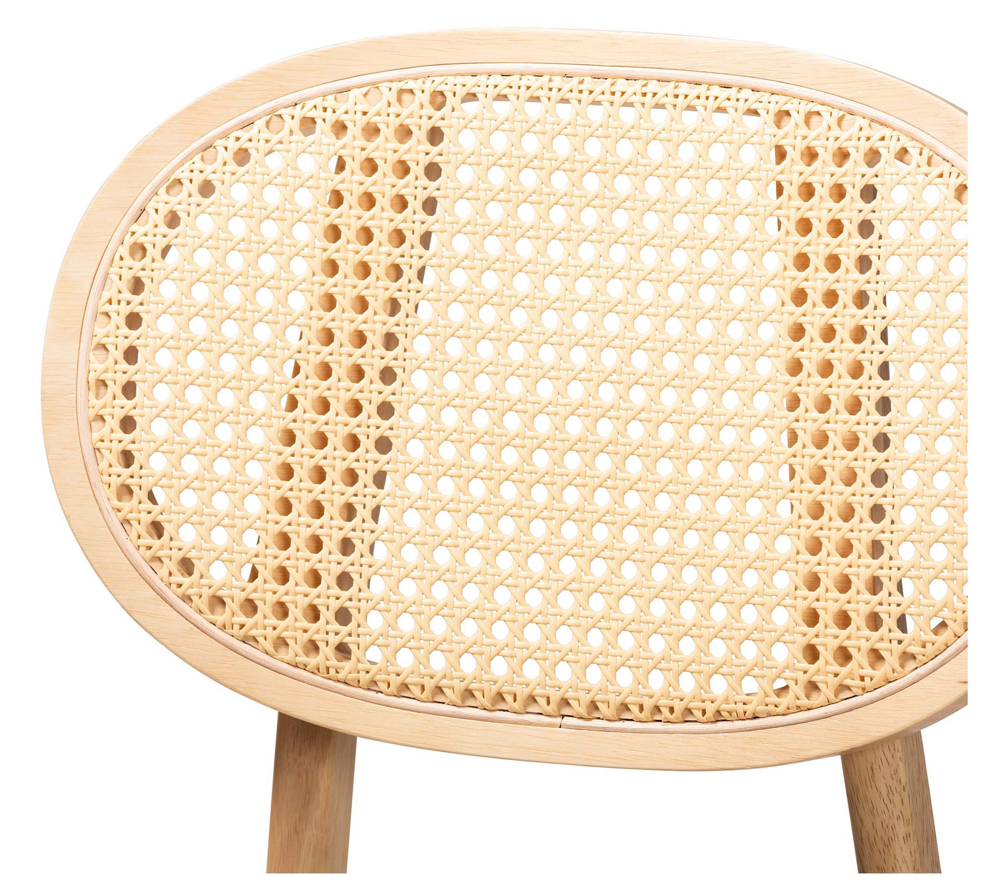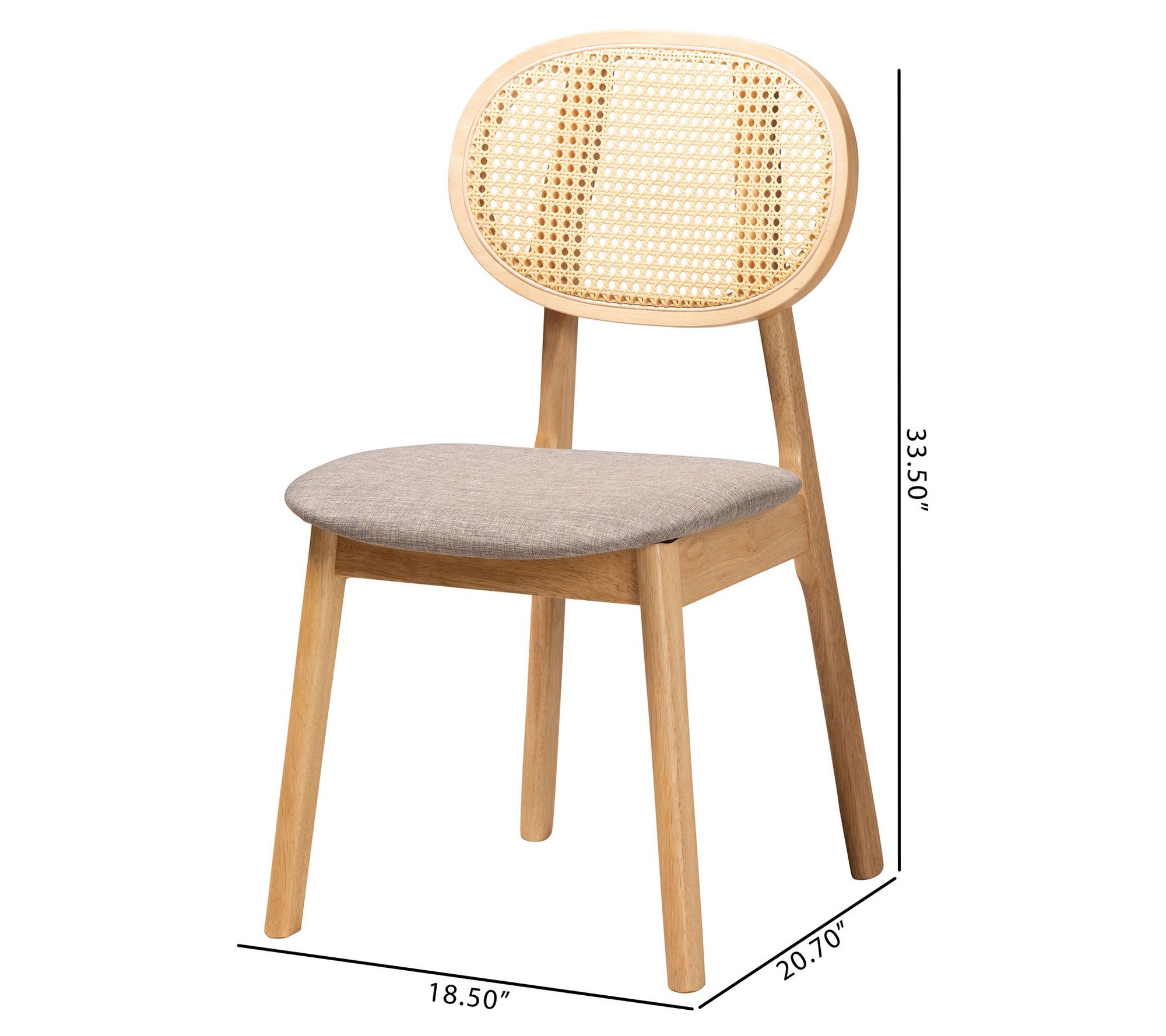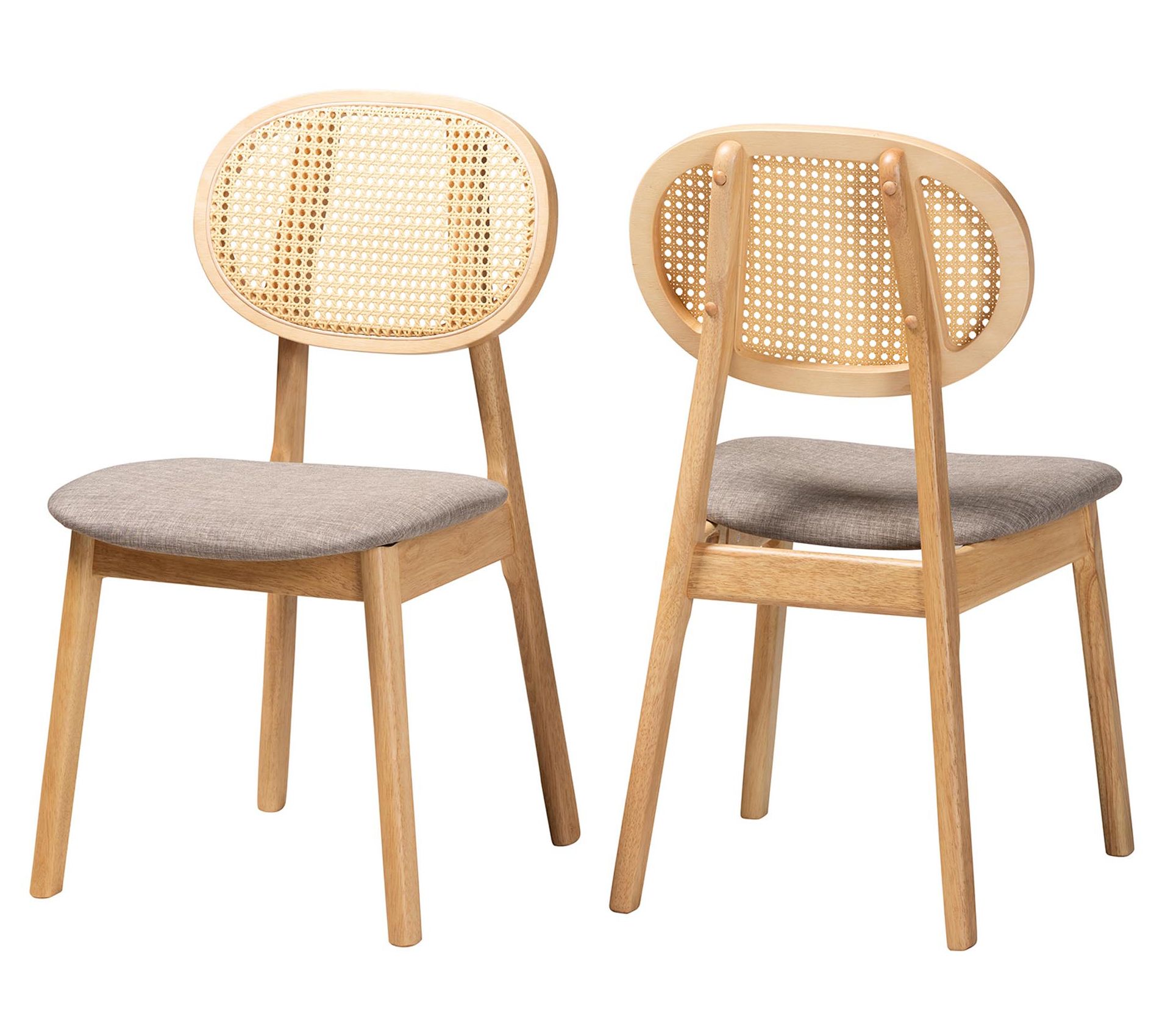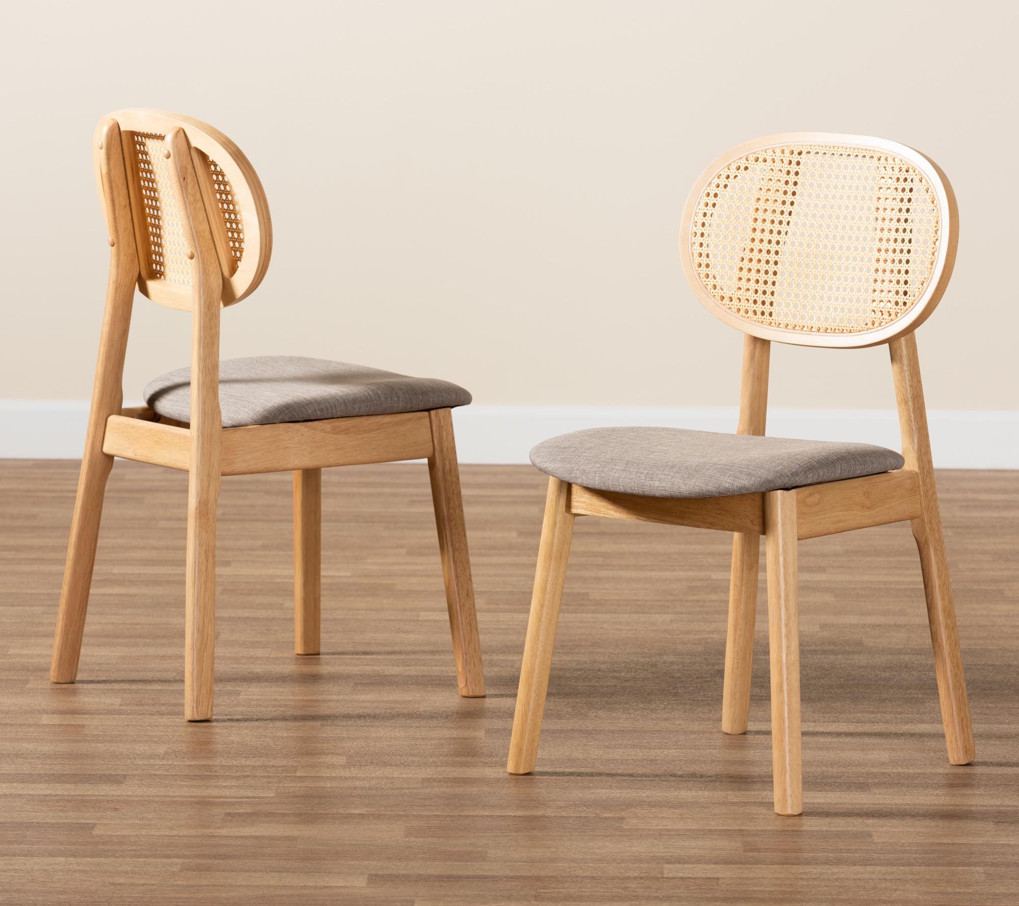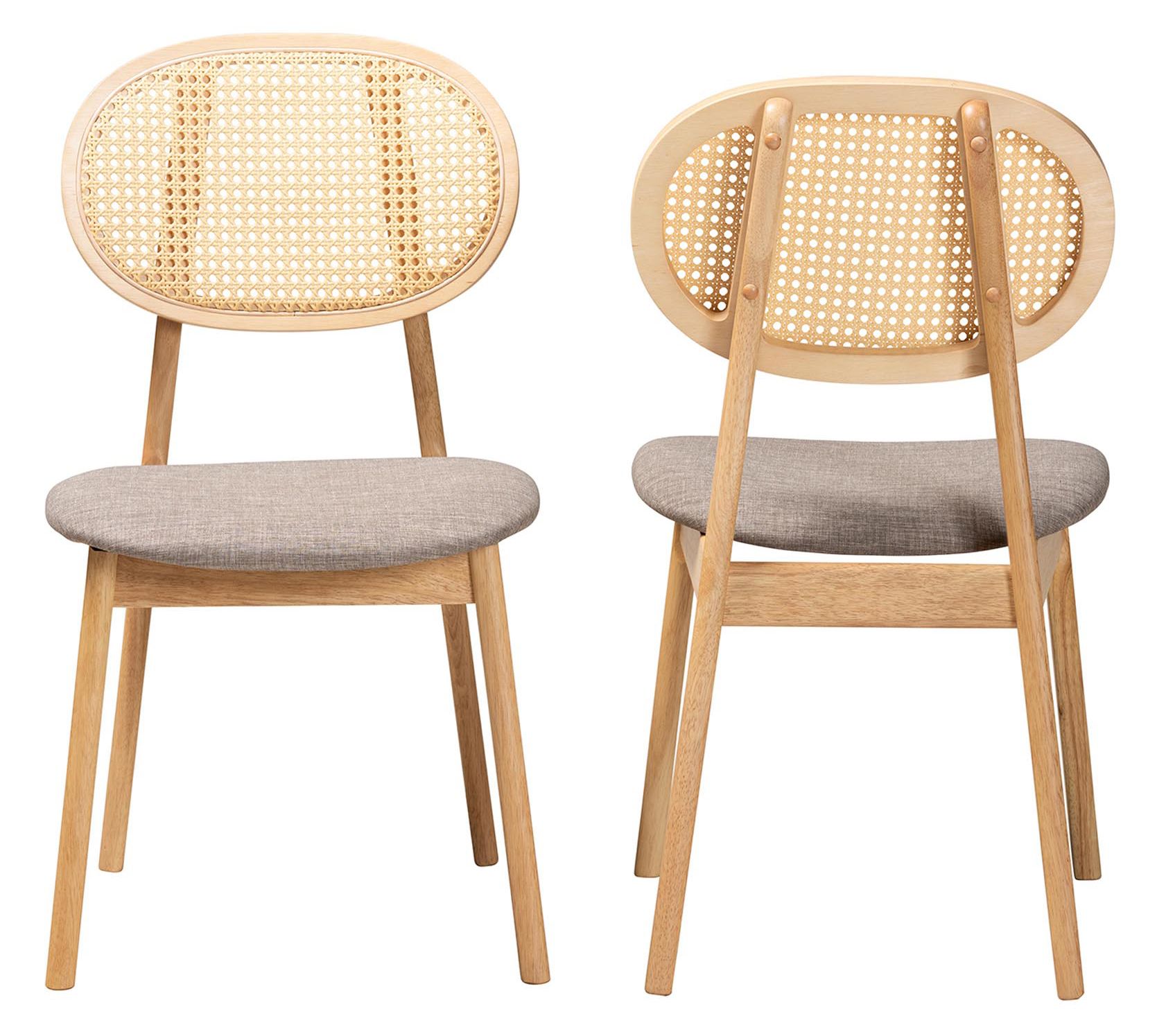 Elevate your dining experience with the Baxton Studio Darrion dining chair set, blending traditional elegance with mid-century charm. Crafted in Malaysia, this set features a wood frame adorned with woven rattan, plush foam padding, and soft fabric upholstery for comfort and style. The curved backrest and angled legs ensure both support and a distinctive look, making these chairs a captivating addition to any dining area. From Baxton Studio.