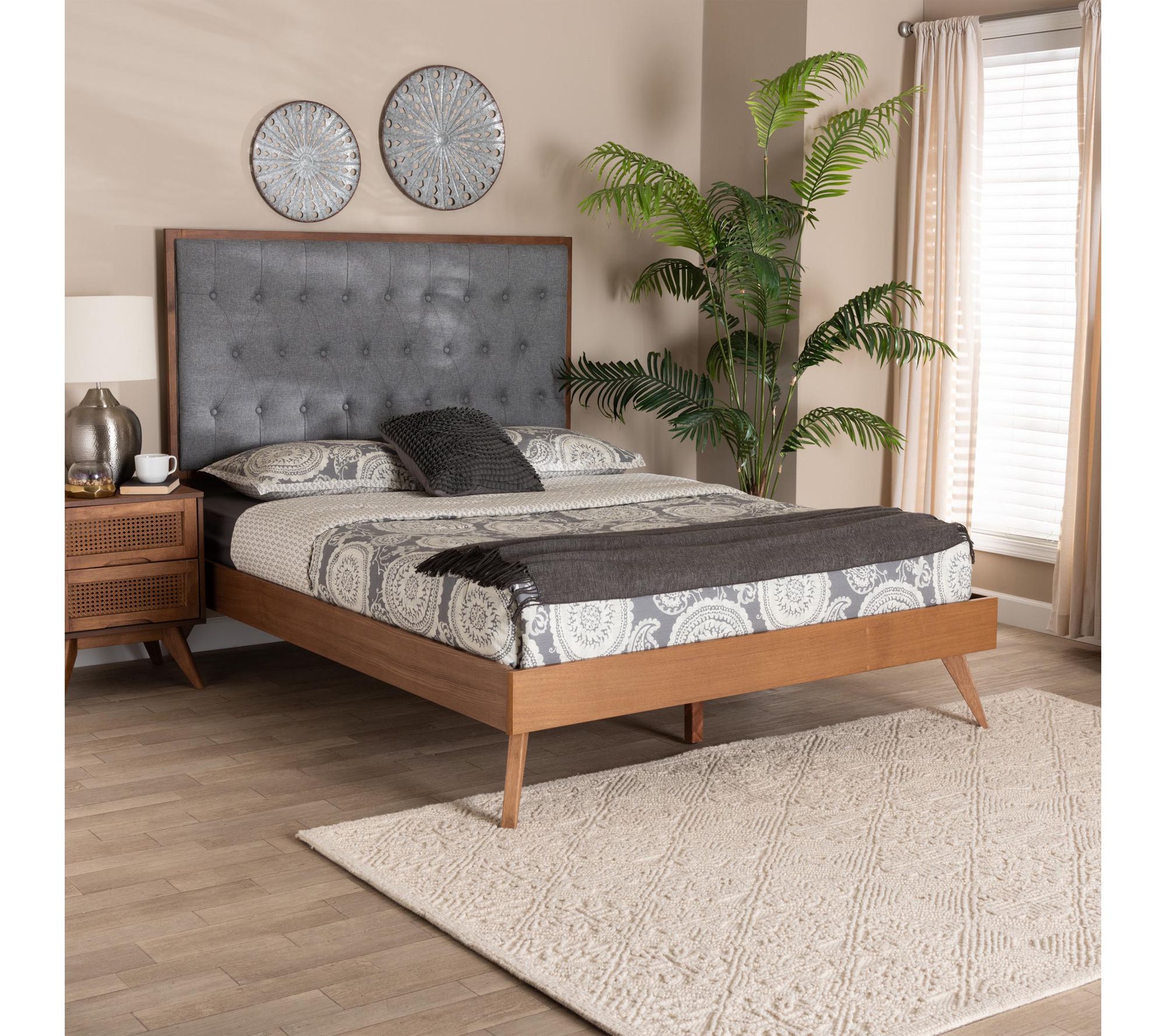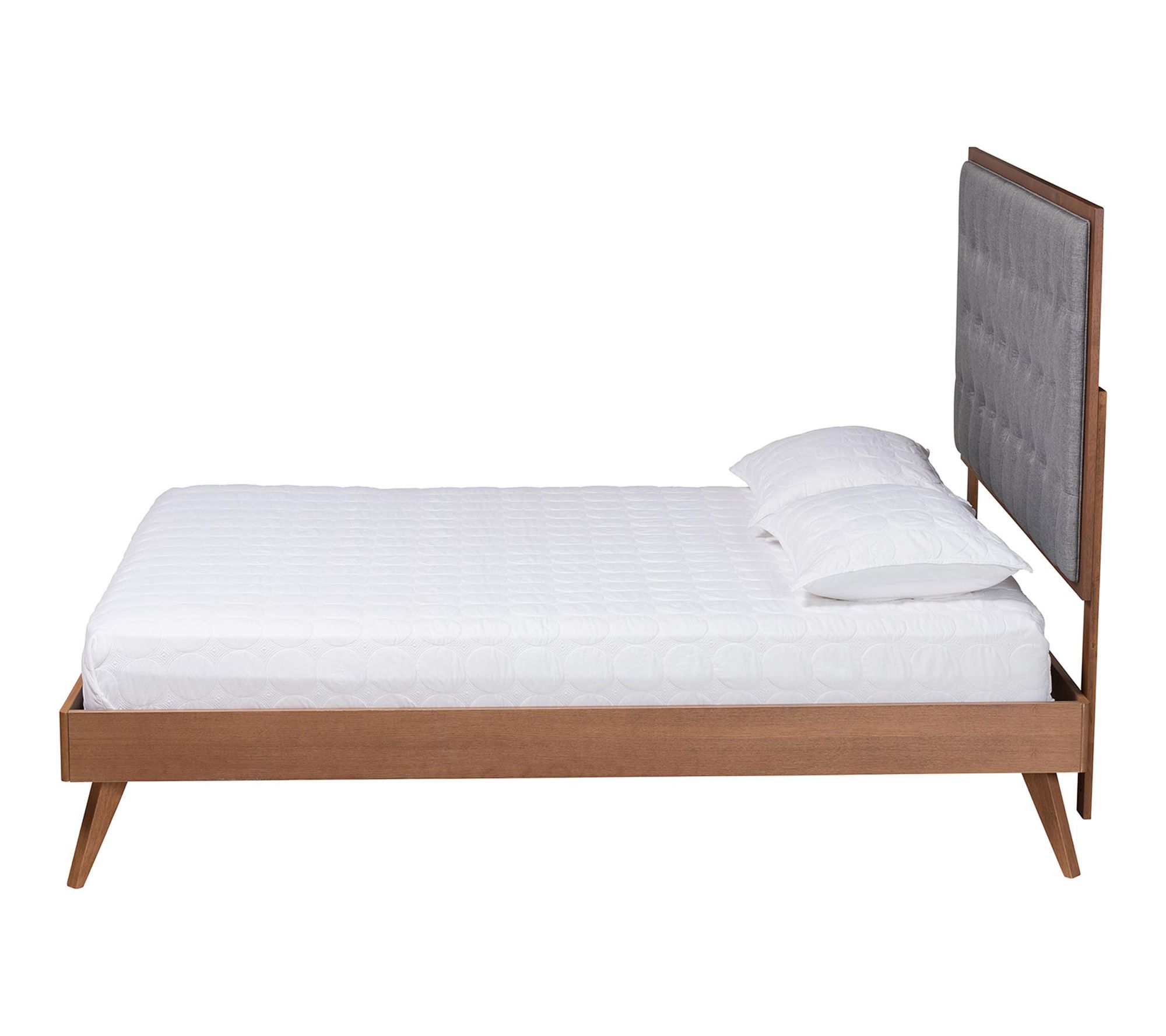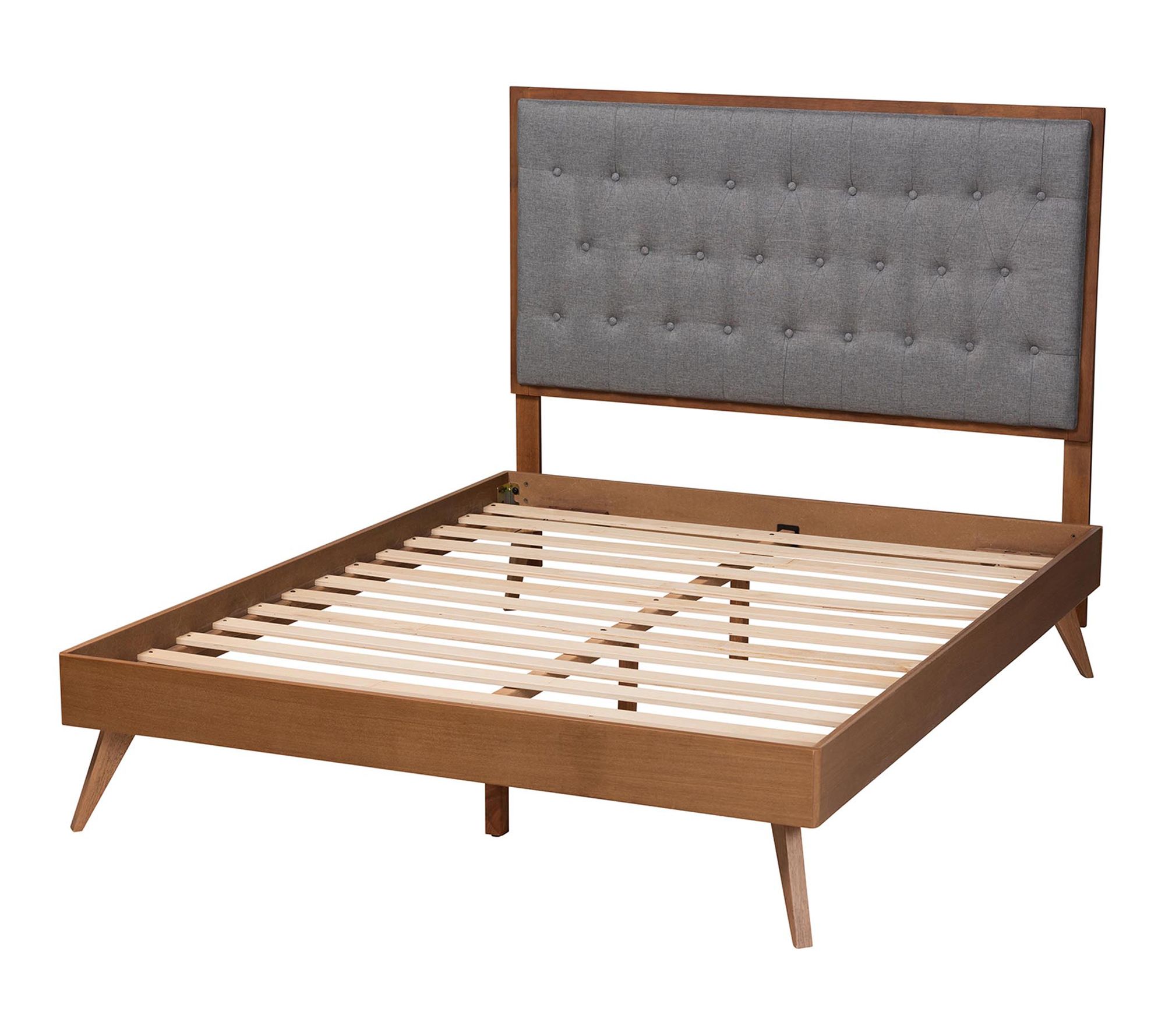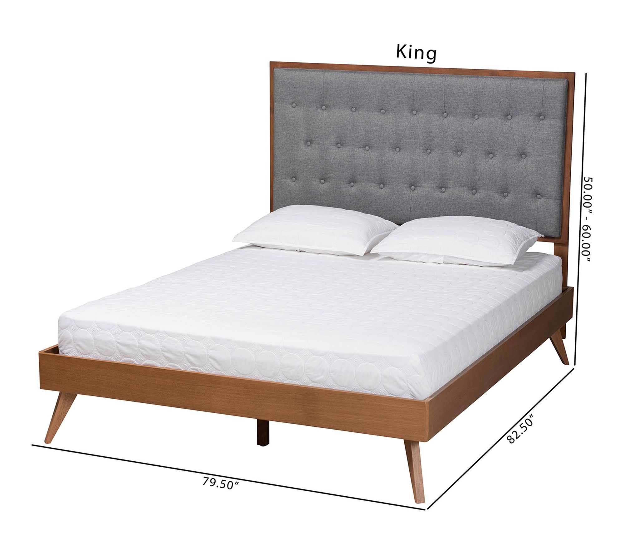 Drift off into comfort and style with this timeless King platform bed, combining a foam-padded, button-tufted headboard and rich wood tones to create a warm, inviting retreat. The elegant fabric upholstery provides a cozy backdrop, while angled, tapered legs infuse retro-inspired charm -- making every night feel like a relaxing getaway. From Baxton Studio.
