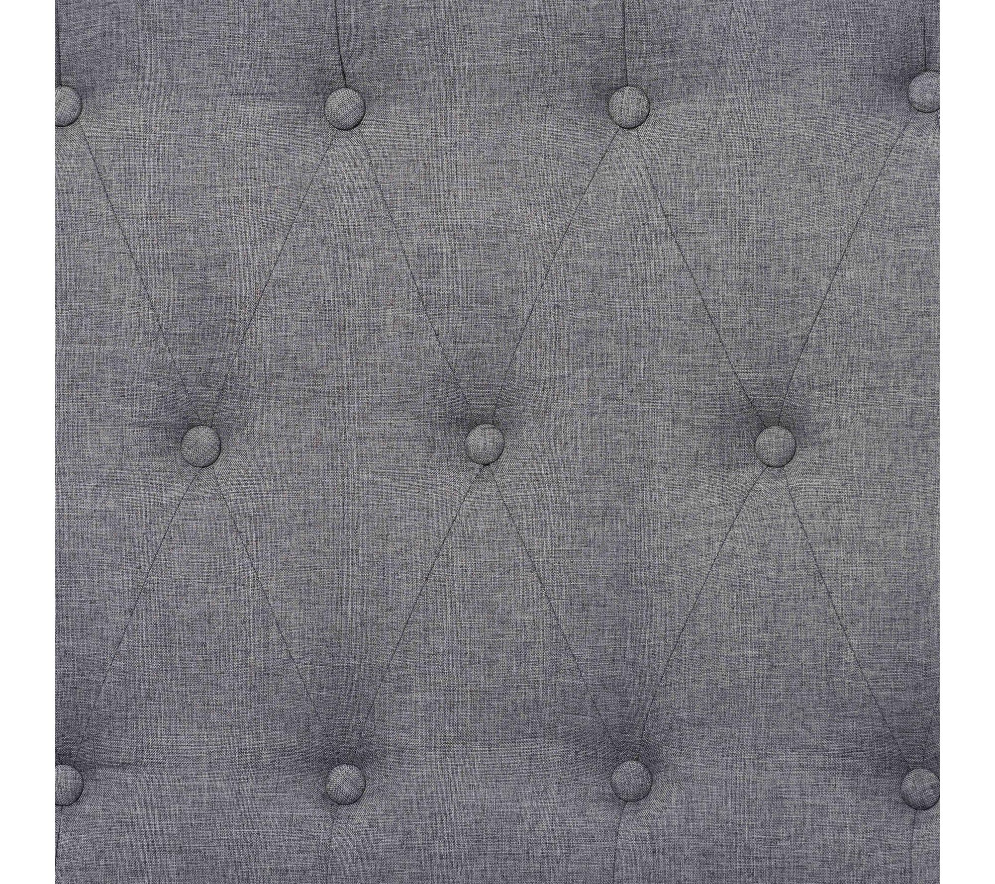 • Features foam-padded, button-tufted headboard; fabric upholstery; wood slats for mattress support; angled, tapered legs; no box spring required