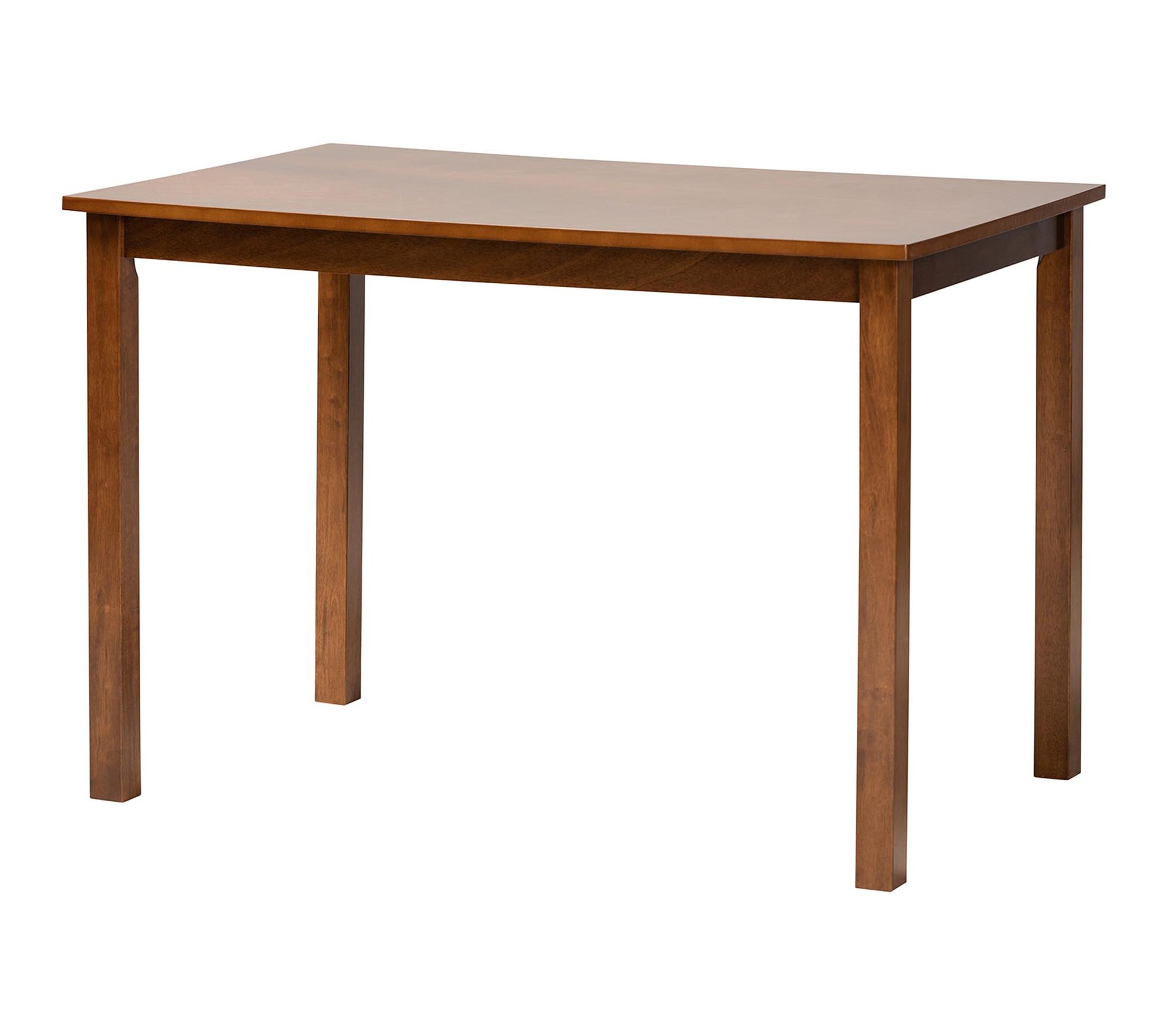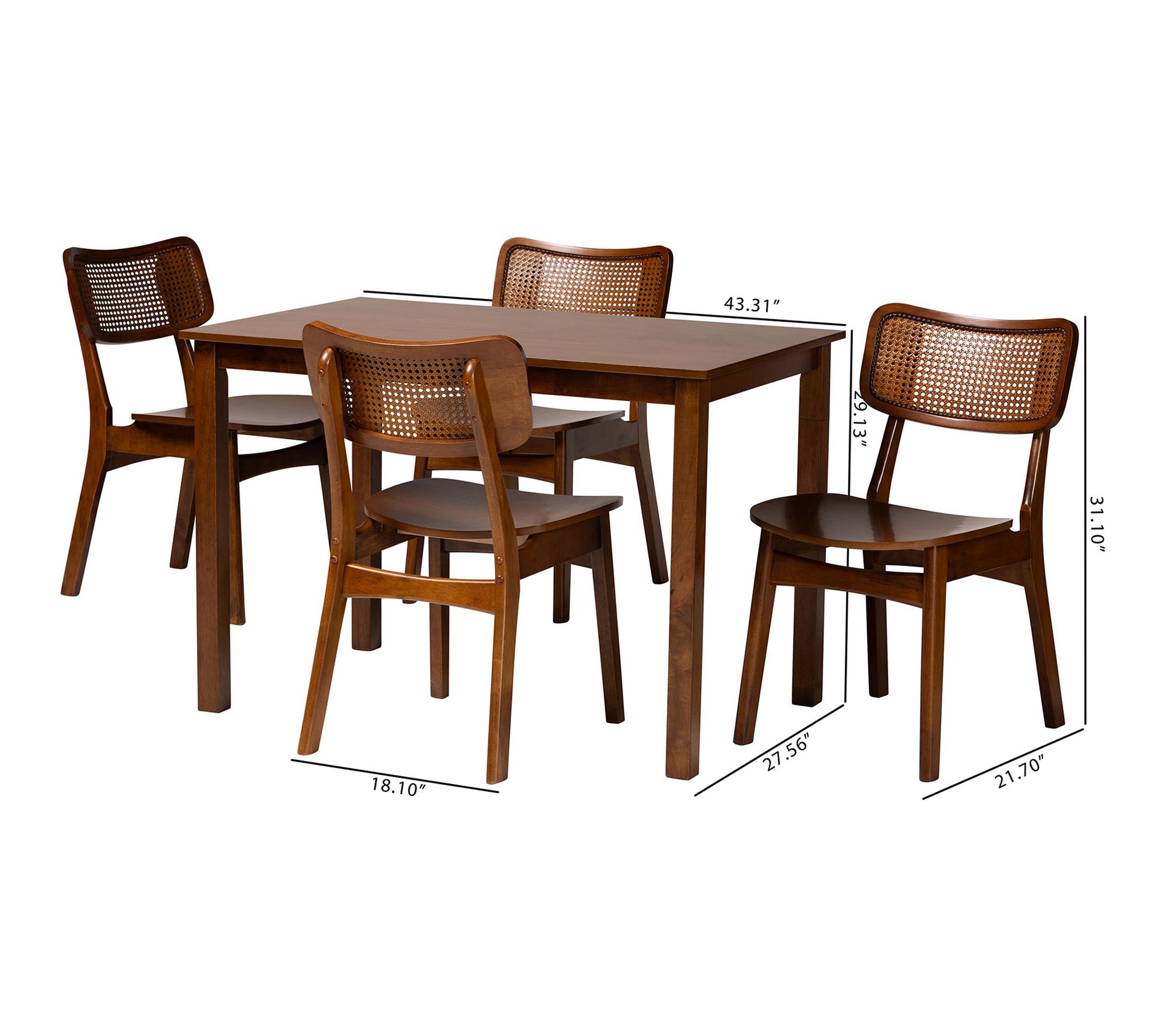 Serve casual dinners or host family gatherings in timeless style with this mid-century dining set, featuring a wood table and four chairs accented by woven synthetic rattan backrests. The curved seats invite comfort, while the rectangular tabletop offers plenty of space for shared meals and conversation. From Baxton Studio.