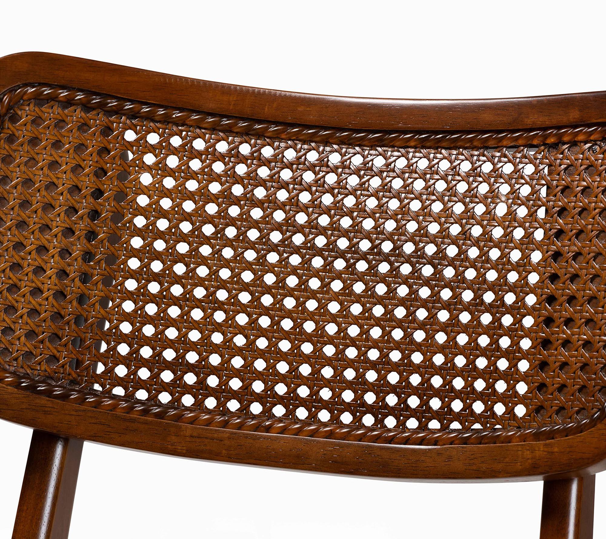 • Curved chair backrests with woven synthetic rattan; smooth bent seats; crisp-edged rectangular tabletop