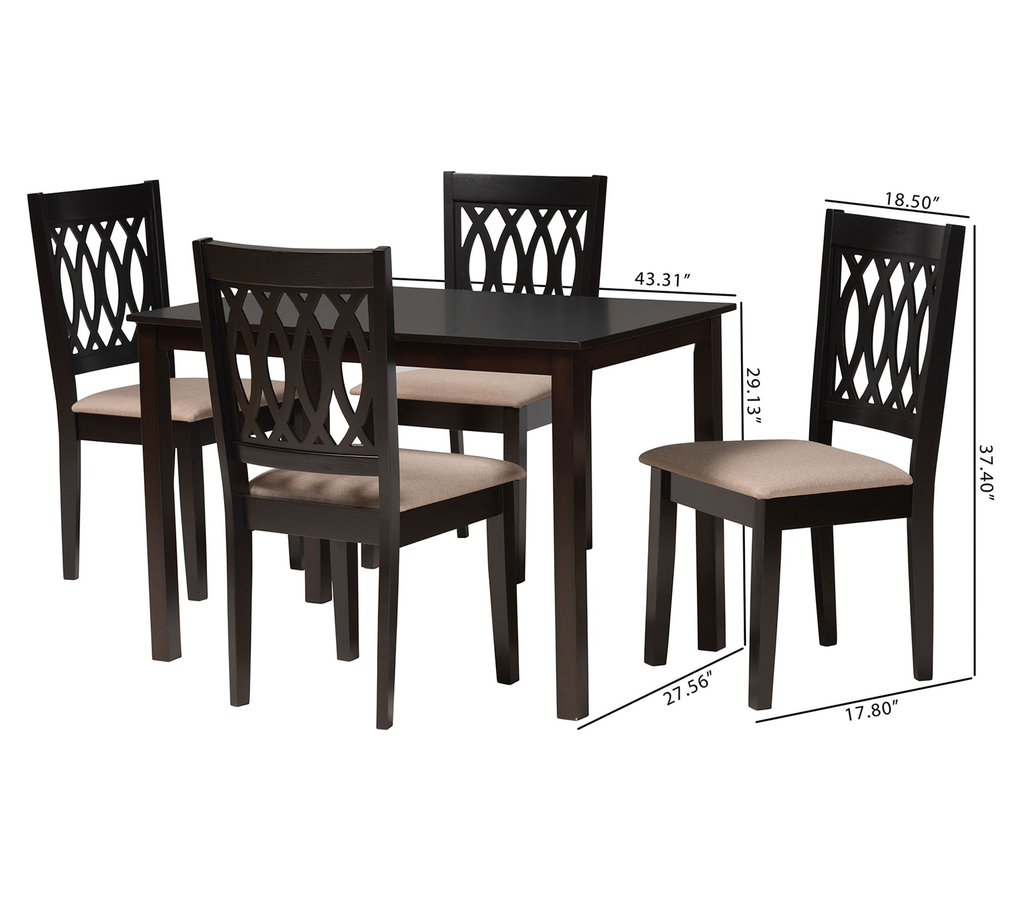 • Measurements: Table 43.31"W x 27.56"D x 29.13"H; Chair 18.50"W x 17.80"D x 37.40"H