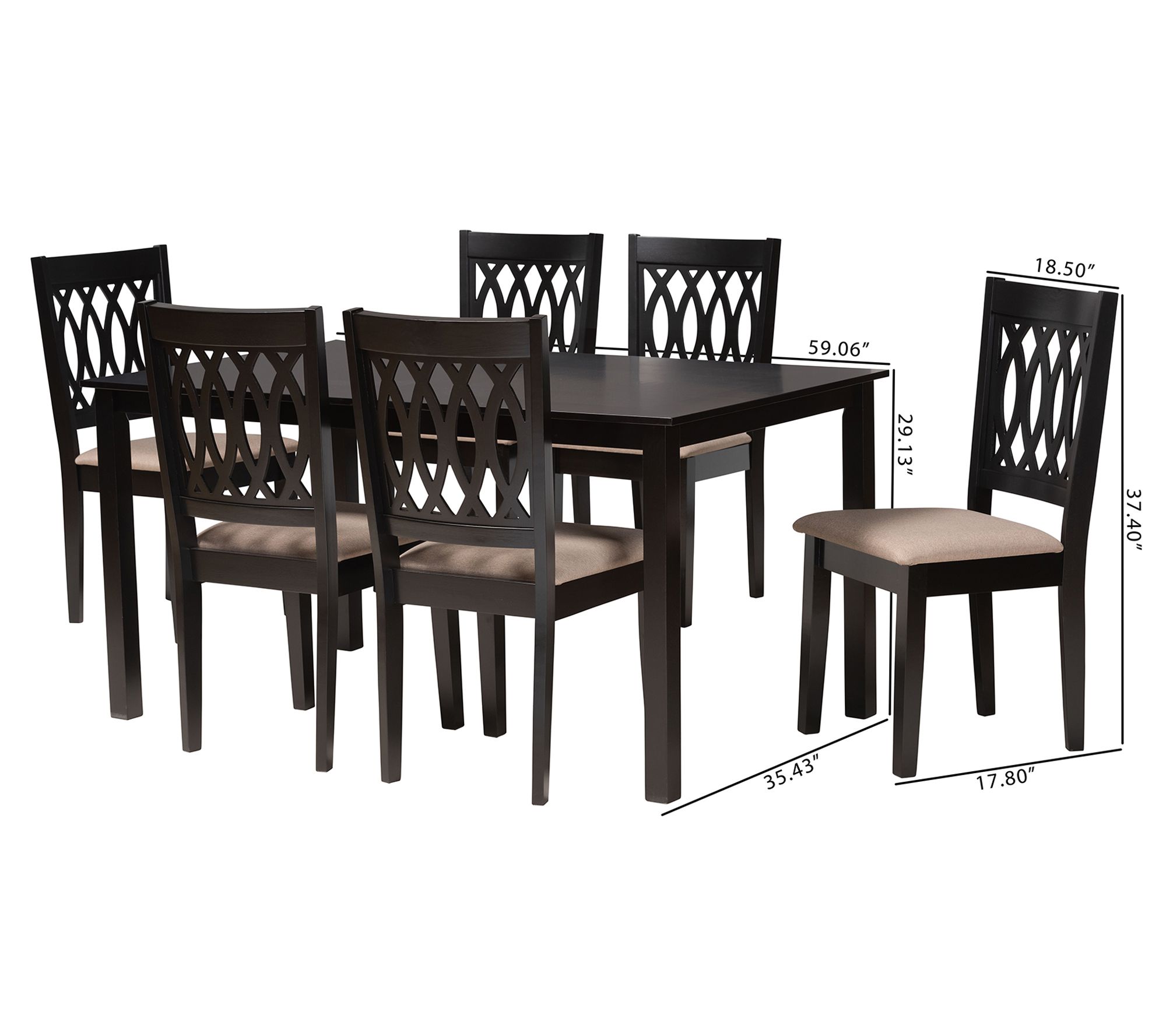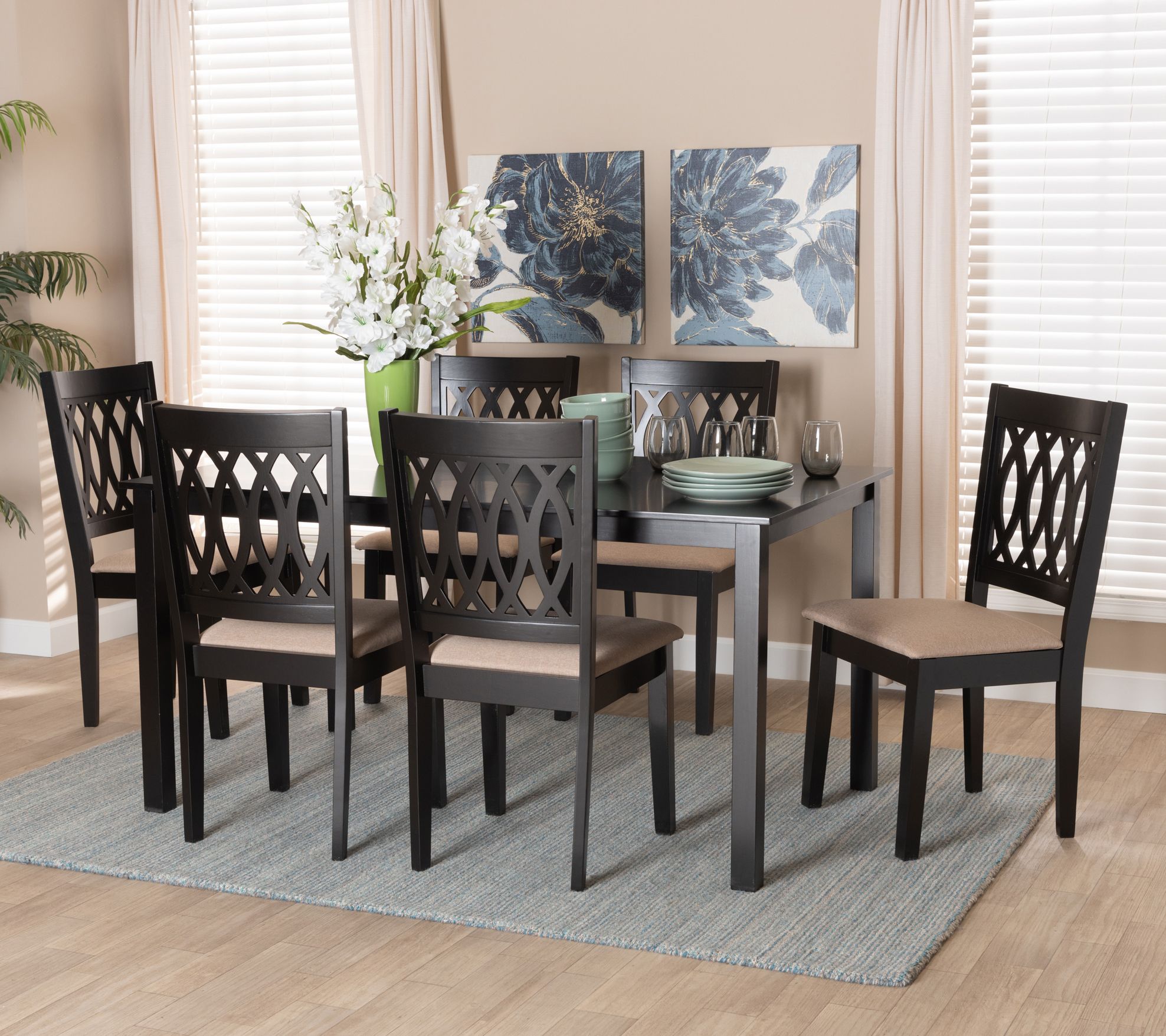 Make your dining room the heart of your home with the elegant Florencia dining set. Perfect for gatherings, the set includes six chairs and a spacious rectangular table. The chairs are upholstered in plush fabric and feature cut-out backrests for a touch of modern style. The sleek tabletop offers ample space for meals, homework, or game nights. From Baxton Studio.