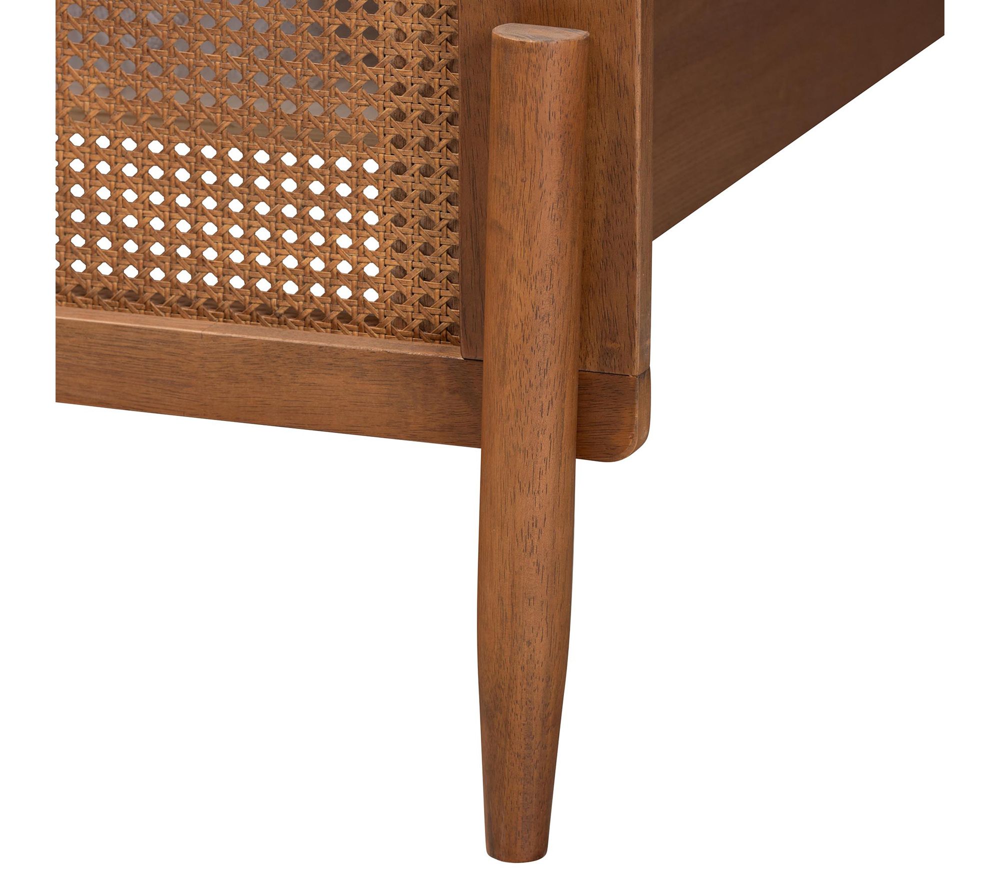 Create a serene sanctuary in your bedroom with the mid-century inspired Gardwin platform bed. Crafted from sturdy wood and detailed with woven rattan, this piece brings a touch of classic elegance to your space. The openwork headboard and footboard add an airy feel, while the tapered legs enhance its refined charm. From Baxton Studio.