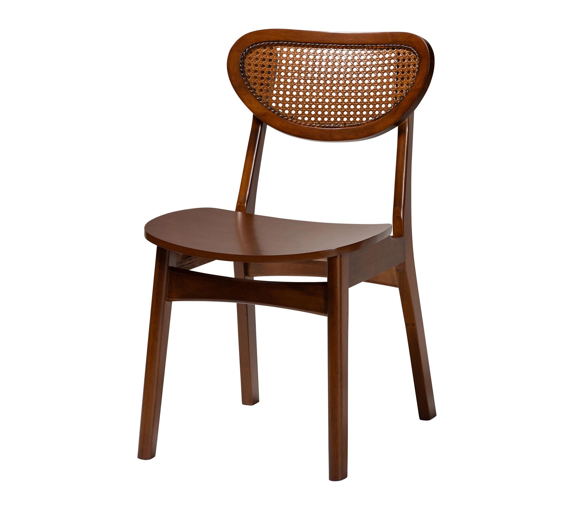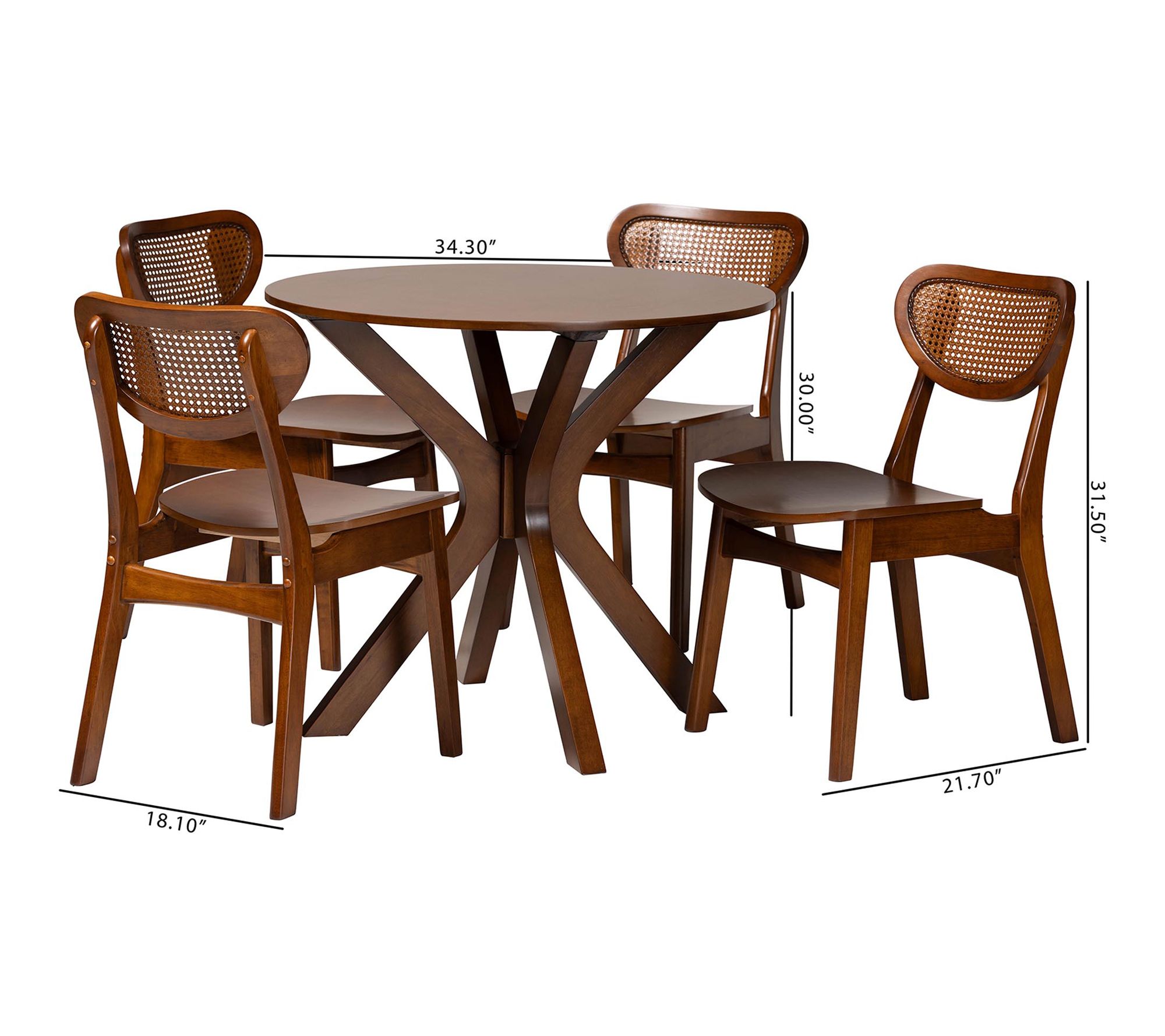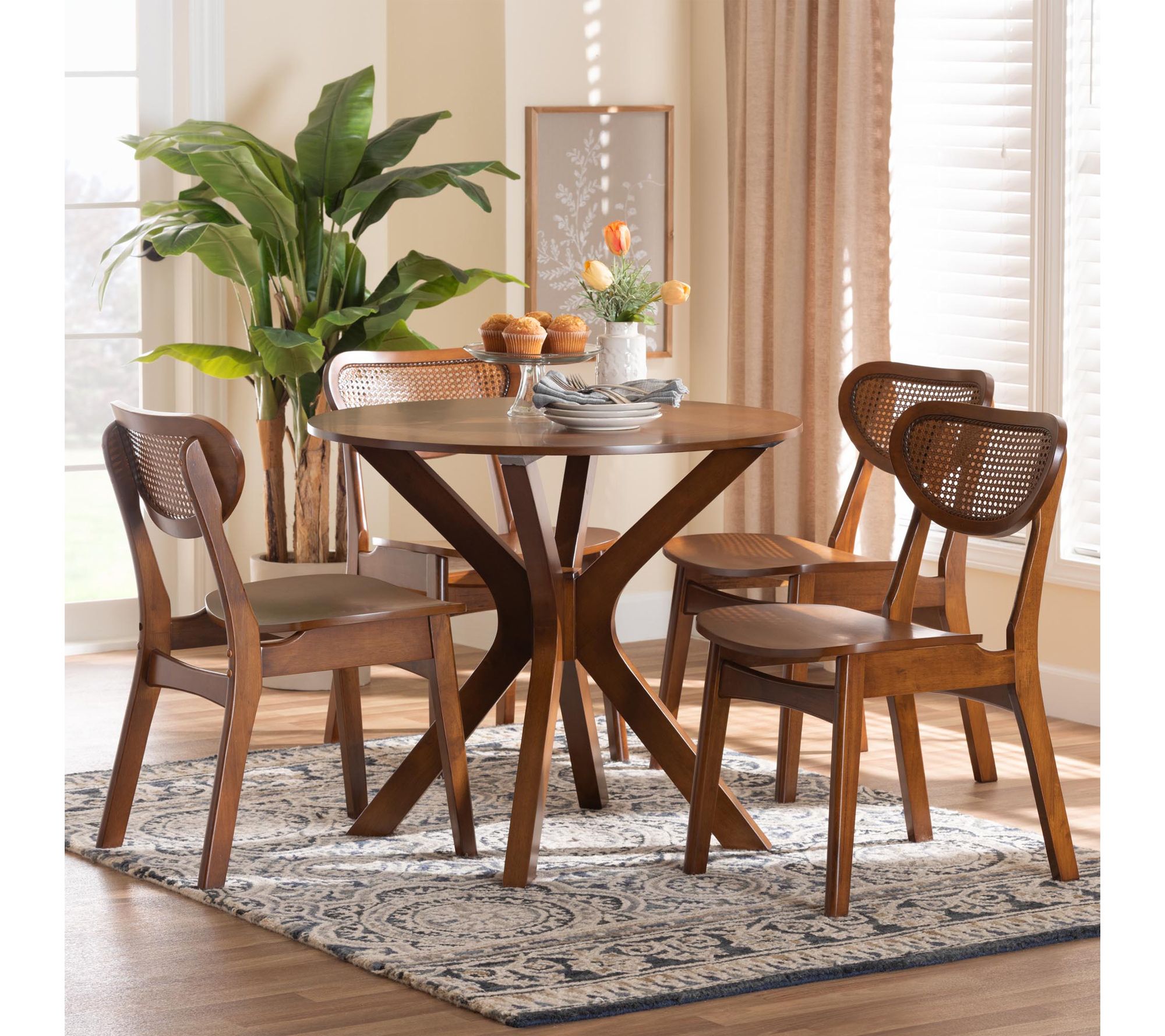 Share relaxed meals and cozy moments together with this dining set, where a circular table and four mid-century chairs invite everyone to linger just a bit longer. Delight in the woven detail of the rattan-backed seats and the inviting finish, crafted to complement your kitchen or dining space for both quiet dinners and lively gatherings. From Baxton Studio.