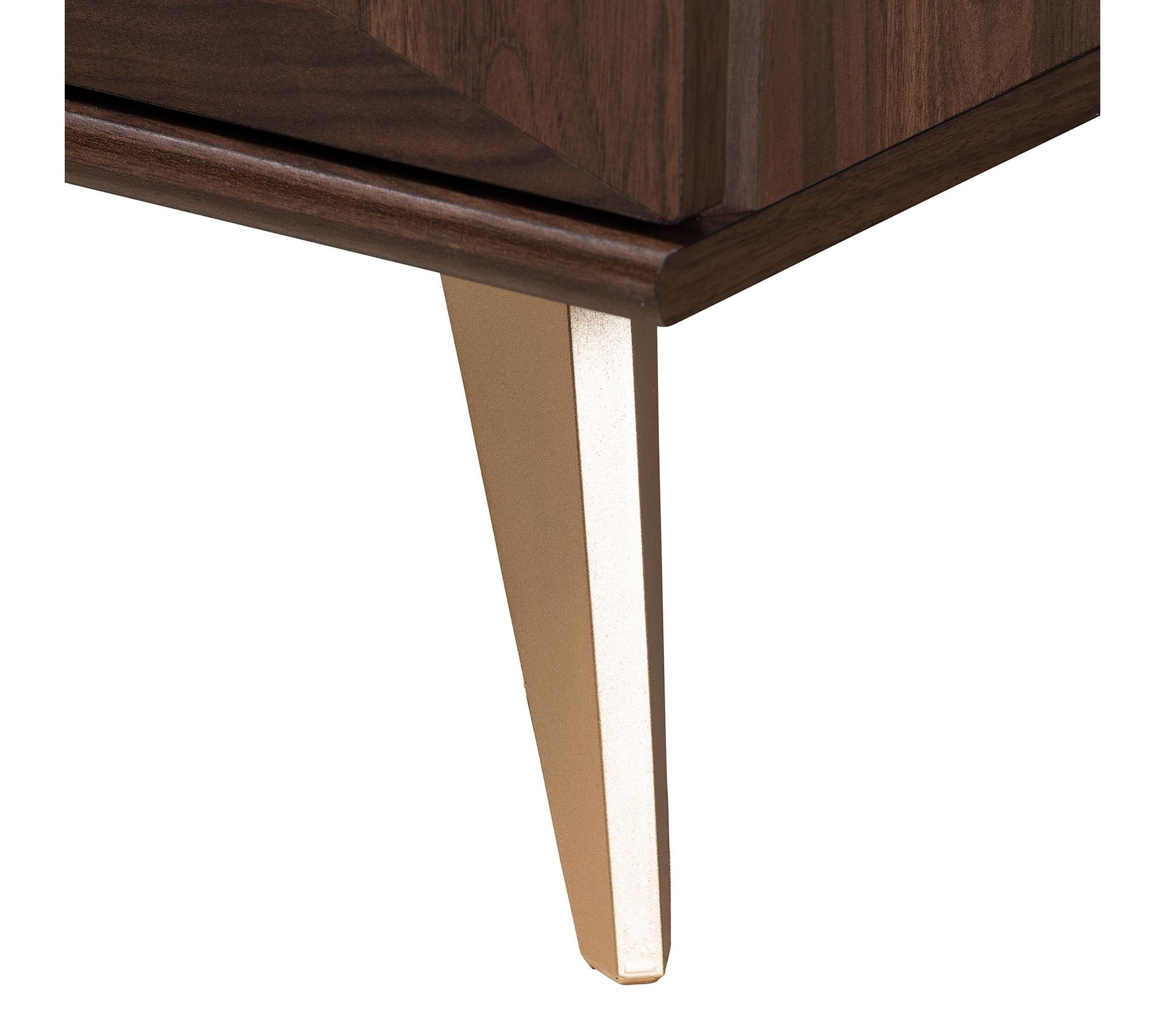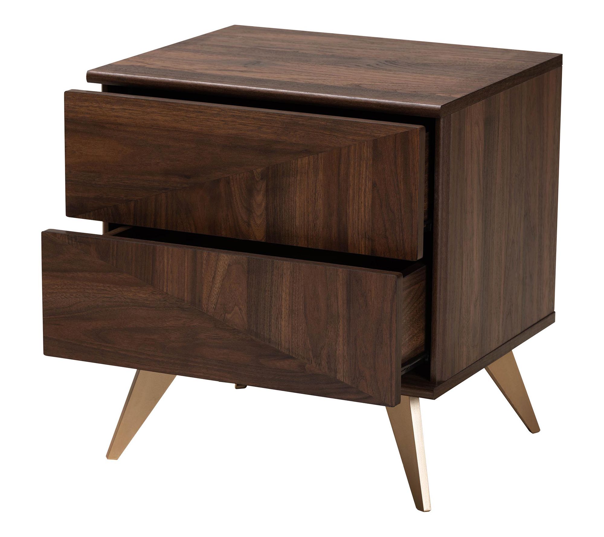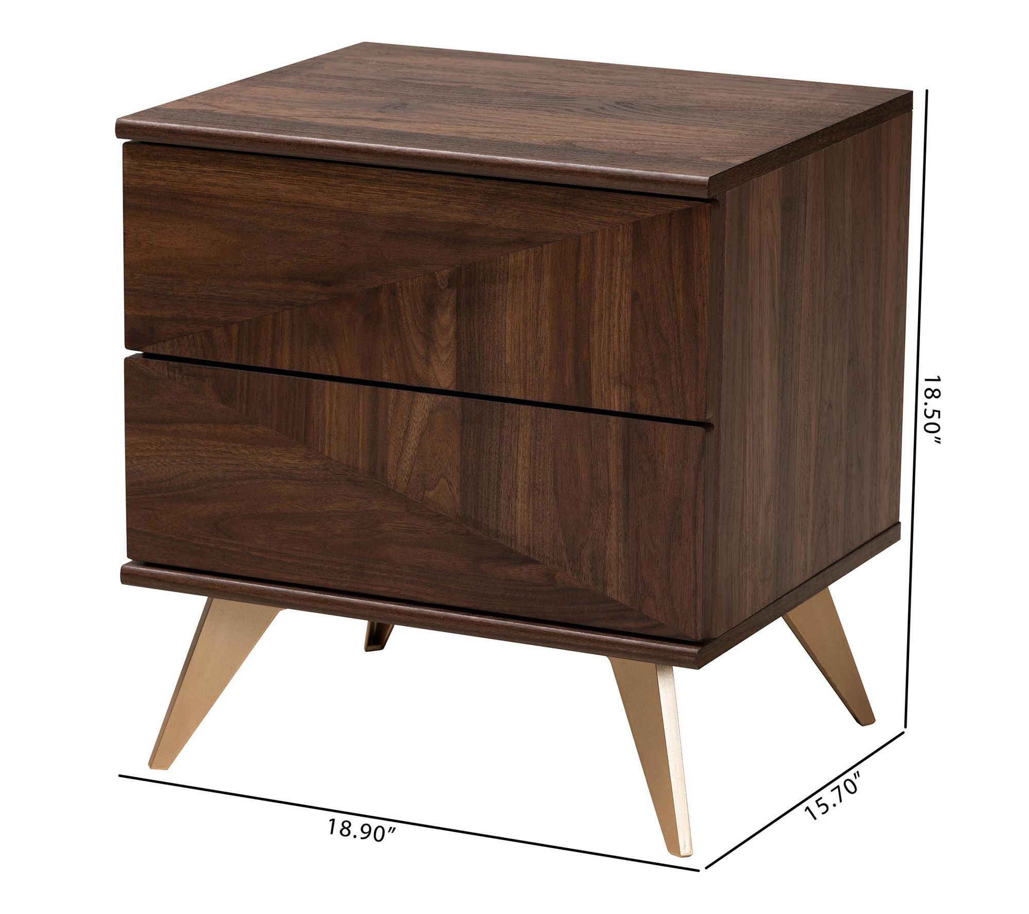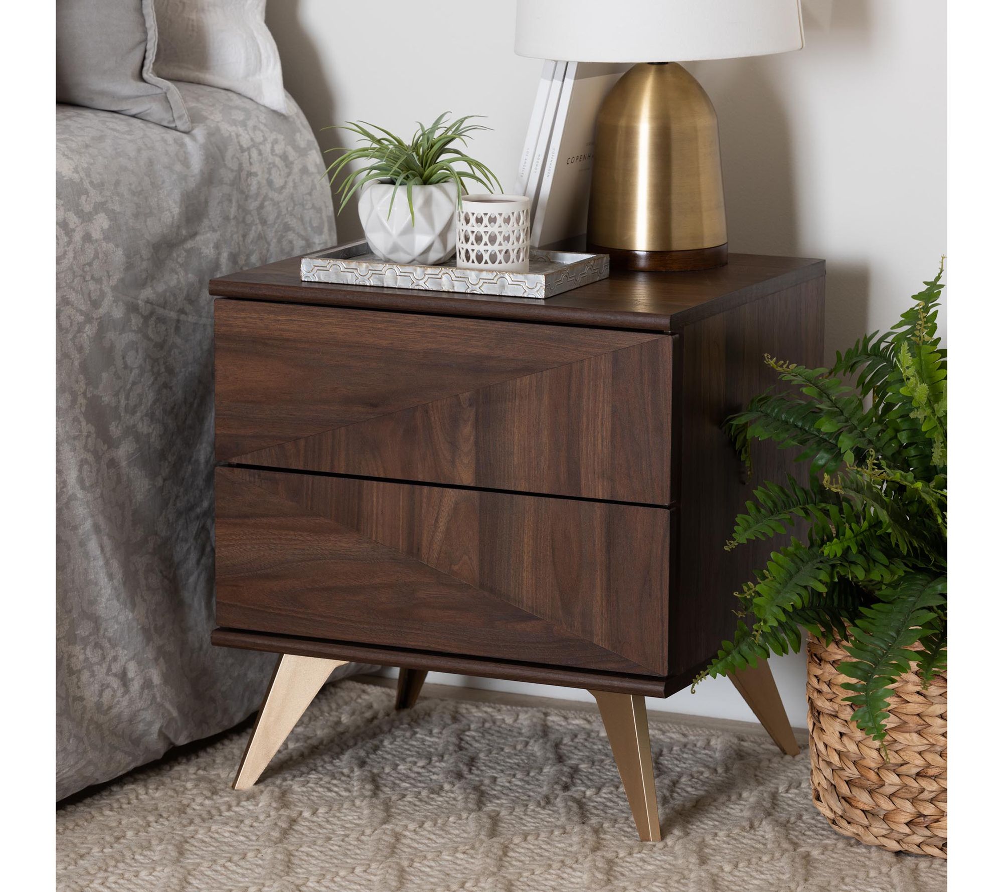 Add a touch of rustic charm to your bedside with the Graceland walnut wood nightstand from Baxton Studio. This mid-century inspired piece features a sturdy wood frame with a vibrant grain design and two handleless drawers for convenient storage. The sleek geometry and expressive angled legs add a modern touch to any bedroom decor. From Baxton Studio.