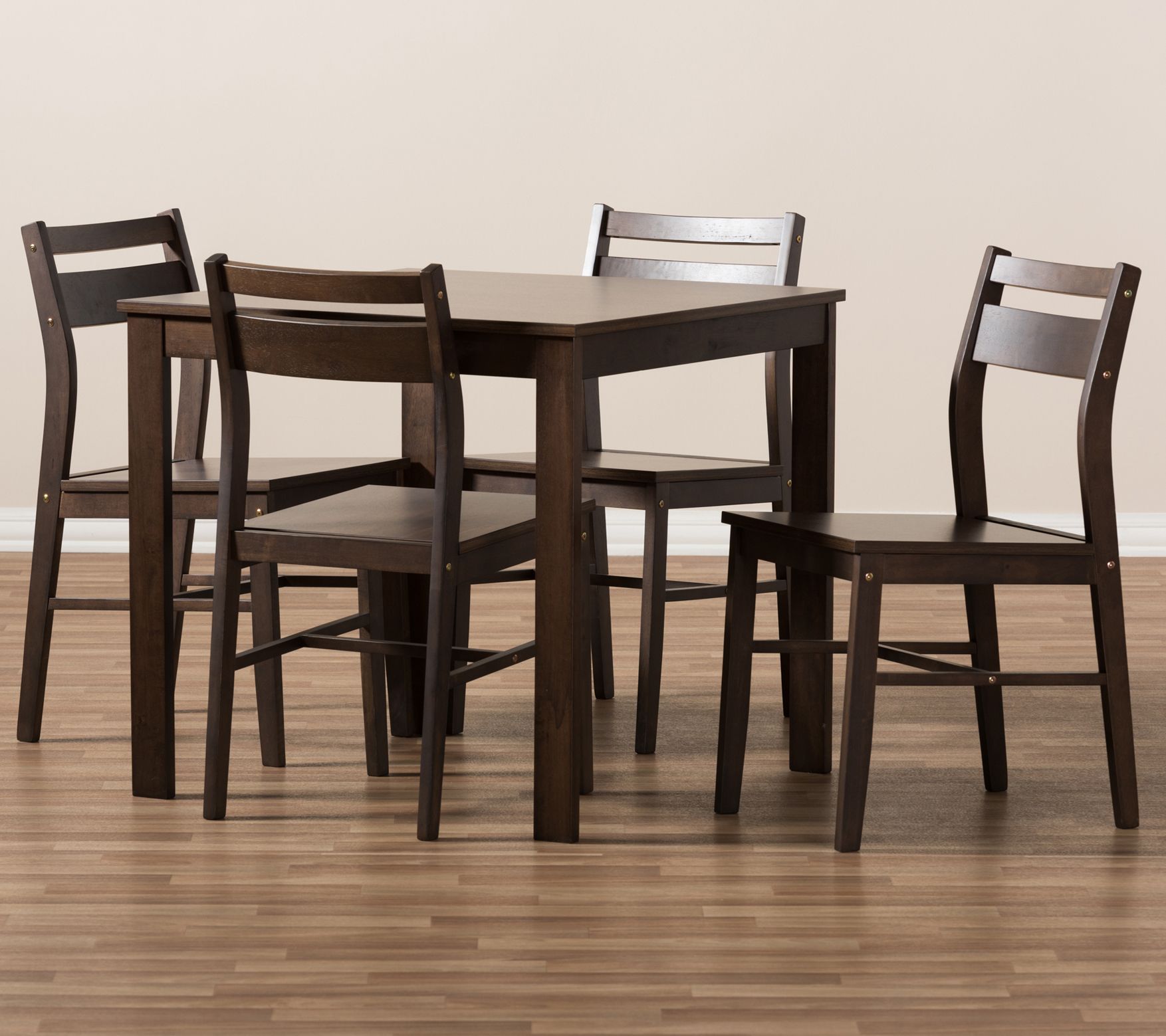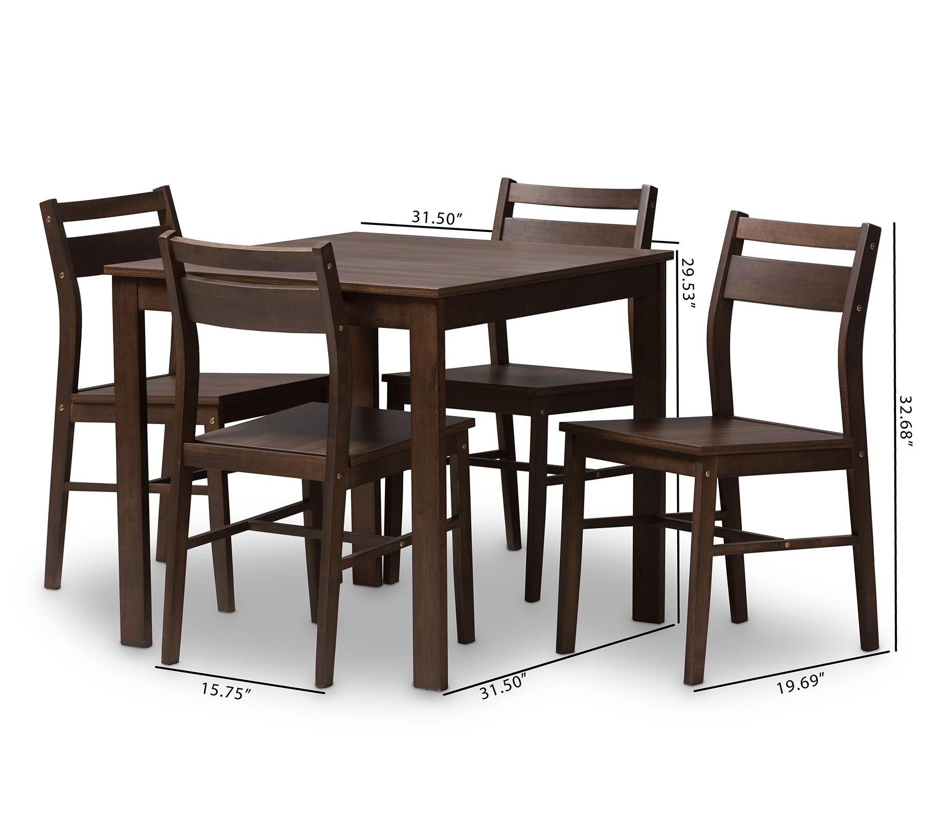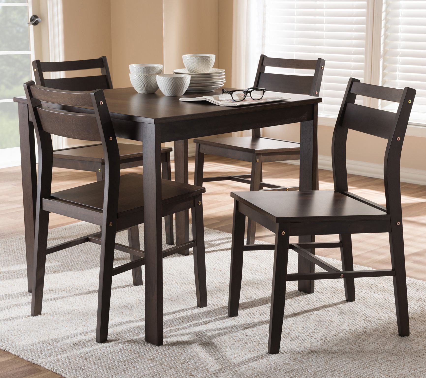 The walnut finish and sleek, streamlined design in this compact dining set deliver a contemporary look to rejuvenate your eating area. From Baxton Studio.