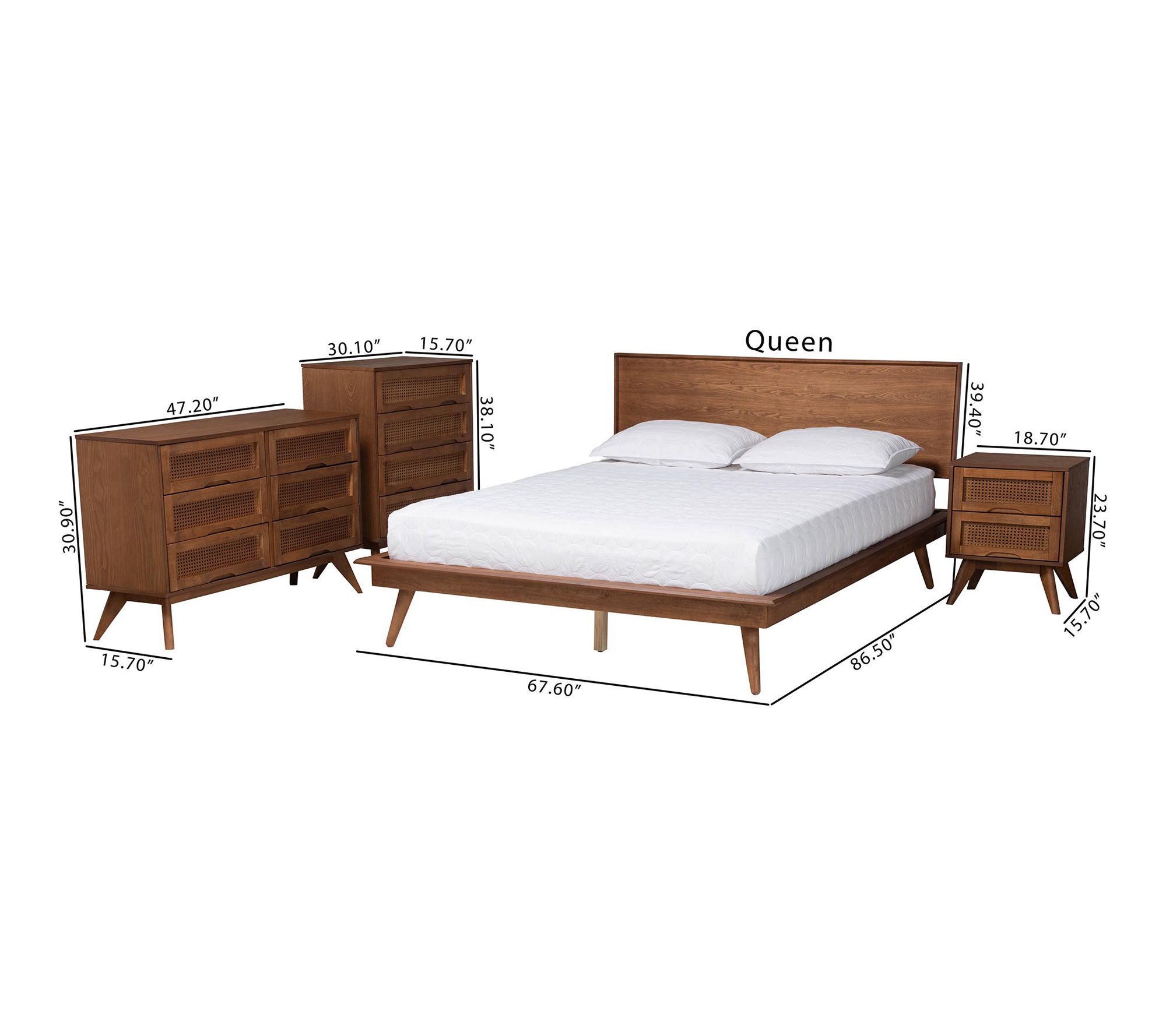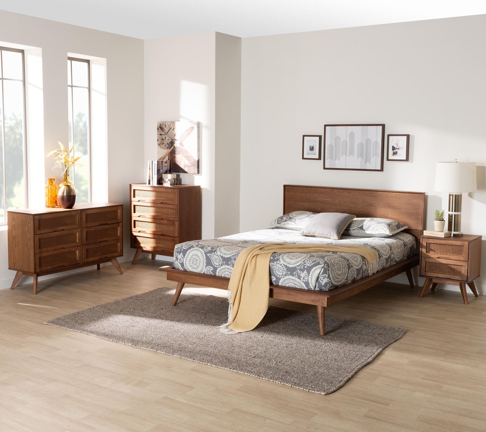 Create a welcoming retreat with this queen wood and rattan bed set, where mid-century style meets everyday function. Thoughtfully crafted to include a bed, chest, dresser, and nightstand, this set brings the warmth of a medium wood finish alongside woven rattan accents. Plentiful storage and practical features offer effortless organization and comfort for your nightly unwind. From Baxton Studio.