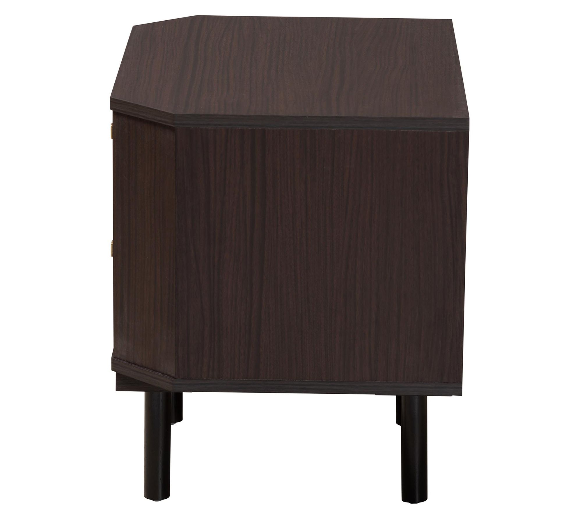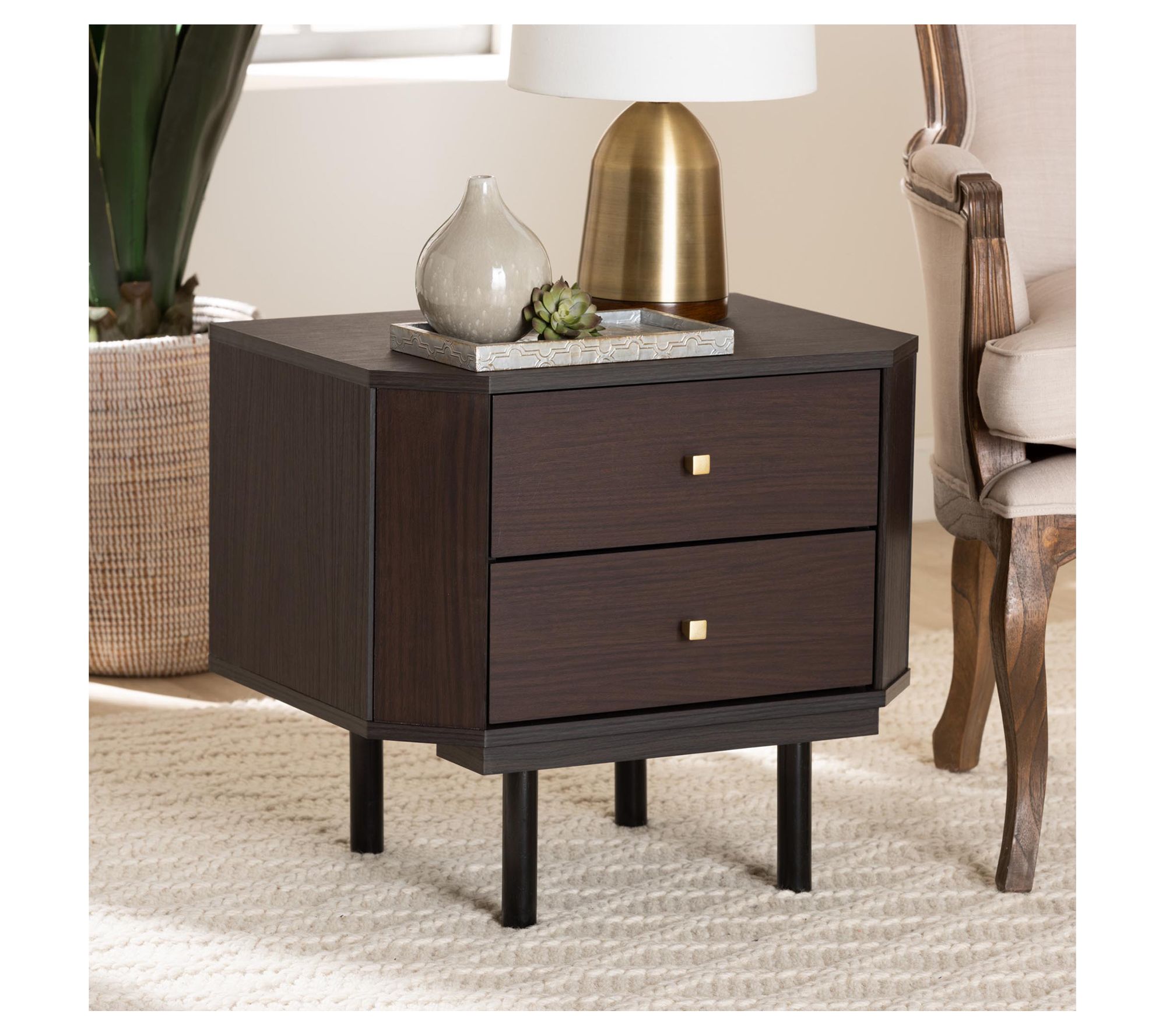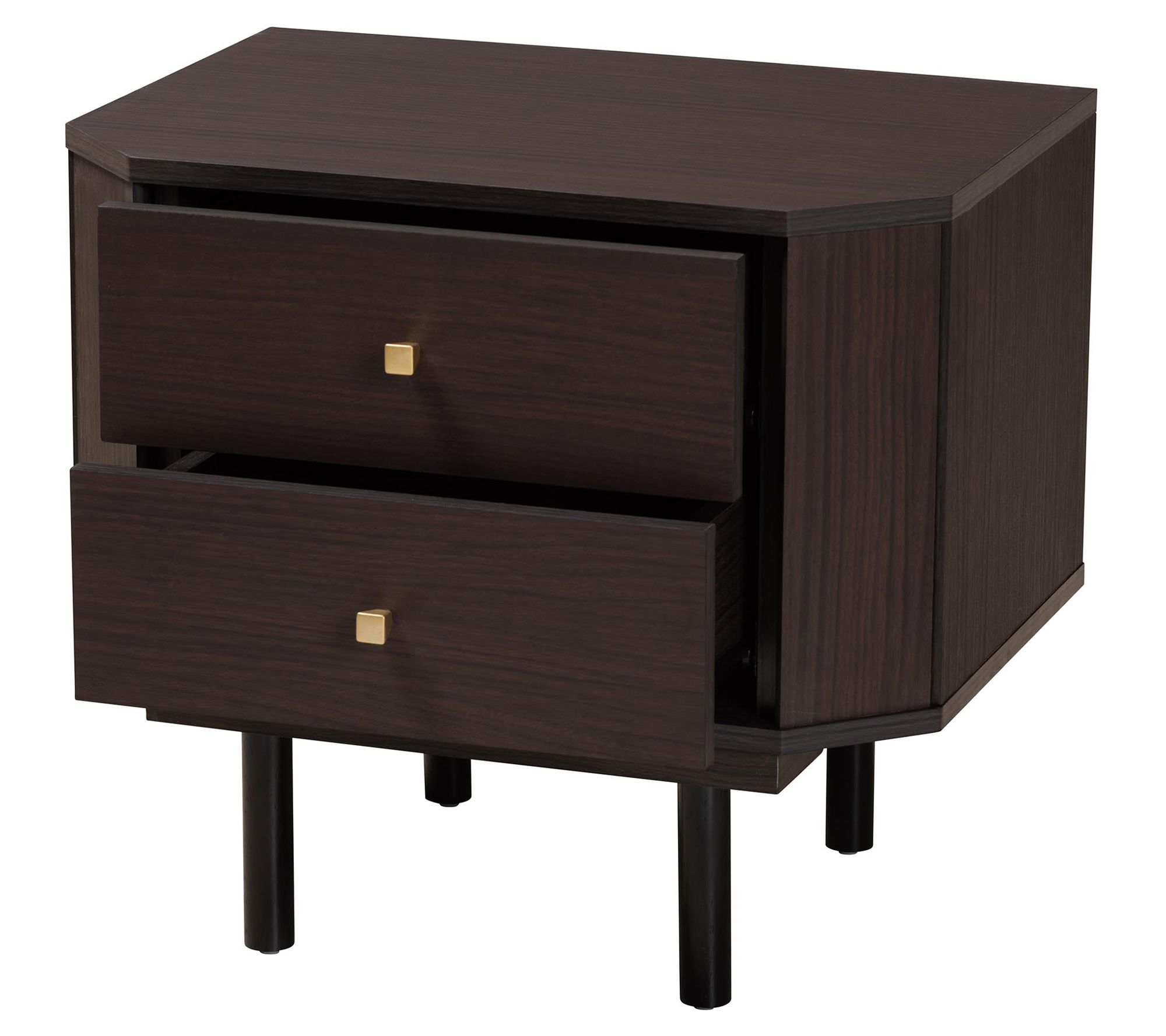 Introduce modern craftsmanship to your living space with the Norwood end table. The striking piece combines sturdy construction with charming, tapered drawer knobs and rounded legs, creating an unforgettable fixture in any room. From Baxton Studio.