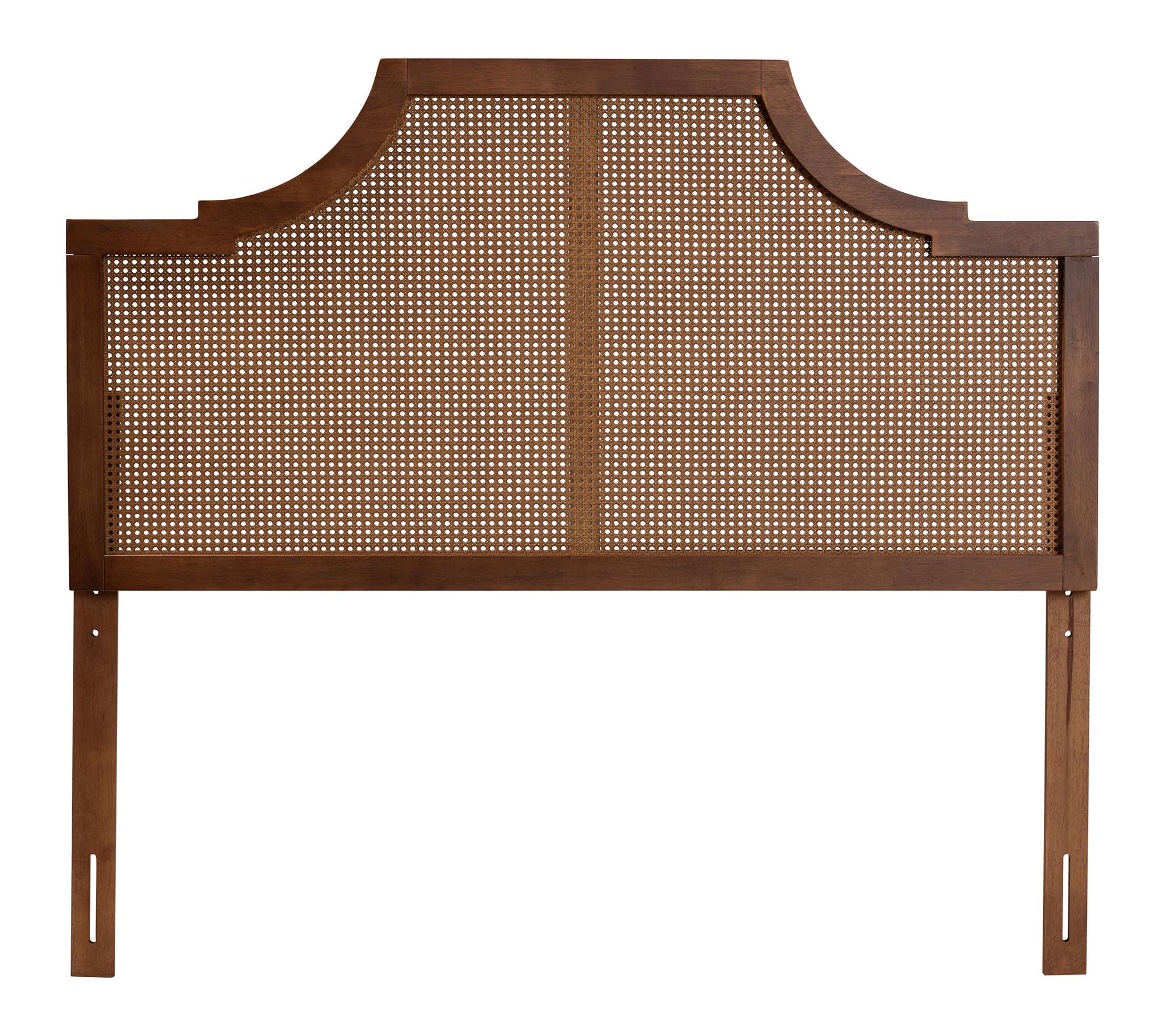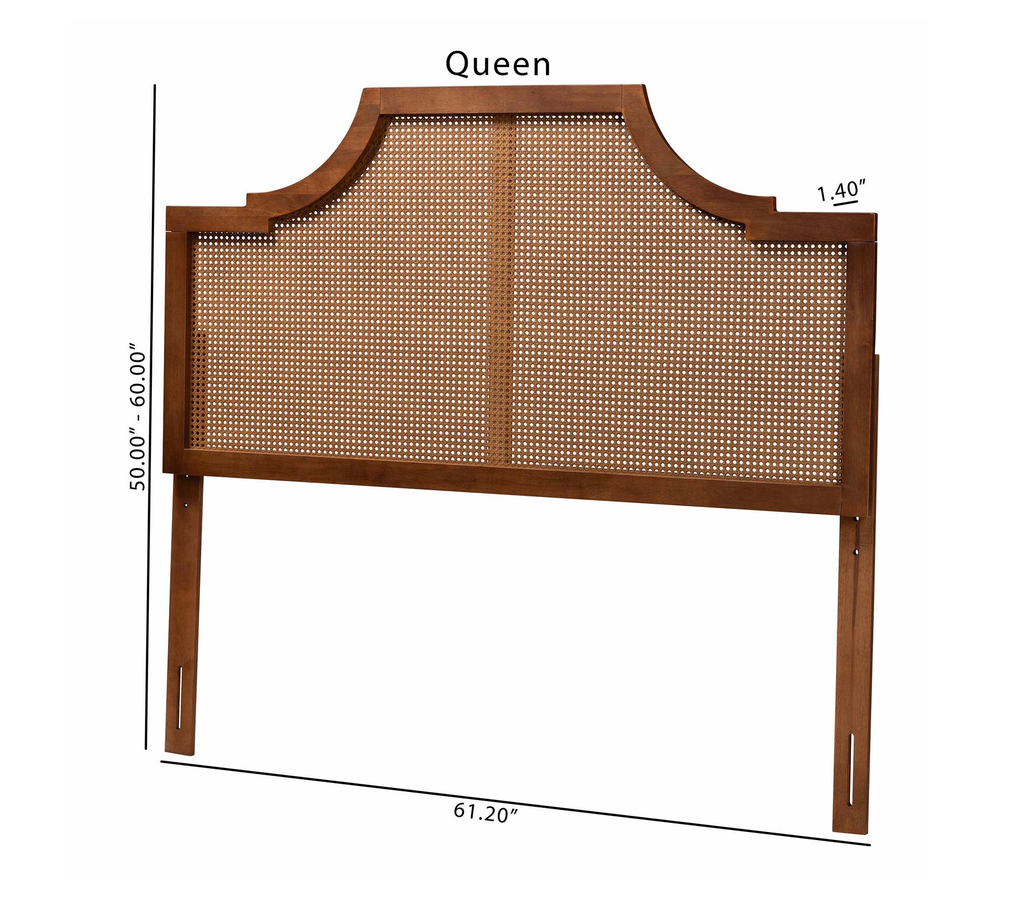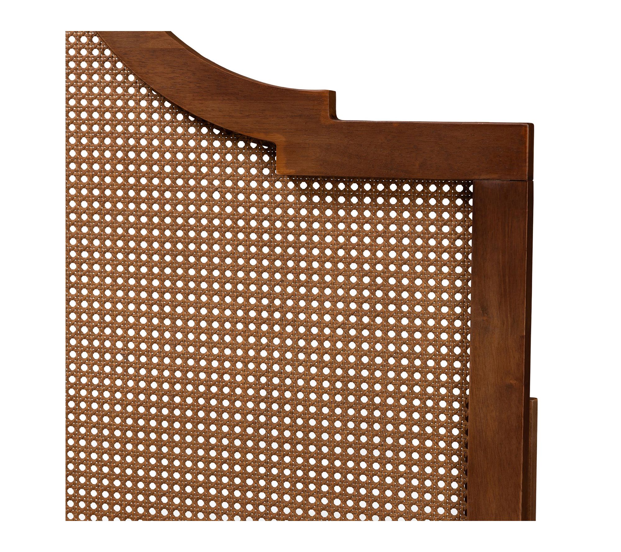 Bring a touch of mid-century charm to your bedroom with this queen headboard, combining a sturdy ash walnut wood frame with woven rattan detailing. The arched silhouette features striking lines and smooth curves, offering rich texture and five customizable height settings for a tailored look. From Baxton Studio.