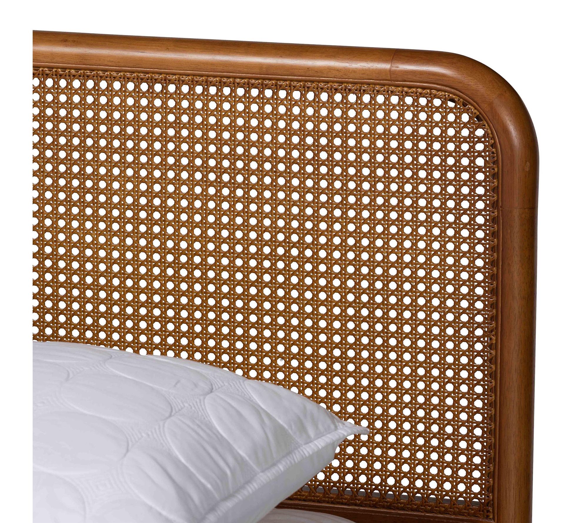 Create a relaxing bedroom retreat with this queen platform bed, featuring mid-century inspiration in its rounded silhouette and woven rattan headboard. Padded with foam and upholstered in soft velvet, it offers comfort and style for restful nights, while the sturdy wood frame and sleek legs anchor your space with timeless appeal. From Baxton Studio.