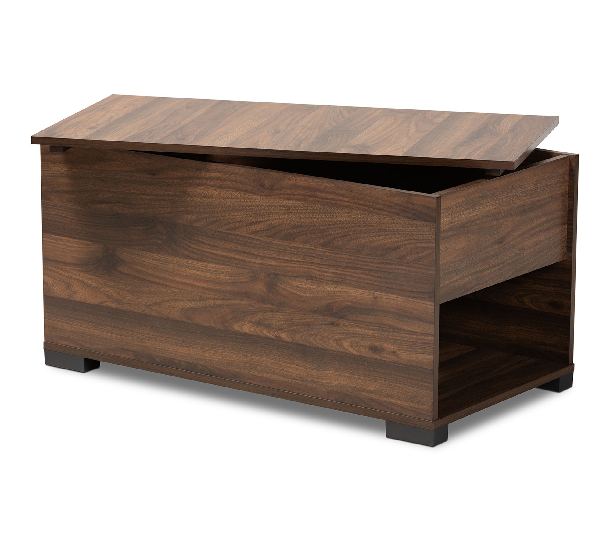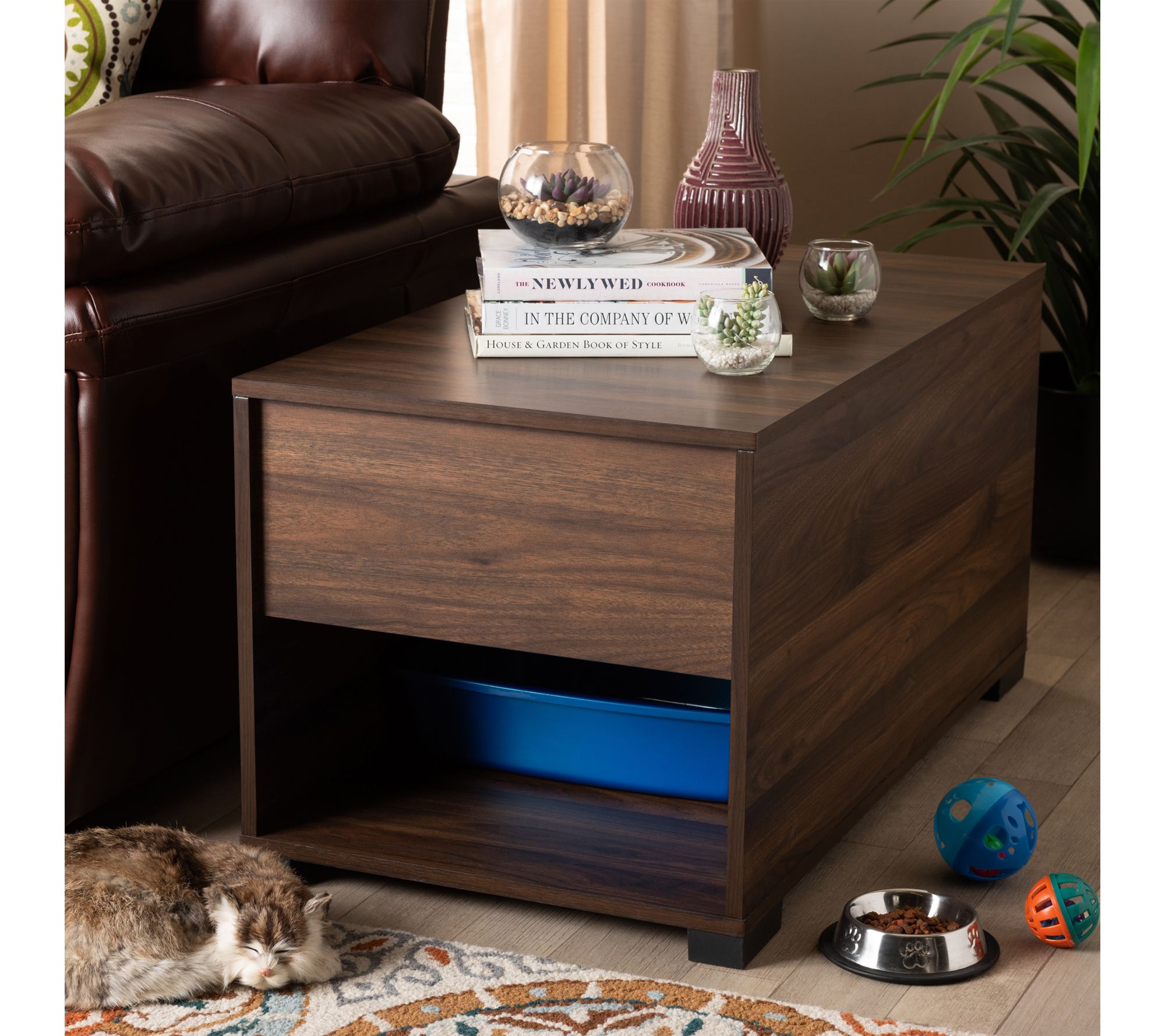 Every feline deserves a cozy retreat, and this cat house brings privacy and function together beautifully. The spacious interior neatly hides a litter box while a handy shelf keeps supplies organized, and an easy-access side entrance ensures comfort for your pet. The walnut brown finish blends with any decor, making this a stylish solution for cat owners. From Baxton Studio.
